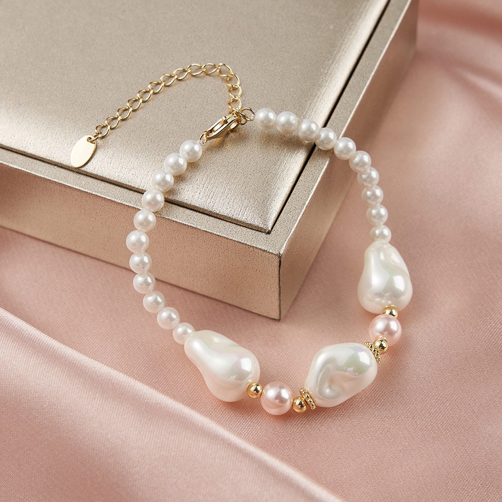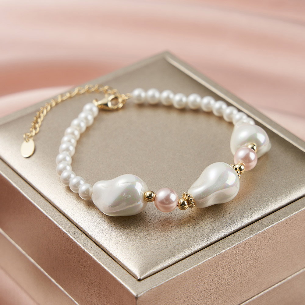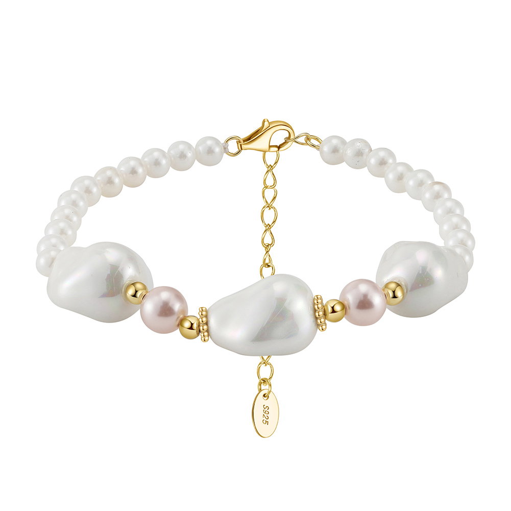 Aceasta bratara eleganta, realizata din argint 925 placat cu aur de 14K, este o piesa deosebita ce aduce un strop de rafinament in orice tinuta. Perlele prelucrate din cochilii de scoici stralucesc delicat, creand o armonie perfecta intre lumina aurului si stralucirea naturala a perlelor. Fiecare detaliu este gandit cu atentie, oferind o experienta de purtare confortabila si un aspect de durata. Bratara devine astfel un accesoriu ideal pentru momente speciale, aducand un aer de sofisticare si eleganta accesibila.