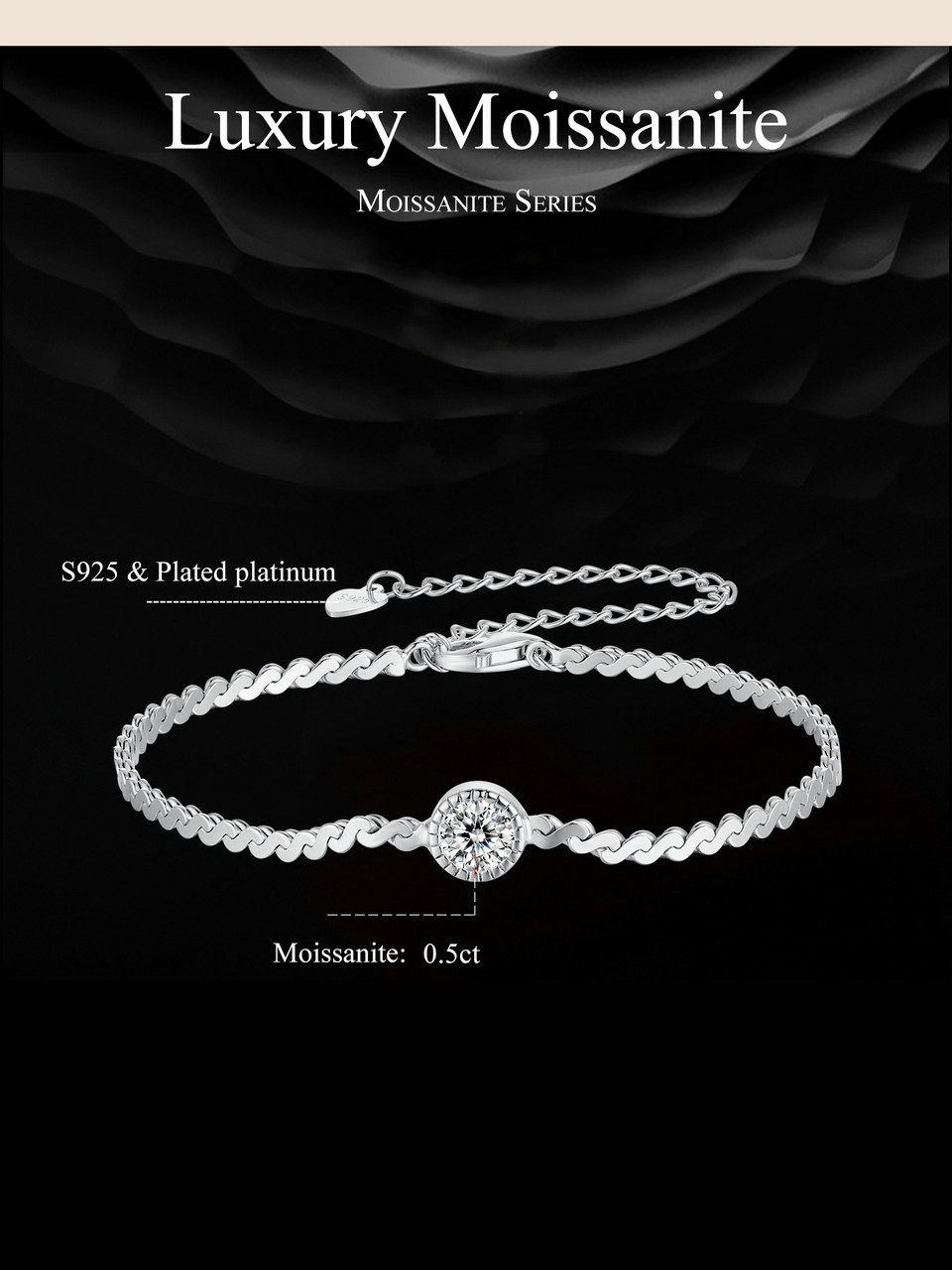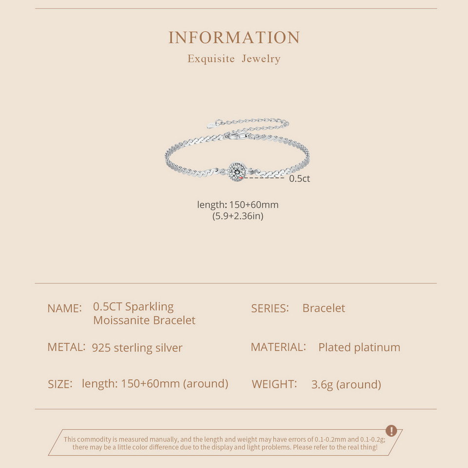 Dimensiuni: Lungime 150+60 mm, Piatra Moissanit 5,0 mm (0,5 ct), Greutate 3,6 grame