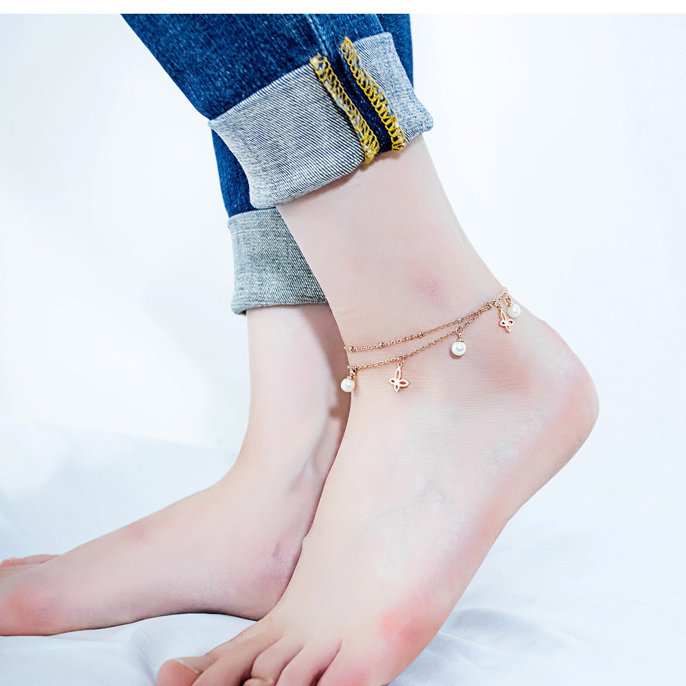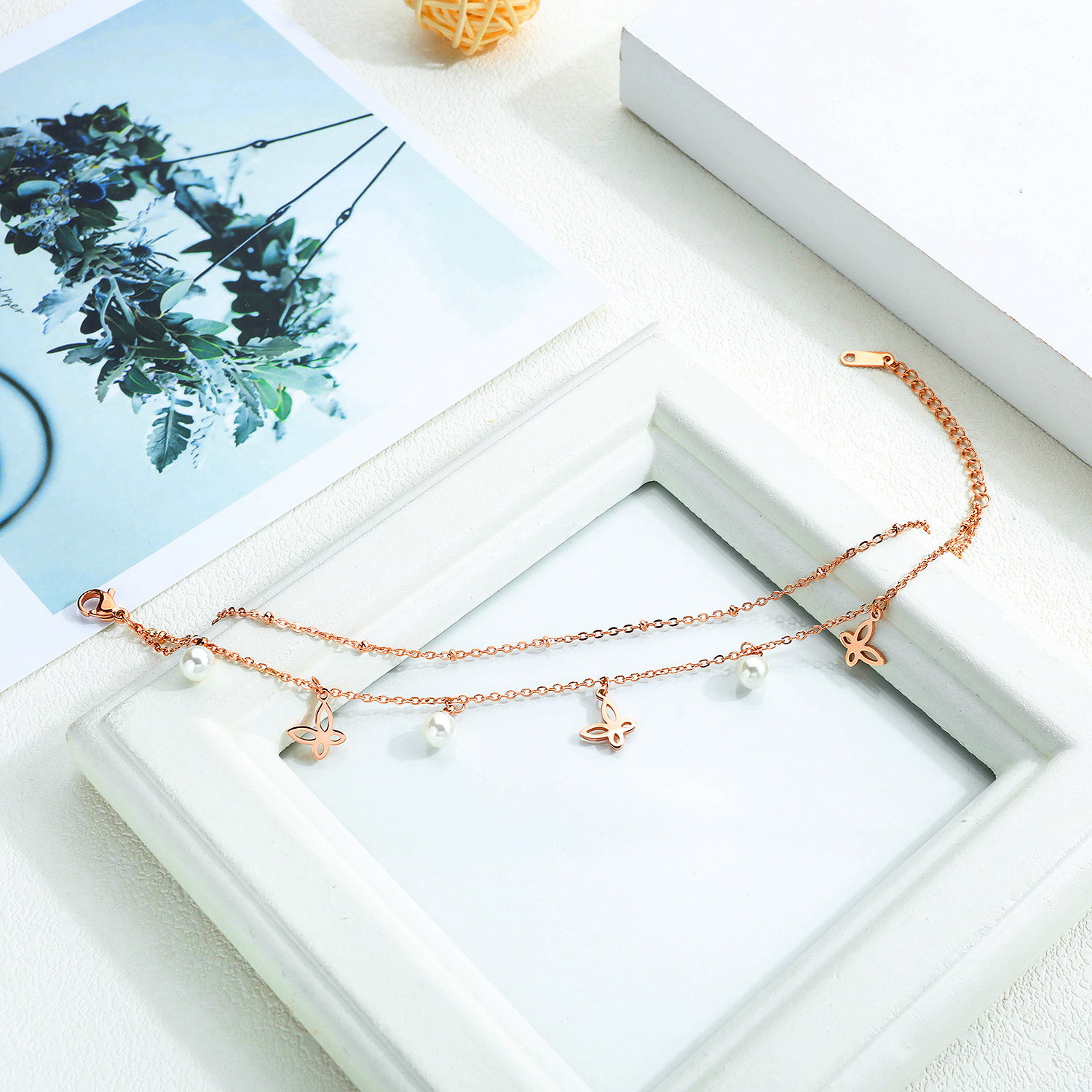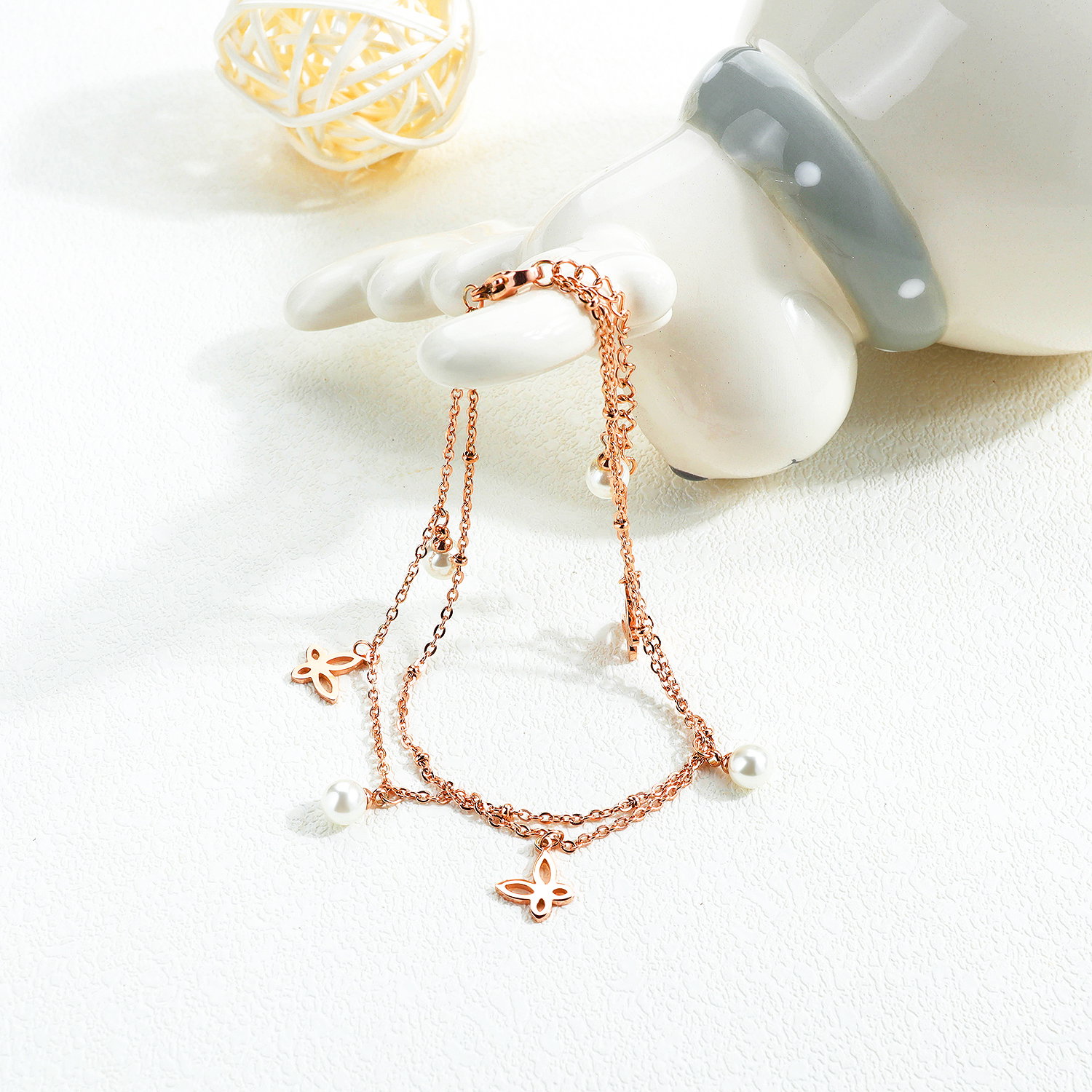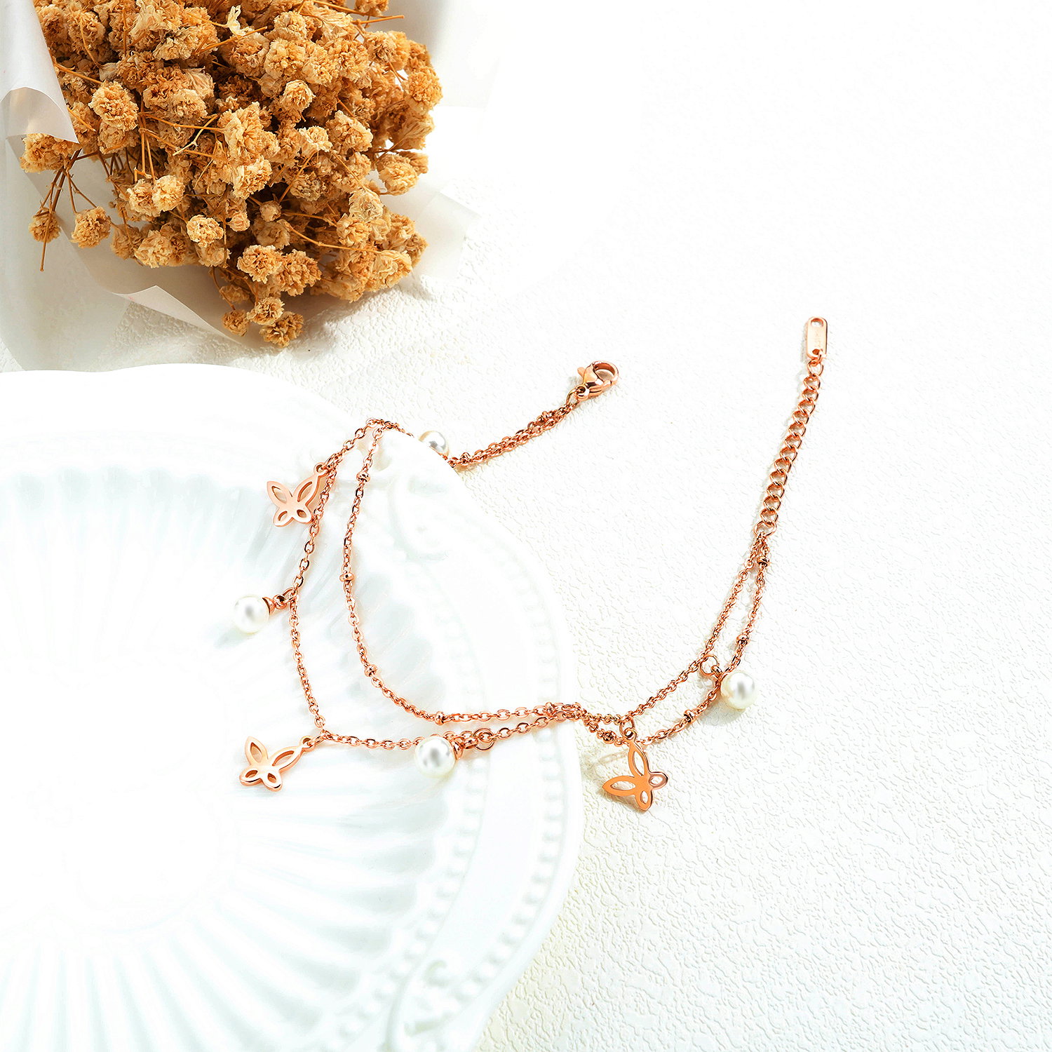 Bratara glezna inox cu fluturi si perlute. Dimensiuni: 21 + 4 cm. Culoare: Auriu. Material: Inox, Perle artificiale. Ambalaj: Saculet bijuterii (gratuit). Greutate: 4 grame.