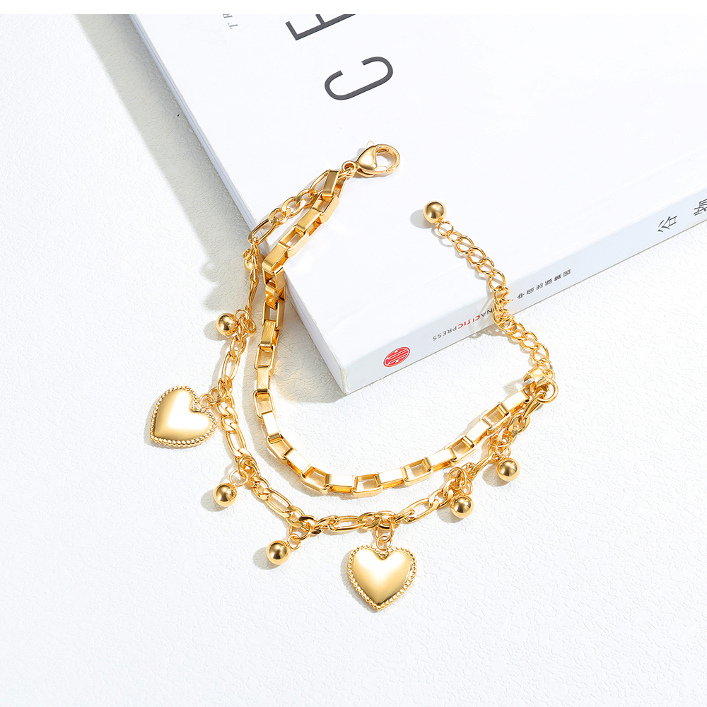 Bratara din inox aurie, placata cu aur tehnologic, cu design modern si detalii feminine: charm-uri in forma de inimioare si bilute decorative. Lantul robust, dar elegant, ofera o stralucire intensa si un aspect rafinat. Inchiderea reglabila permite ajustarea comoda pe incheietura. Un accesoriu care emana caldura si stil, perfect pentru femeile care iubesc bijuteriile aurii pline de farmec.