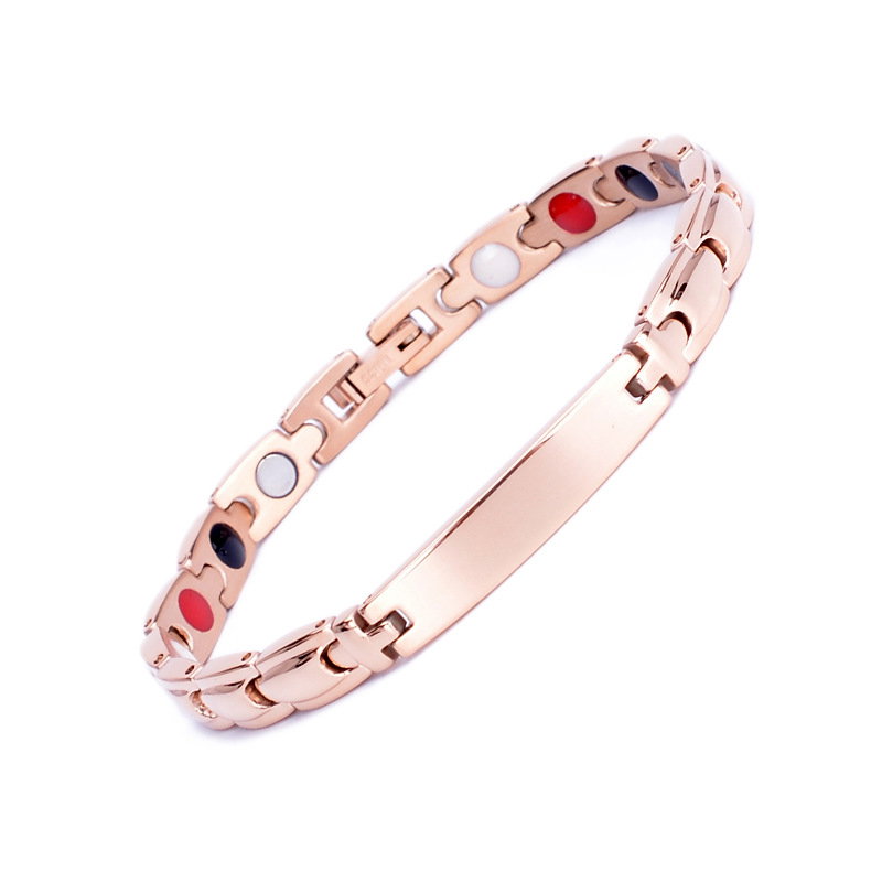 Bratara inox aurie (aur roz) cu magneti, turmalina, germaniu si anioni. Dimensiuni: Lungime 19,5 cm, Latime 6 mm. Această brățara magnetică elegantă poate fi un cadou perfect pentru tine sau pentru persoana specială din viața ta. Fabricată din oțel inoxidabil, un metal hipoalergenic și rezistent la coroziune, această brățară va fi una durabilă. Brățară utilizează patru dintre cele mai comune pietre terapeutice, care acționează în armonie pentru a ajuta la reducerea durerilor neuropatice, a oboselii și a tensiunii musculare, îmbunătățirea circulației, restabilirea echilibrului și a bunăstării purtătorului și pentru a sprijini creșterea energiei și a echilibrului: