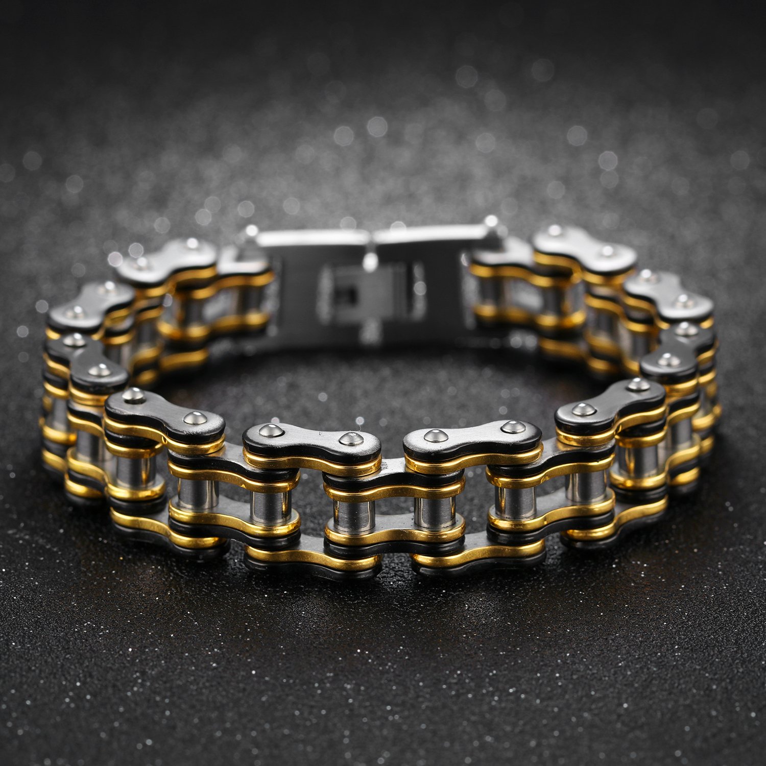 Bratara inox cu insertii aurii tip lant moto – Forta si rafinament masculin. Dimensiuni: Lungime 20,5 cm, Latime 15 mm. Culoare: Auriu. Materiale: Inox.