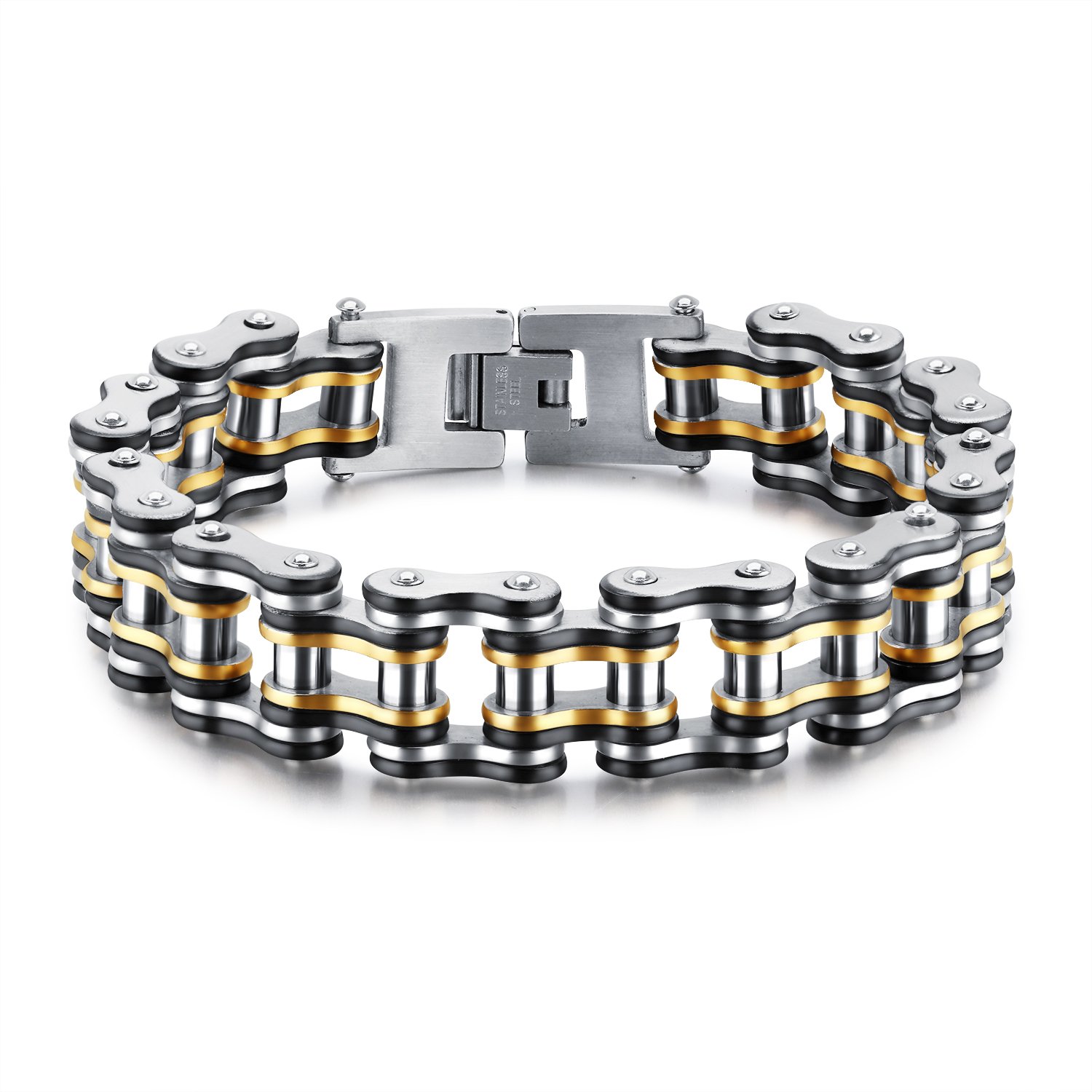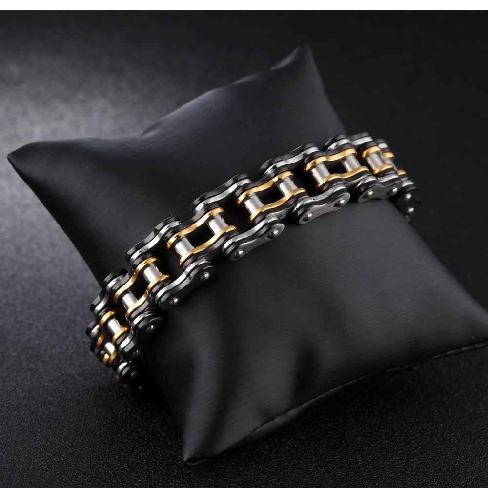 Bratara inox cu insertii aurii tip lant moto – Forta si rafinament masculin