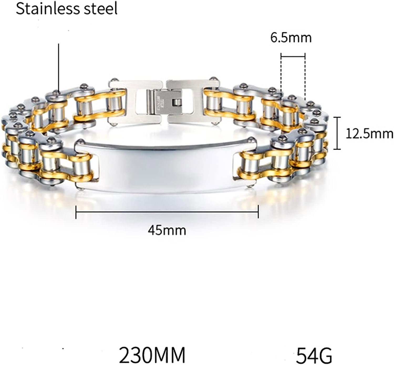 Bratara inox cu lant argintiu de motocicleta. Dimensiuni: Lungime 23 cm, Latime 12,5 mm, Grosime 6,5 mm.