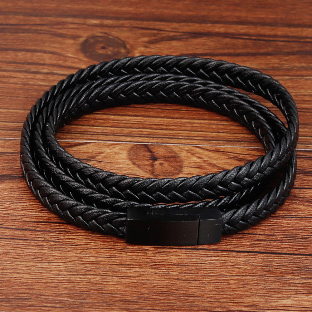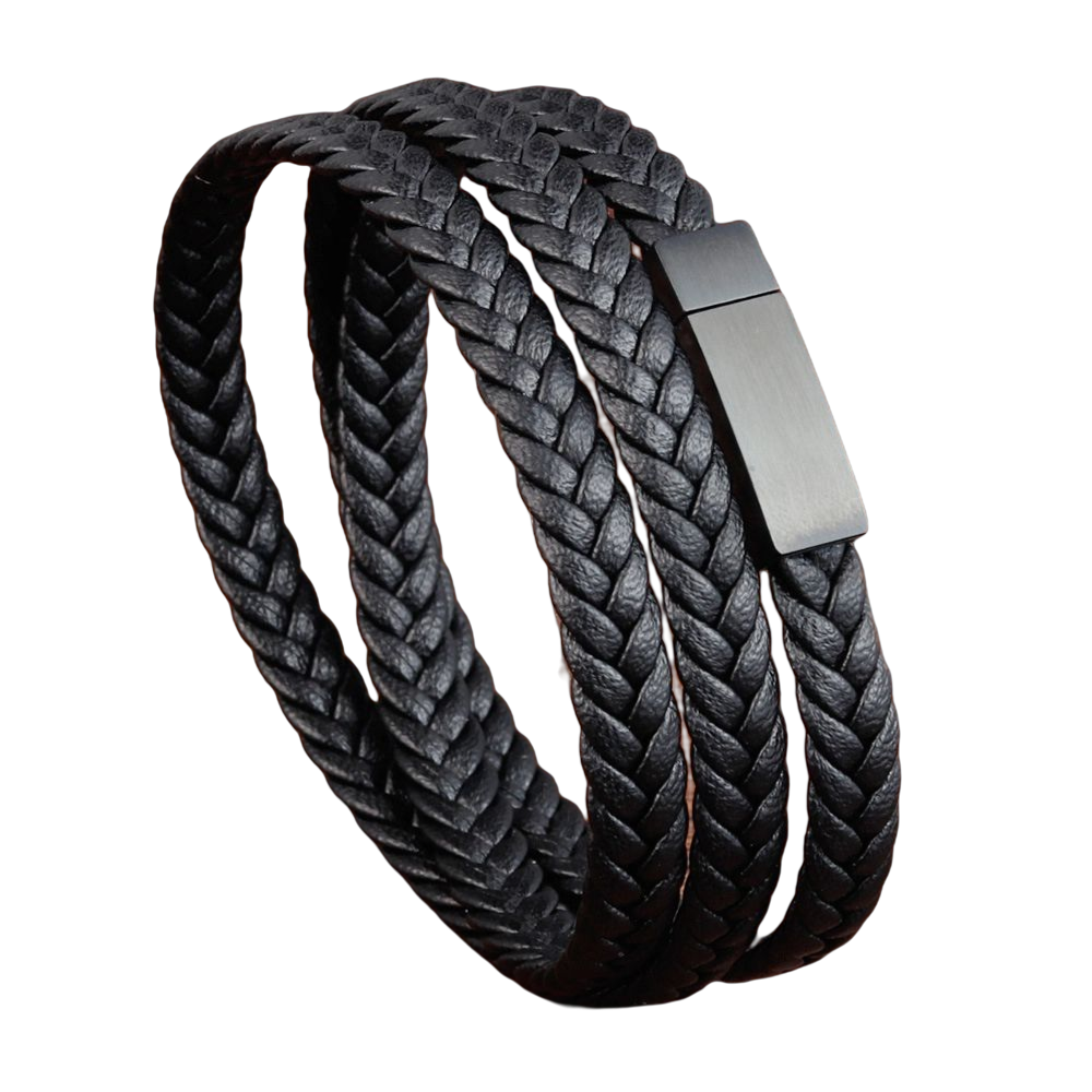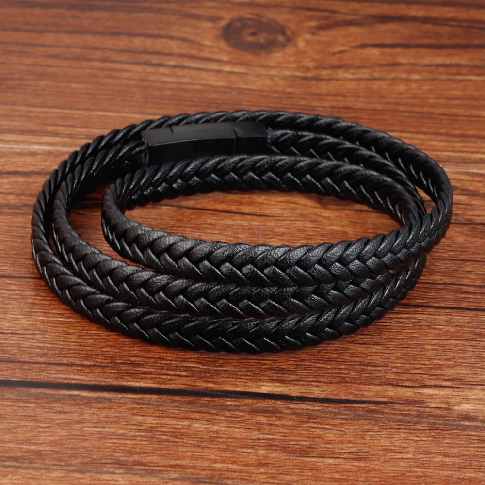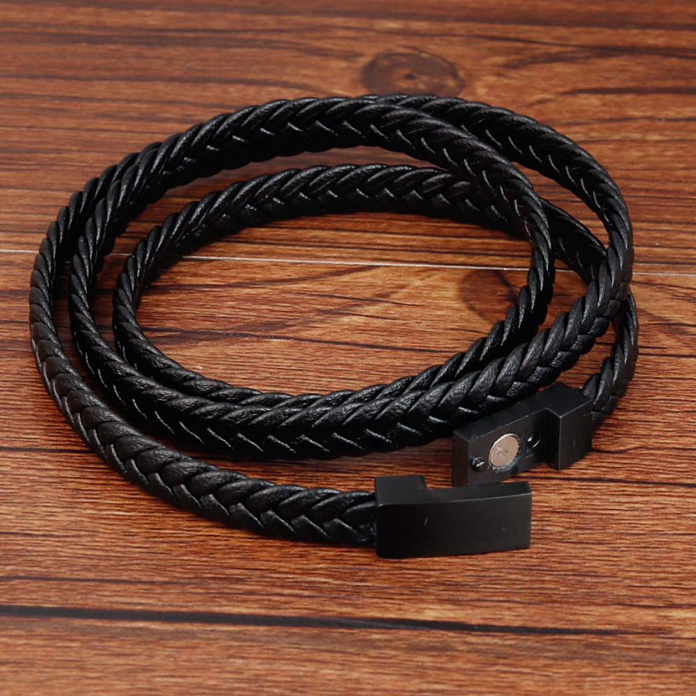 Bratara tripla din piele naturala de bovine impletita cu inchizatoare din inox. Poate fi folosita si ca snur pentru pandantive. Lungime bratara 21 cm (echivalent 63 cm ca snur) sau Lungime 23 cm (echivalent 67 cm ca snur). Latime snur: 5 mm. Material: Piele naturala de bovine si inox. Sistem inchidere dublu: magnetic si mecanic.