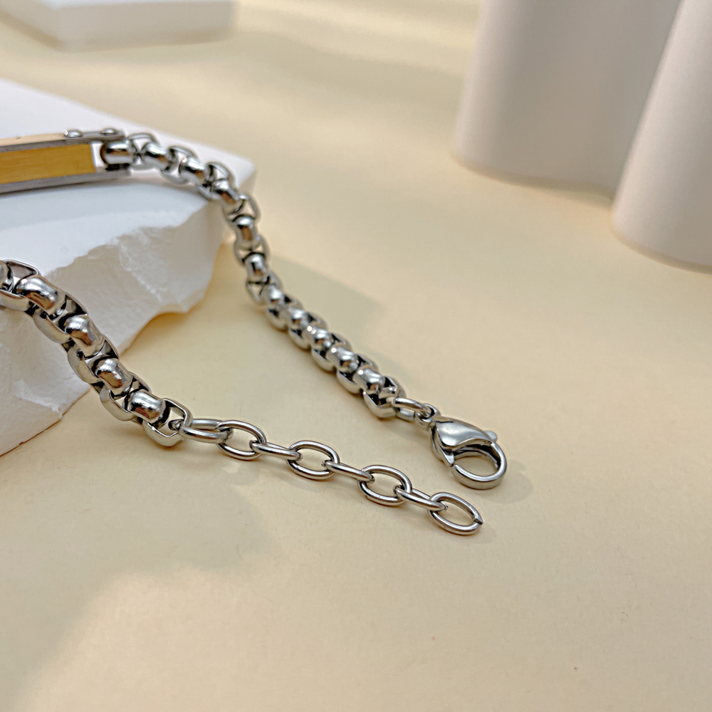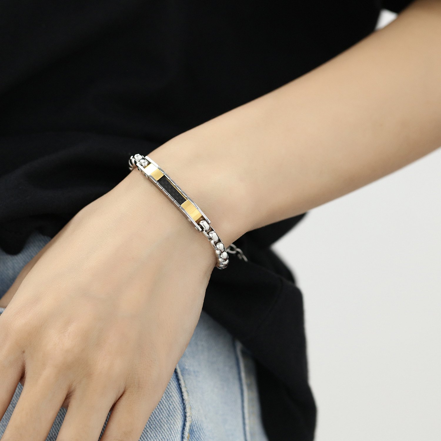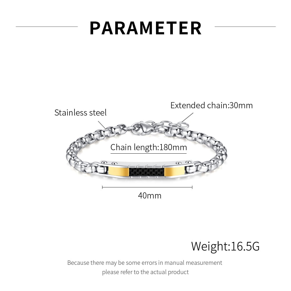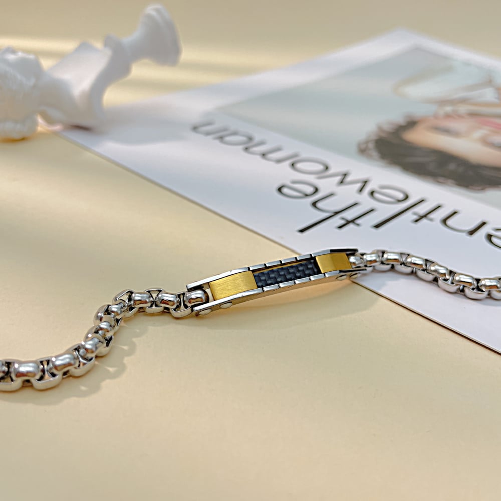 Bratara din otel inoxidabil de inalta calitate, decorata cu accente aurii si insertie de fibra de carbon neagra in centru, ce adauga un contrast modern si sofisticat. Designul robust si lantul solid o transforma intr-un accesoriu perfect pentru cei care apreciaza rafinamentul contemporan. Sistemul reglabil asigura confort si potrivire ideala. O bratara care imbina eleganta cu forta, ideala pentru a completa o tinuta business sau casual.