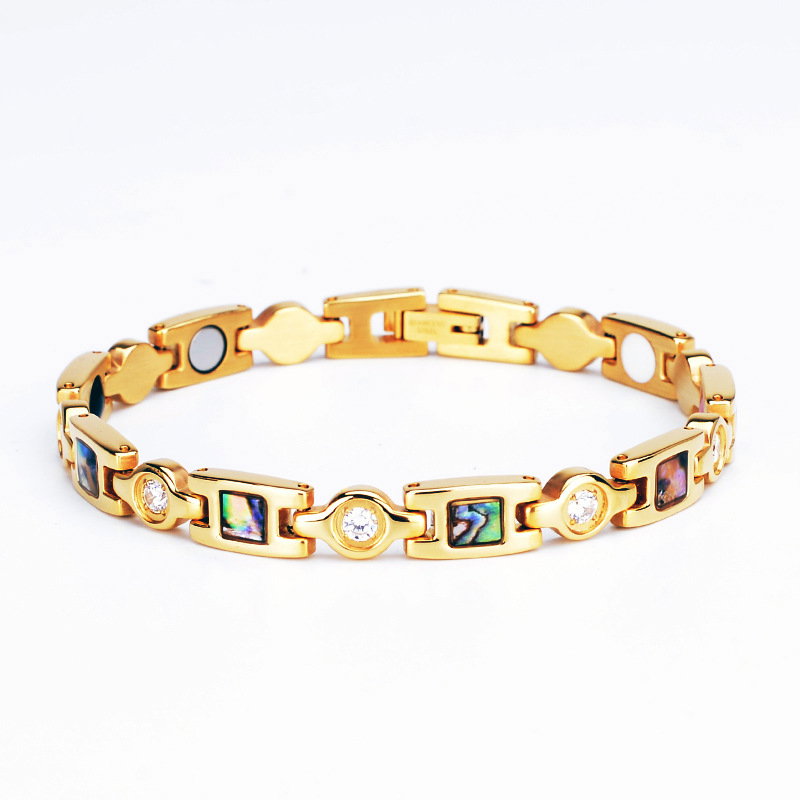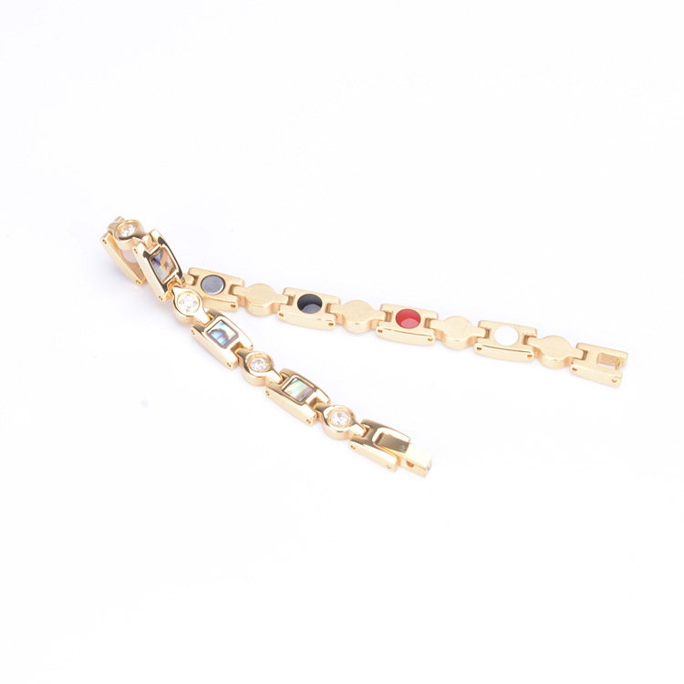 Bratara magnetica din inox cu abalone si zirconii. Dimensiuni: 195 x 6 x 2 cm. Lungime: 19,5 cm. Culoare:Auriu. Material: Inox. Ambalaj: Sacutel bijuterii. Această brățara magnetică elegantă poate fi un cadou perfect pentru tine sau pentru persoana specială din viața ta. Fabricată din oțel inoxidabil, un metal hipoalergenic și rezistent la coroziune, această brățară va fi una durabilă. Brățară utilizează patru dintre cele mai comune pietre terapeutice, care acționează în armonie pentru a ajuta la reducerea durerilor neuropatice, a oboselii și a tensiunii musculare, îmbunătățirea circulației, restabilirea echilibrului și a bunăstării purtătorului și pentru a sprijini creșterea energiei și a echilibrului: • Magnet de neodim: Aceștia sunt cei mai puternici magneți disponibili, cu beneficii terapeutice ca îmbunătățirea circulației sângelui si a oxigerarii și reducerea durerilor articulare, precum cele cauzate de artrită. • Anion (piatra albă): Prezența anionilor, când sunt concentrați, sprijină producția de serotonină, ceea ce poate ajuta la reducerea stresului și creșterea nivelului de energie. • Infraroșu (piatra roșie - turmalina): Emiterea energiei infraroșii ajută la ridicarea ușoară a temperaturii suprafeței corpului, stimulând funcțiile naturale de vindecare (sistemul imunitar) si de detoxifiere și ameliorând durerile cronice. • Germaniu (piatra neagră): Germaniul emite ioni negativi si combate ionii pozitivi emisi de aparatele electrocasnice, fapt ce poate ajuta la cresterea nivelului de serotonina si implicit la instalarea starii de bine, la intarirea sistemului imunitar si la reducerea oboselii. Brățara ajuta la ameliorarea unor afecțiuni precum depresia, durerile articulare, stresul și oboseala, oferind energie și vitalitate. Înainte de a începe terapia cu brățara magnetică, este important să consultați un specialist medical, mai ales dacă aveti dispozitive medicale implantate sau afecțiuni specifice, cum ar fi epilepsia. Bratara nu este recomandata in timpul sarcinii si alaptarii! Această brățară va poate aduce o serie de beneficii pentru bunăstarea dvs. generală, însă consultarea cu un profesionist medical este întotdeauna recomandată înainte de a începe orice formă de terapie alternativă.