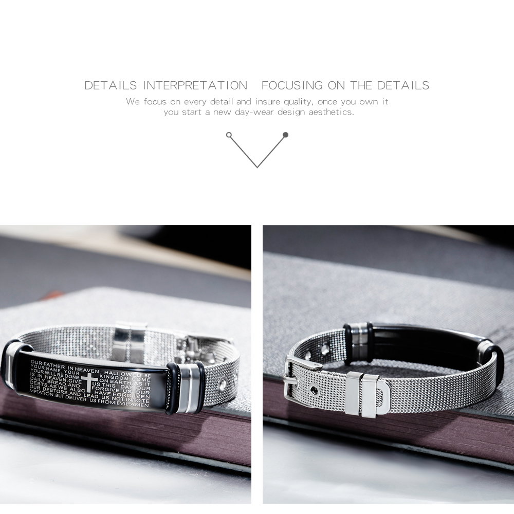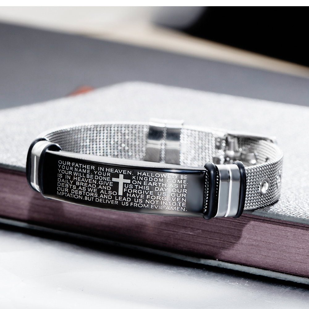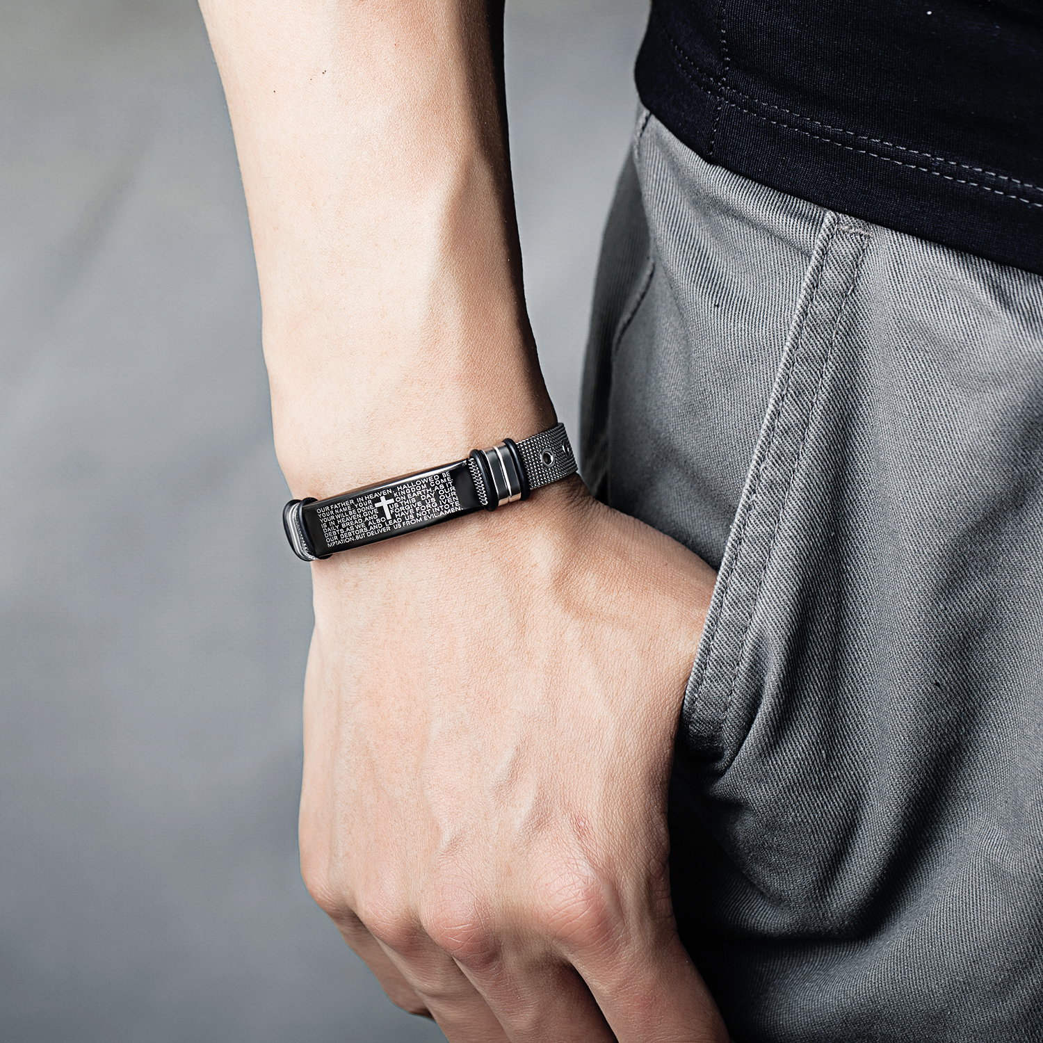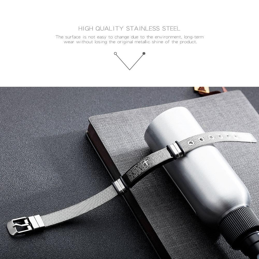 Bratara din otel inoxidabil cu placuta neagra si cruce decupata. Latime 10 mm. Lungime: 15-20 cm.