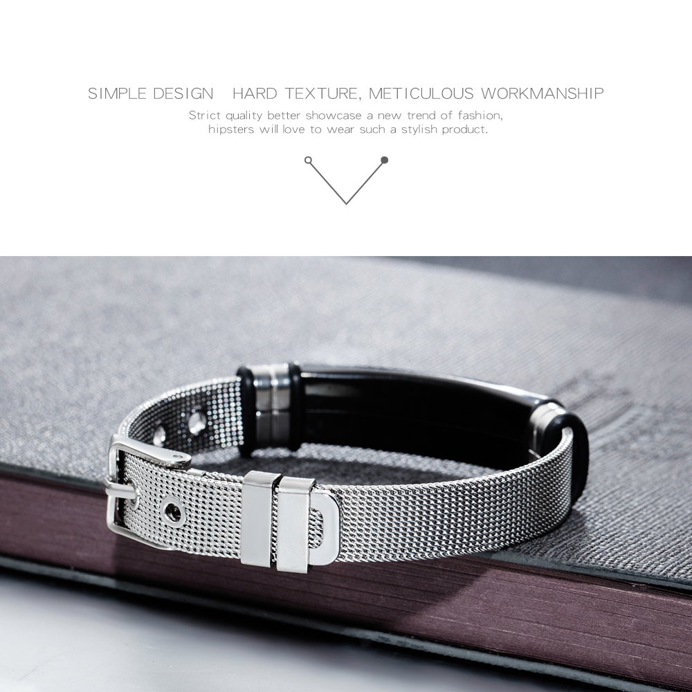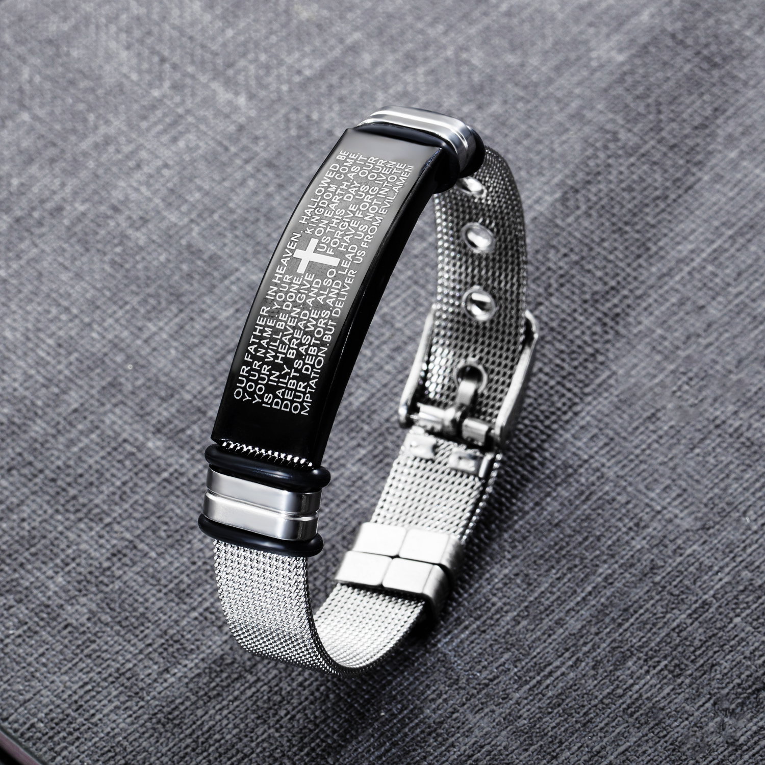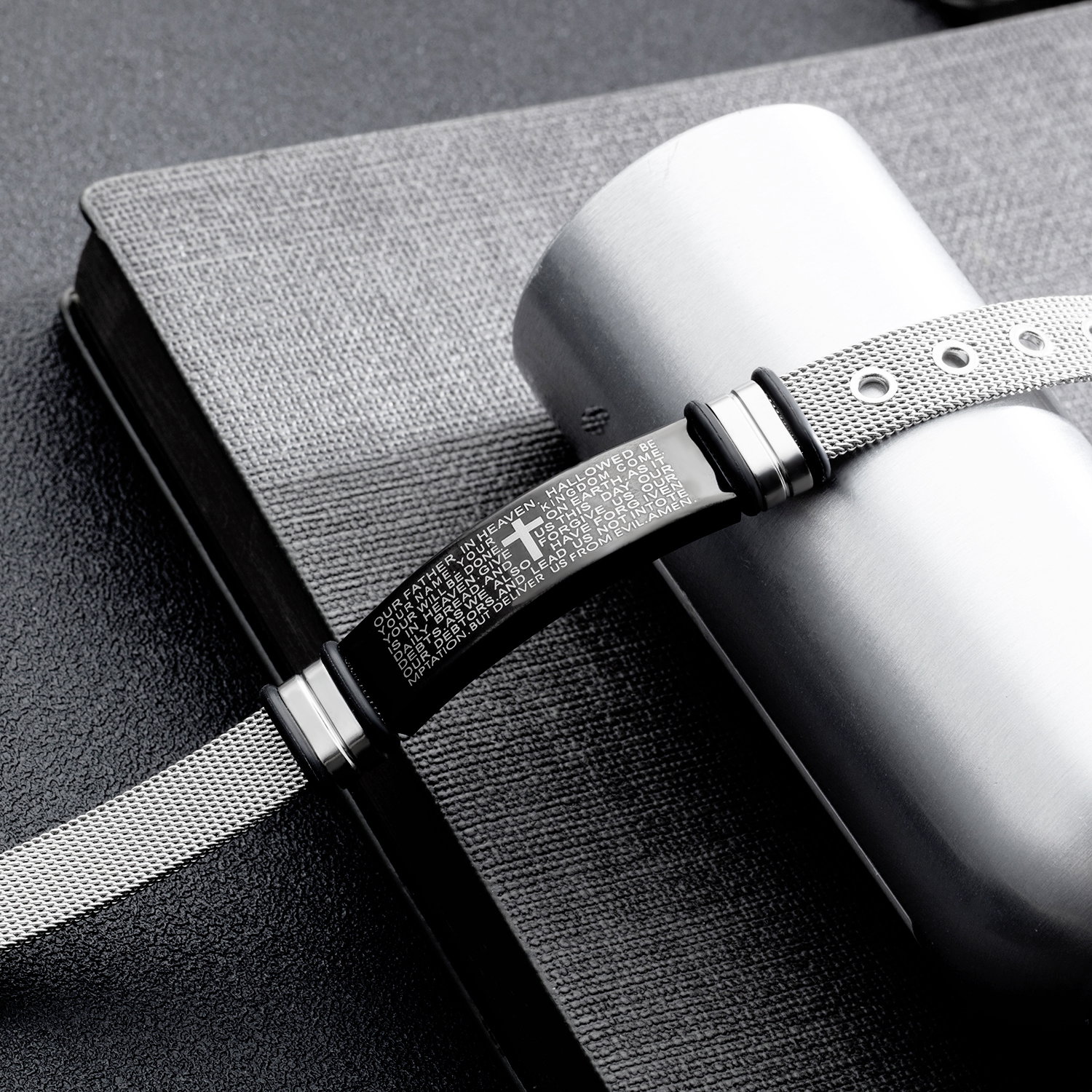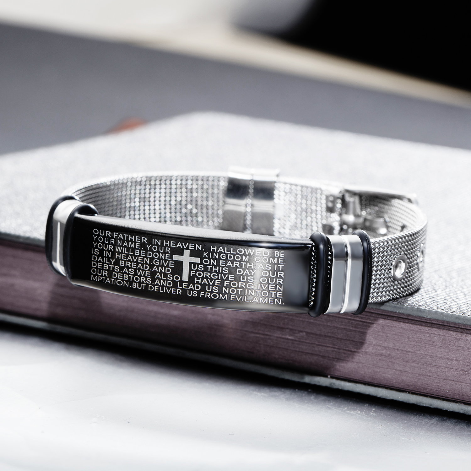 Bratara din otel inoxidabil cu placuta neagra si cruce decupata. Latime 10 mm. Lungime: 15-20 cm.