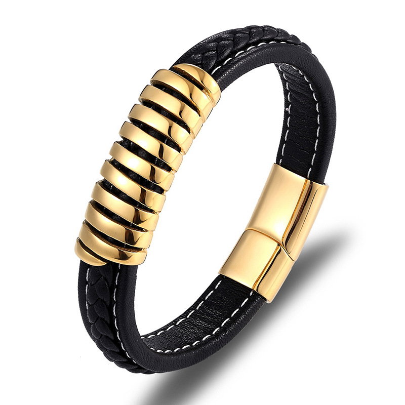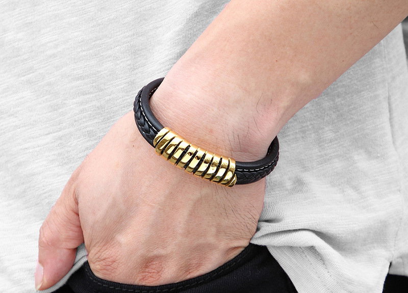Bratara neagra din piele naturala si inox auriu