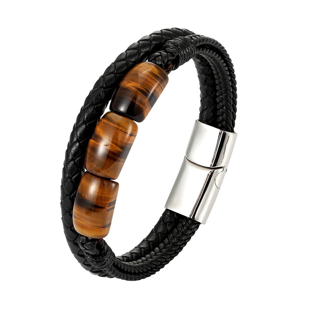 Bratara piele naturala de bovine cu pietre Ochi de Tigru si inchizatoare din inox. Latime bratara 1,2 cm. Dimensiuni pietre 17 x 10 mm. Sistem inchidere dubla (magnetica si mecanica). Pietrele sunt fixate prin insirare.