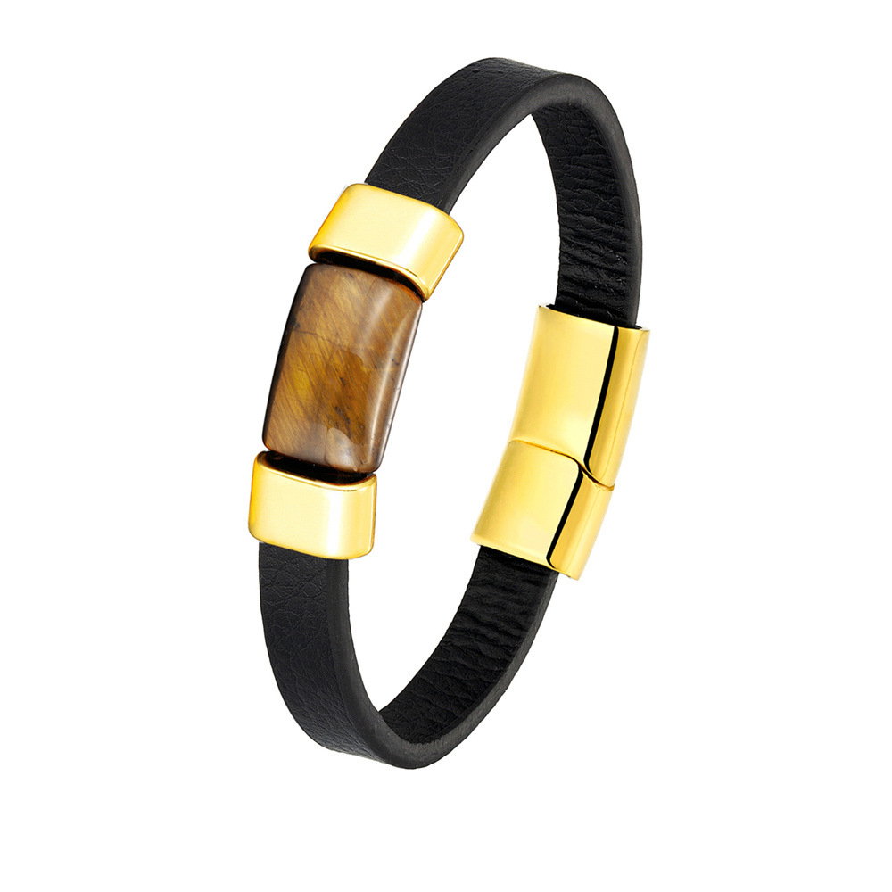 Bratara piele naturala de bovine cu piatra Ochi de Tigru si inchizatoare din inox auriu. Latime banda piele 1 cm. Dimensiuni piatra 18 x 13 mm. Sistem inchidere dubla (magnetica si mecanica). Piatra e fixata si prin insirare.