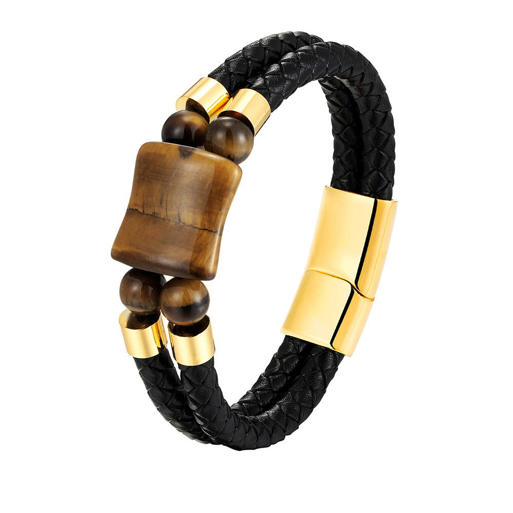 Bratara piele naturala de bovine cu pietre Ochi de Tigru si inchizatoare din inox auriu. Latime bratara 1,2 cm. Dimensiuni pietre 18 x 22 mm si 8 mm diametru. Sistem inchidere dubla (magnetica si mecanica). Pietrele sunt fixate prin insirare.