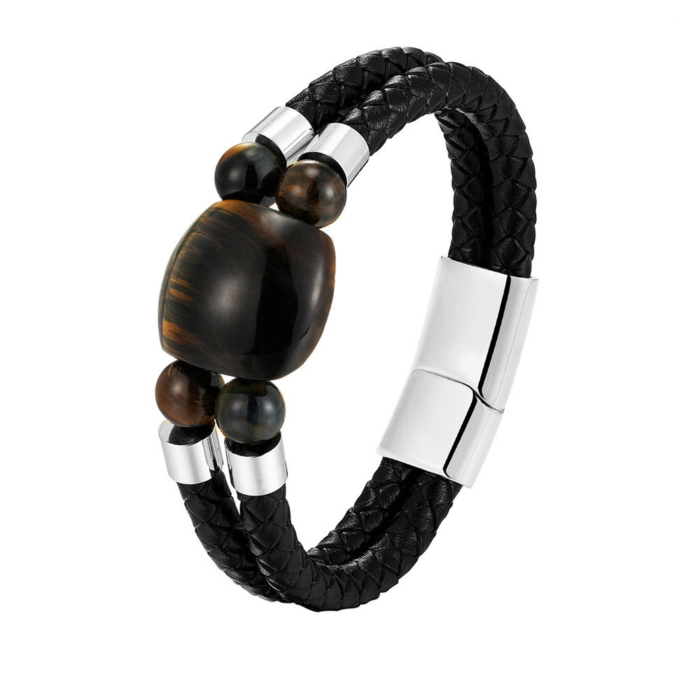 Bratara piele naturala de bovine cu pietre Ochi de Tigru si inchizatoare din inox. Latime bratara 1,2 cm. Dimensiuni pietre 18 x 22 mm si 8 mm diametru. Sistem inchidere dubla (magnetica si mecanica). Pietrele sunt fixate prin insirare.
