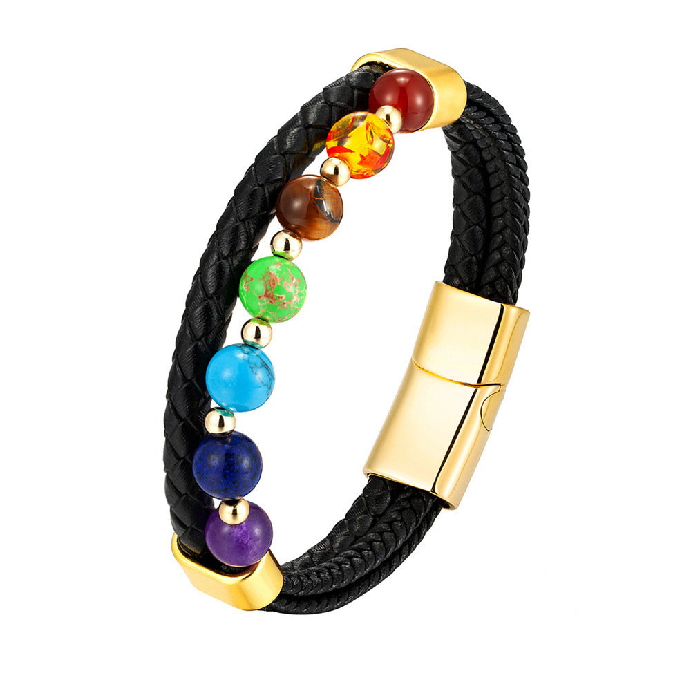 Bratara piele naturala cu pietre naturale si inchizatoare din inox auriu