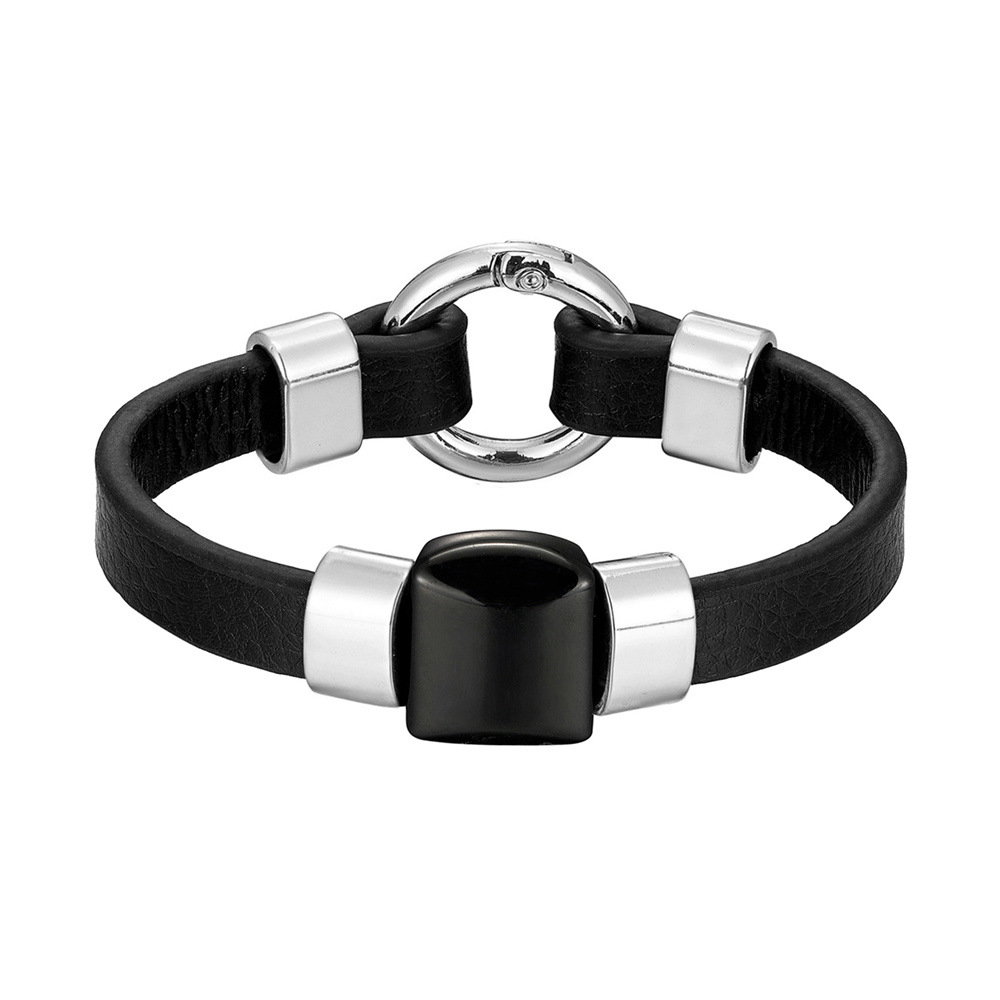 Bratara piele naturala de bovine cu piatra Onix si inchizatoare din inox. Latime banda piele 1 cm. Dimensiuni piatra 20 x 20 mm. Sistem inchidere mecanica (inel cu arc). Piatra e fixata prin insirare.