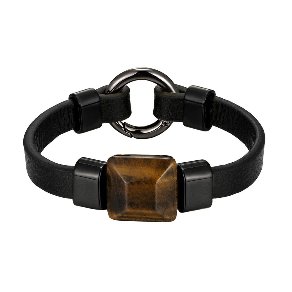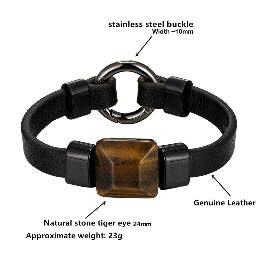 Bratara piele naturala de bovine cu piatra Ochi de Tigru si inchizatoare din inox negru. Latime banda piele 1 cm. Dimensiuni piatra 24 x 24 mm. Sistem inchidere mecanica (inel cu arc). Piatra e fixata prin insirare.