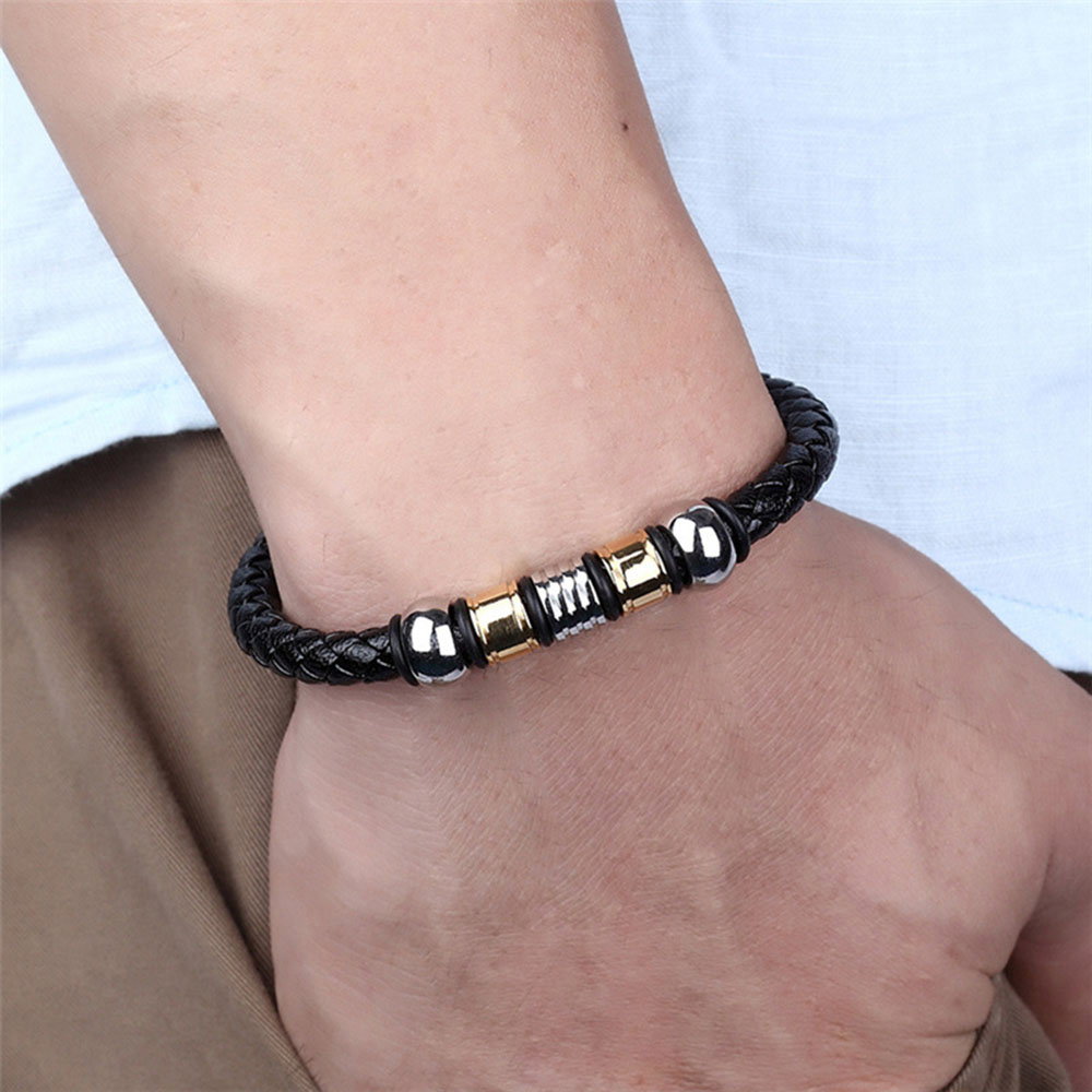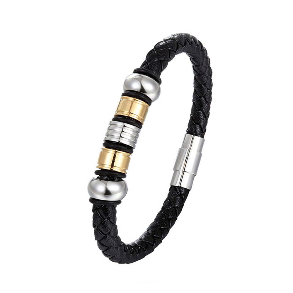 Bratara piele naturala impletita de bovine, cu elemente decorative si inchizatoare din inox negru si auriu. Latime: 1 cm, Grosime snur: 6 mm. Sistem inchidere magnetica.
