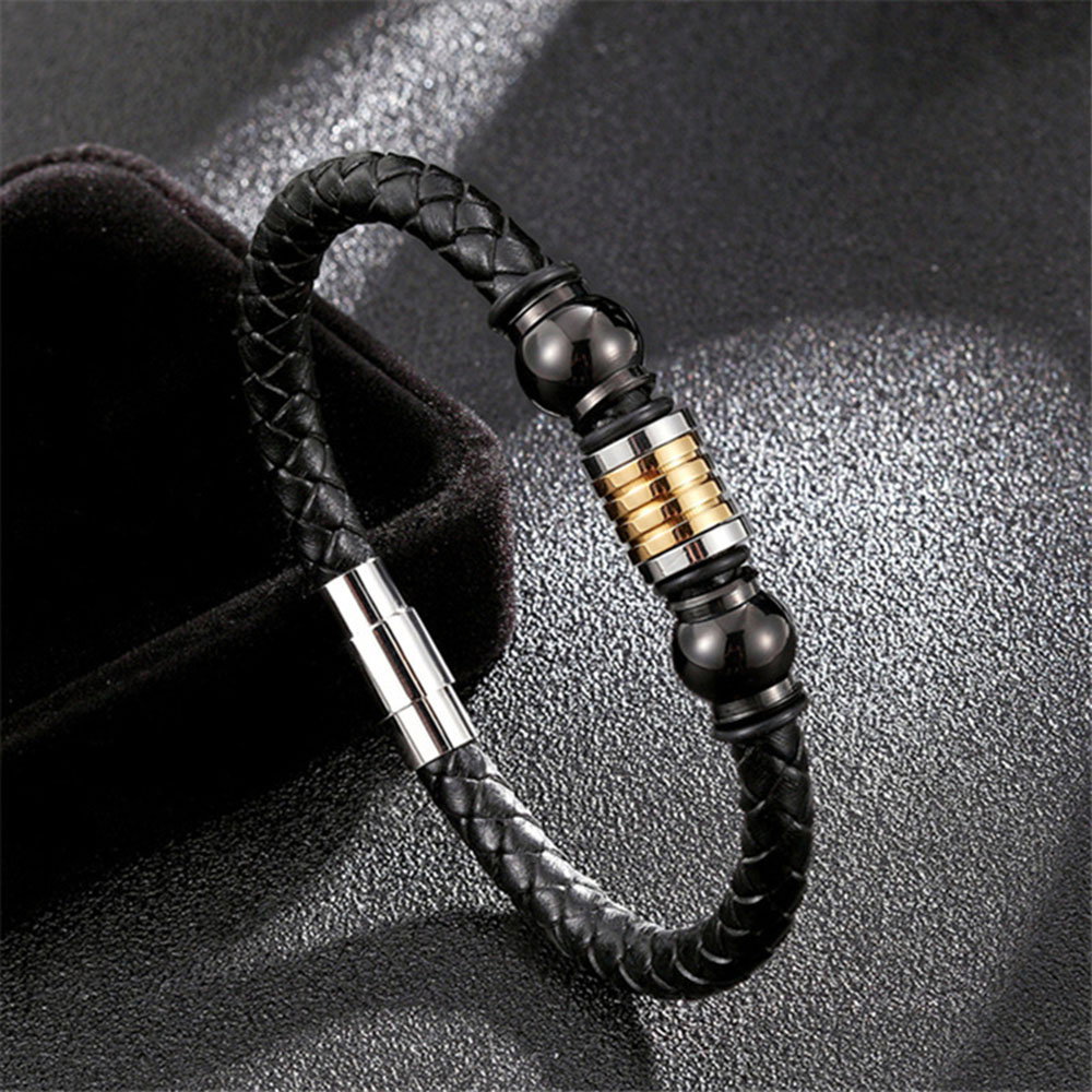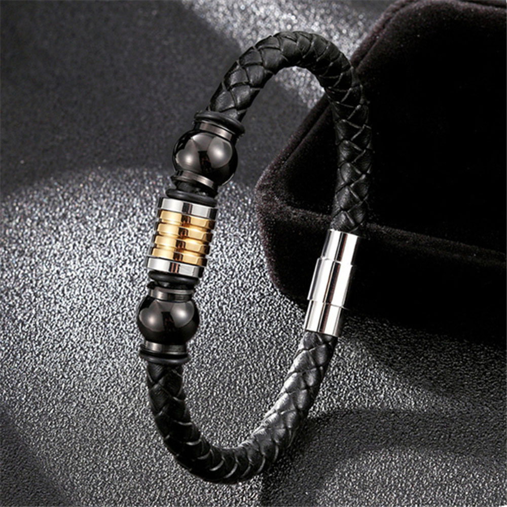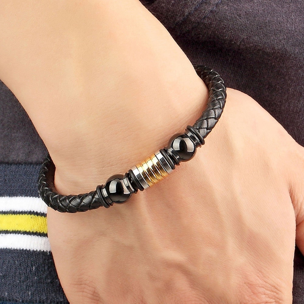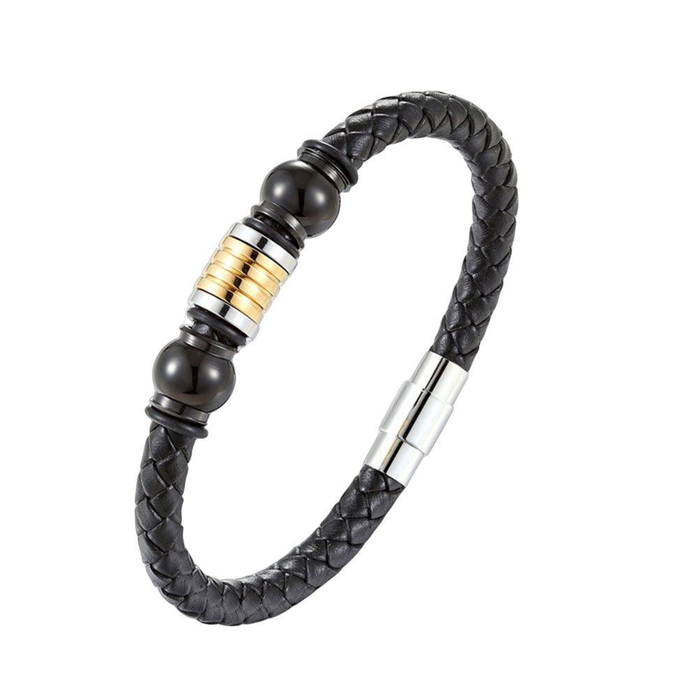 Bratara piele naturala impletita de bovine, cu elemente decorative si inchizatoare din inox negru si argintiu. Latime: 1 cm, Grosime snur: 6 mm. Sistem inchidere magnetica.