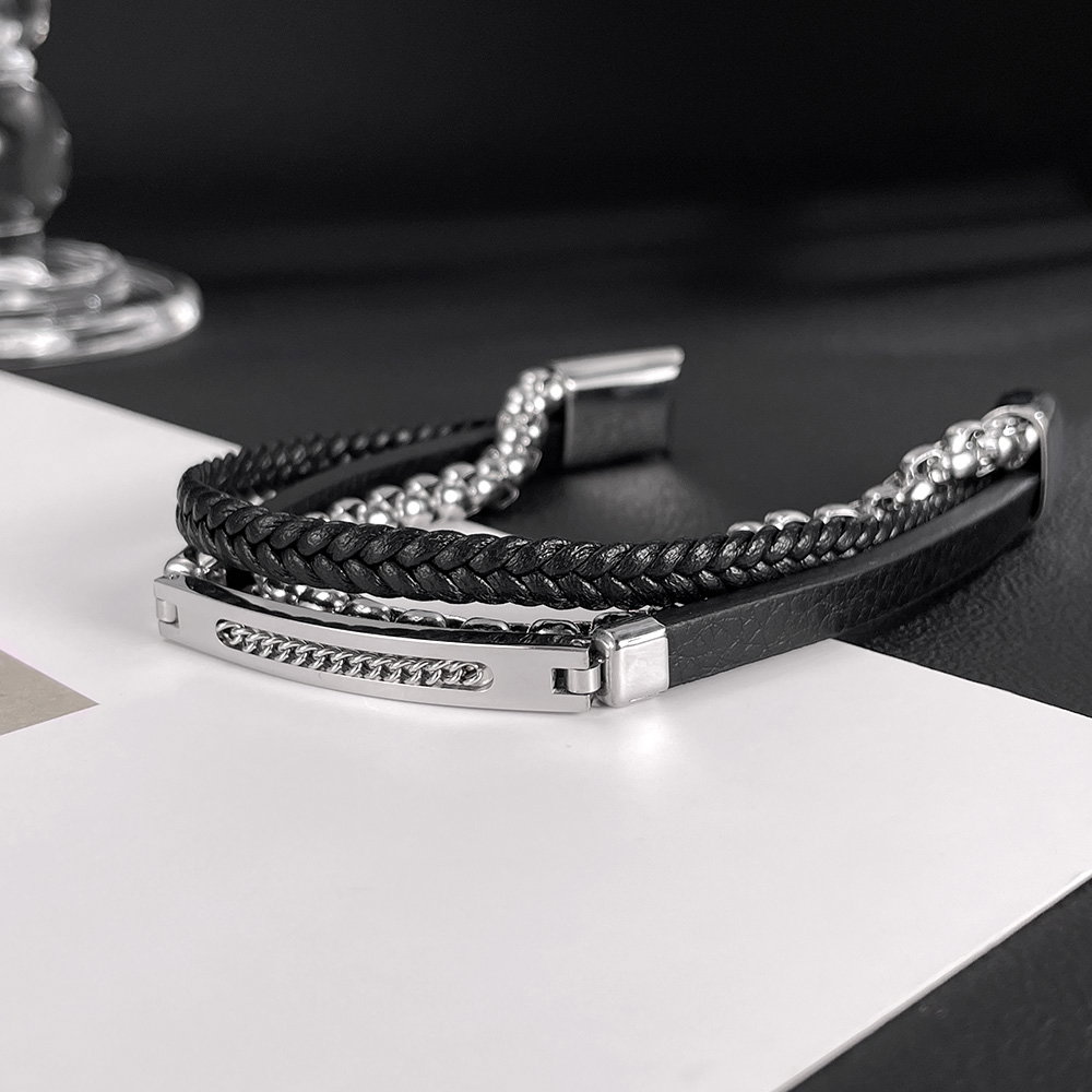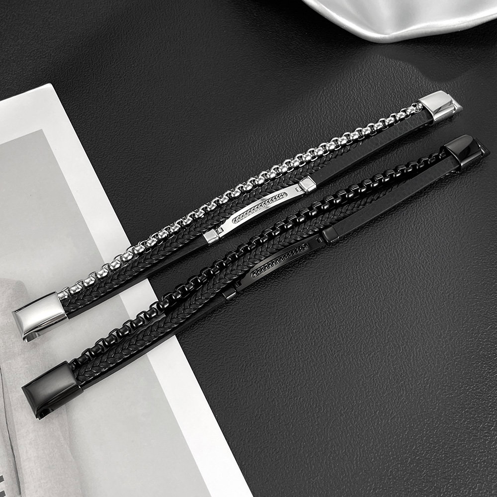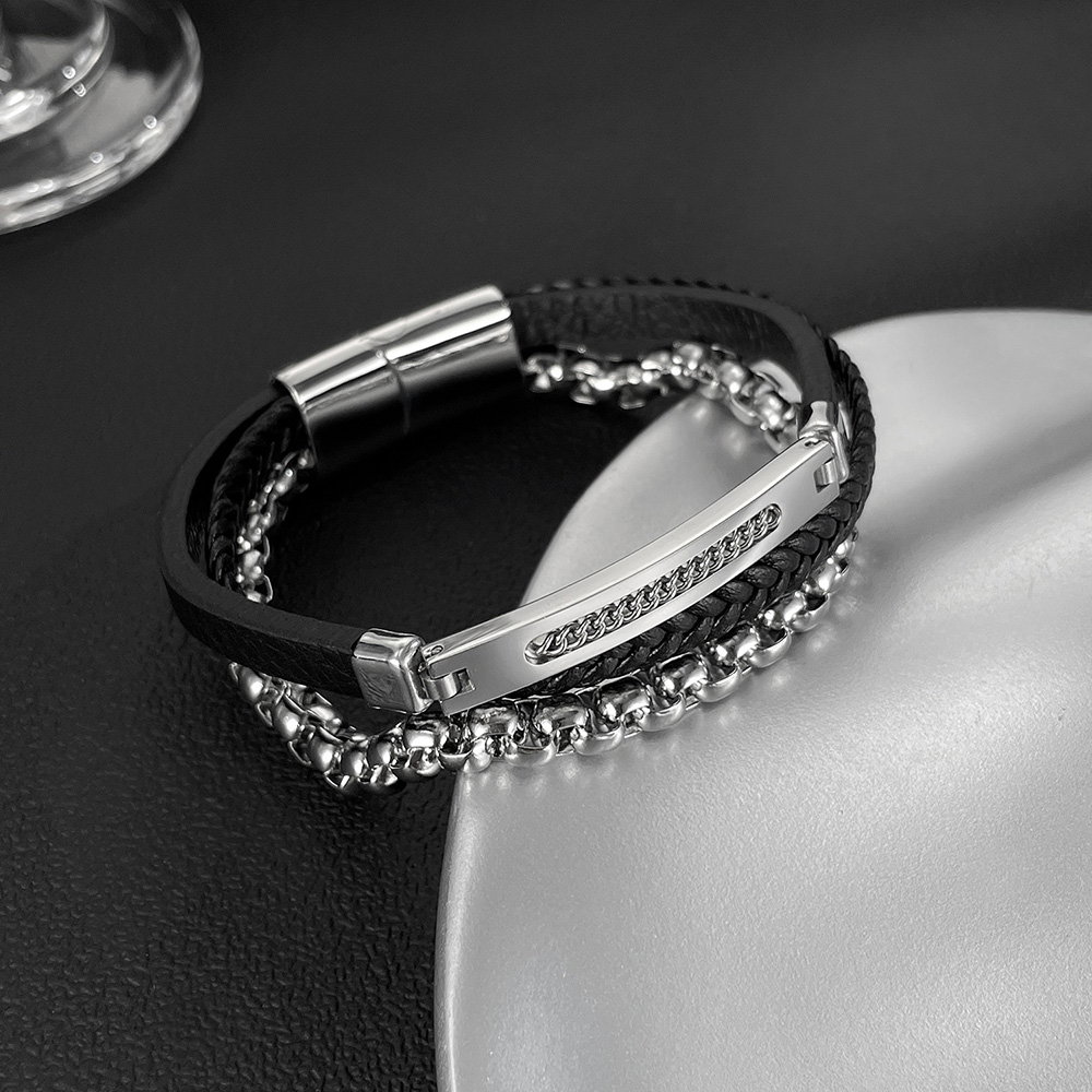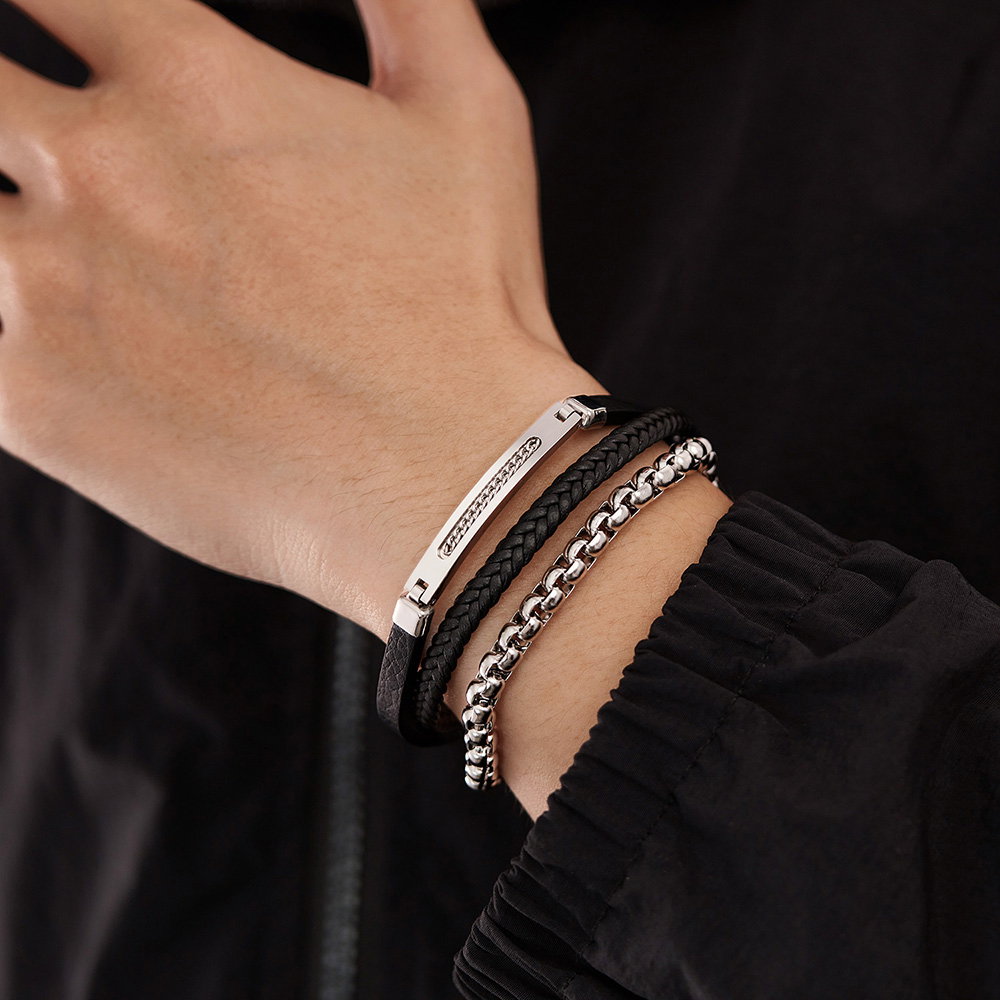 Bratara din piele neagra, alcatuita din mai multe fire impletite si netede, completata de un lant decorativ si o placuta metalica din inox. Contrastul dintre textura pielii si luciul metalului ofera un aspect sofisticat si modern. Inchizatoarea dubla din inox (mecanica si magnetica) asigura confort si siguranta la purtare. Un accesoriu ideal pentru barbatii care vor sa exprime stil si incredere in orice context.