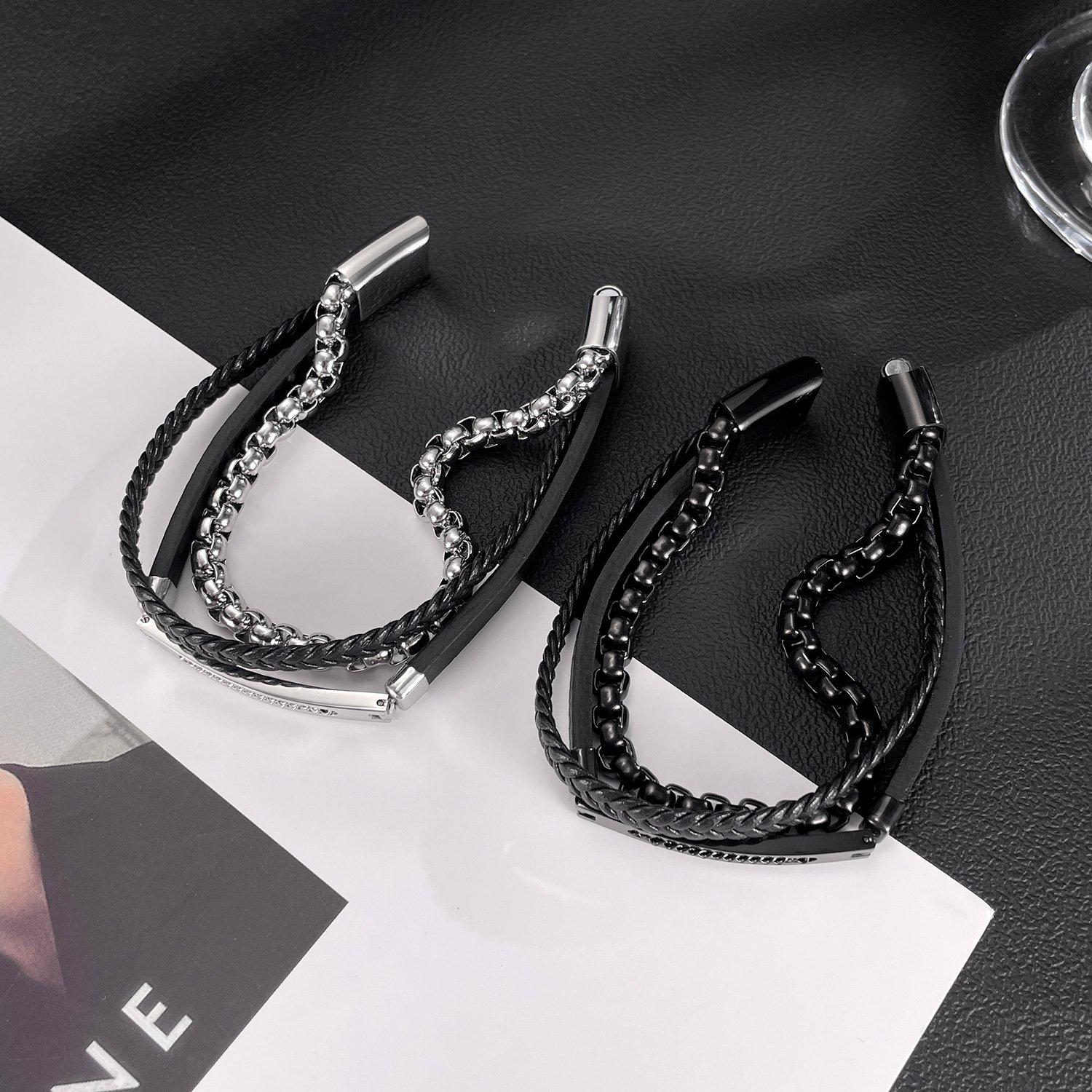 Bratara moderna din piele neagra, compusa din mai multe fire impletite si netede, completata de un lant decorativ si o placuta din inox negru lucios. Designul robust si elegant aduce un plus de atitudine si stil oricarei tinute. Inchizatoarea dubla din inox (mecanica si magnetica) asigura confort si siguranta la purtare. Un accesoriu perfect pentru barbatii care apreciaza eleganta discreta si detaliile rafinate.
