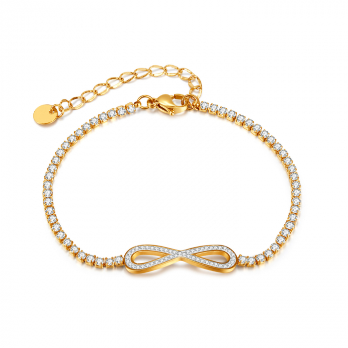 Placajul fin cu rodiu sau aur ofera un luciu de durata si protejeaza frumusetea piesei in timp, pastrand eleganta initiala chiar si dupa purtari repetate. Designul clasic, cu pietre perfect aliniate, pune in valoare delicatetea incheieturii si completeaza cu gratie orice stil.