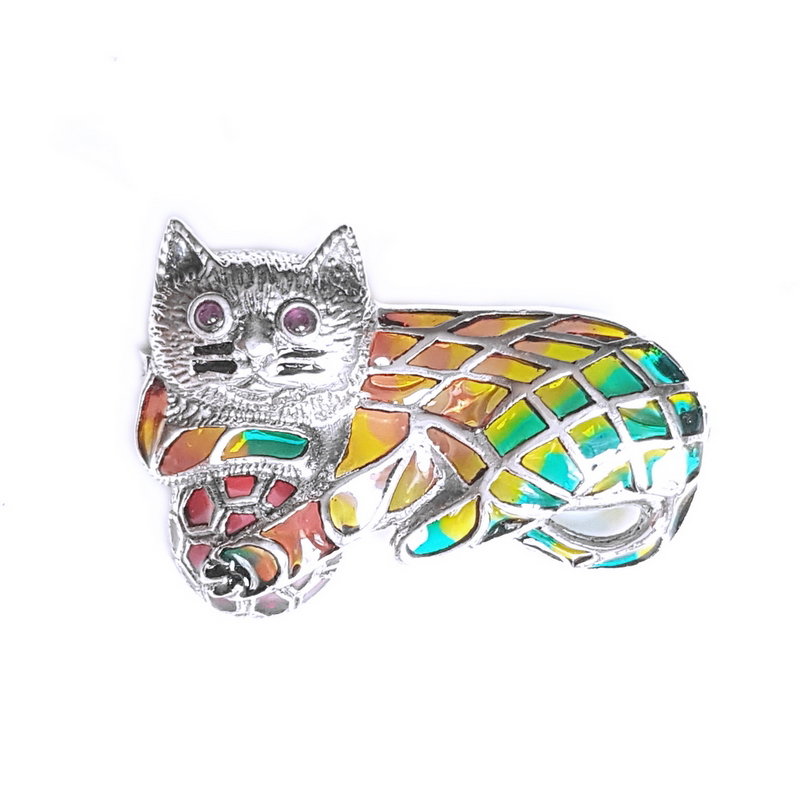 Brosa argint 925 Pussycat. O brosa diafana, in culori vesele, care poate aduce un strop de culoare oricarei tinute. Pisica, animal celtic simbolic, reprezinta gardianul lumii de dincolo.