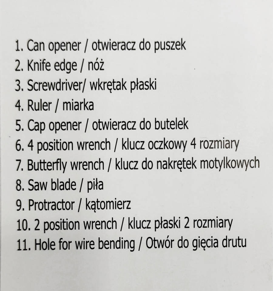 Card multifunctional de supravietuire din otel inox ce concentreaza 11 unelte deosebit de utile precum deschizator de conserve/sticle, surubelnita, fierestrau sau cutit.
