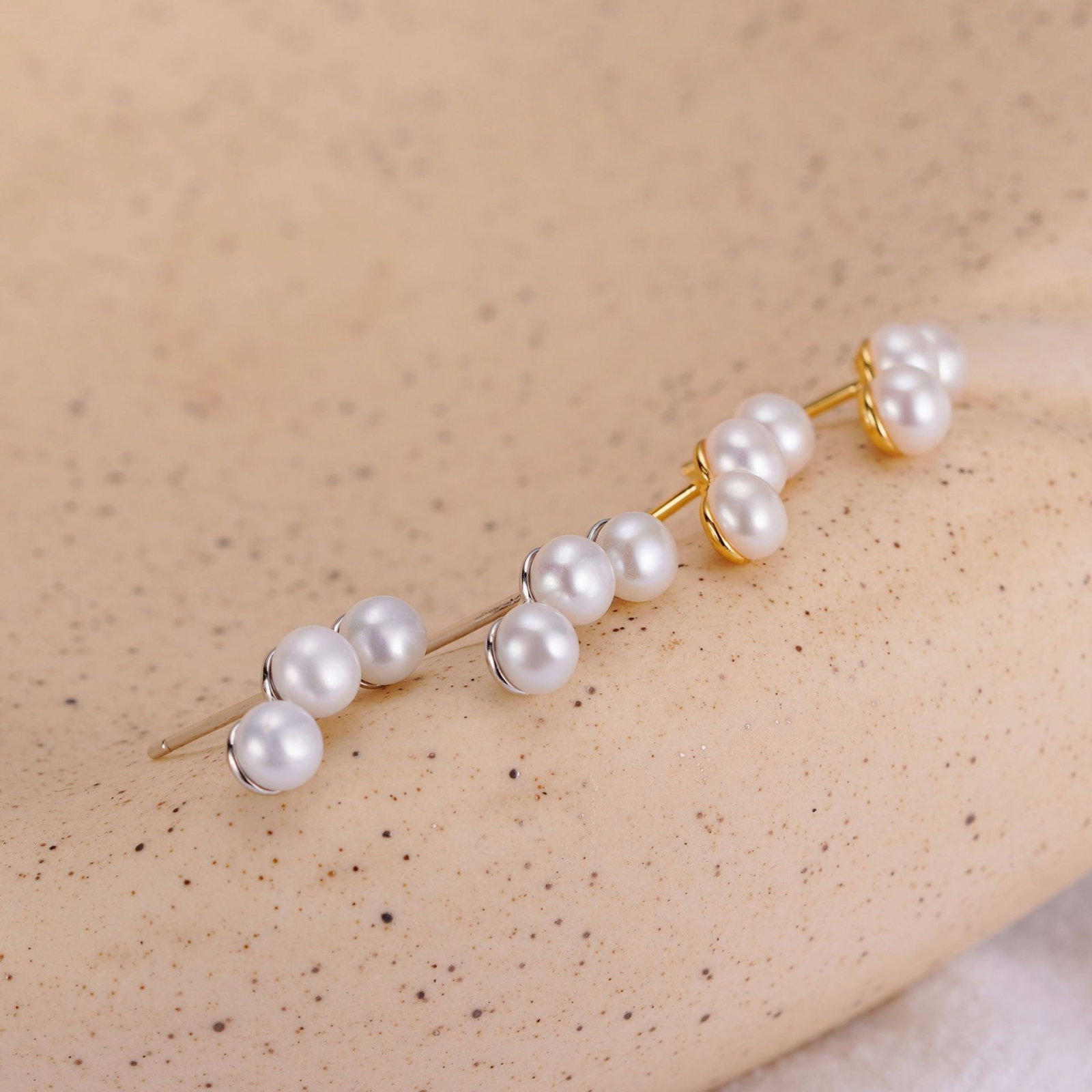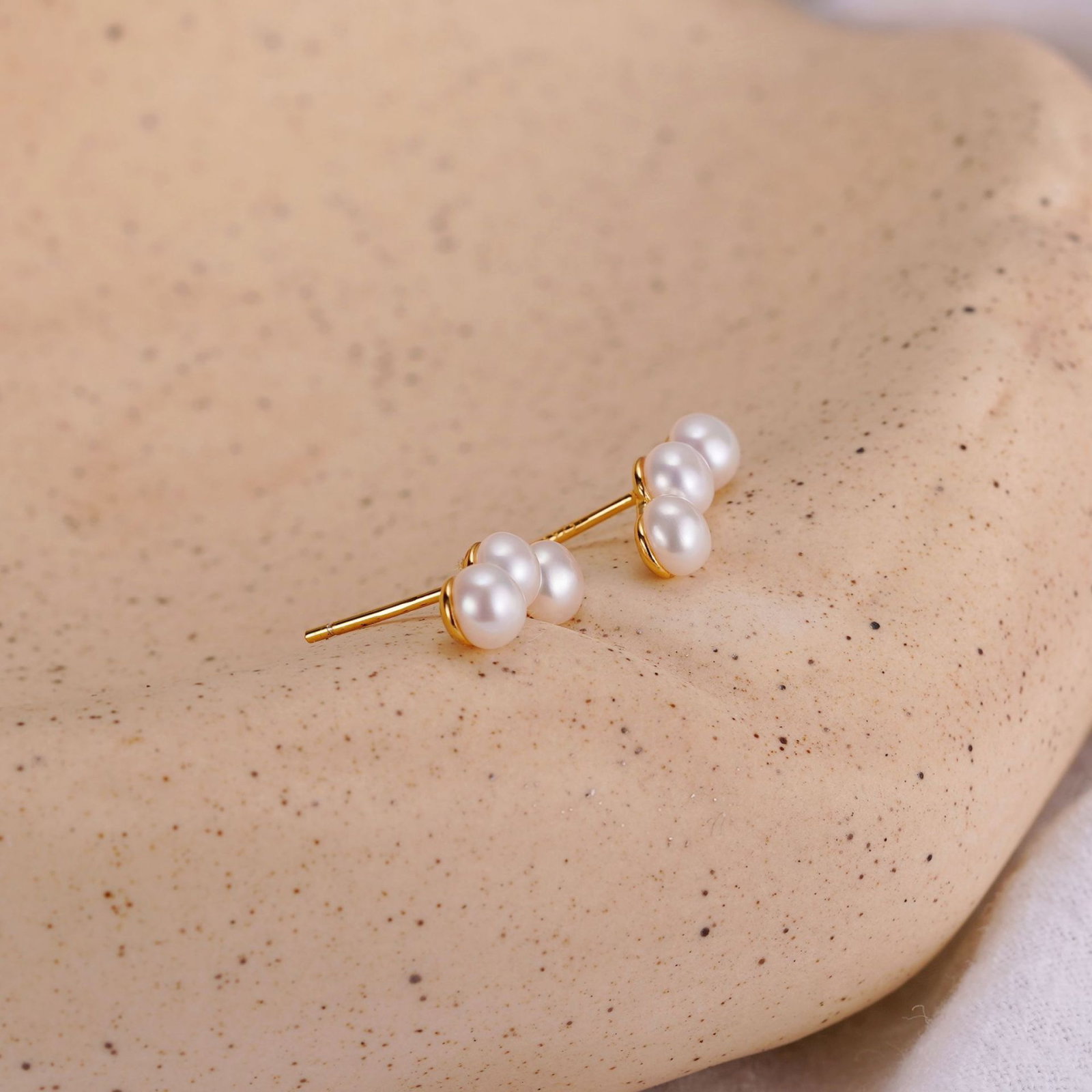 Acesti cercei din argint 925, delicat placati cu aur de 14K, sunt o expresie a elegantei subtile. Fiecare detaliu este gandit cu grija, iar cele trei perle naturale de cultura stralucesc cu o lumina aparte, aducand un aer de rafinament oricarei tinute. Designul lor minimalist si sofisticat transforma aceste bijuterii intr-o poveste de frumusete si stil, perfecta pentru a fi purtata in momente speciale sau in fiecare zi. Alege sa te bucuri de stralucirea lor durabila si de farmecul pe care il aduc.