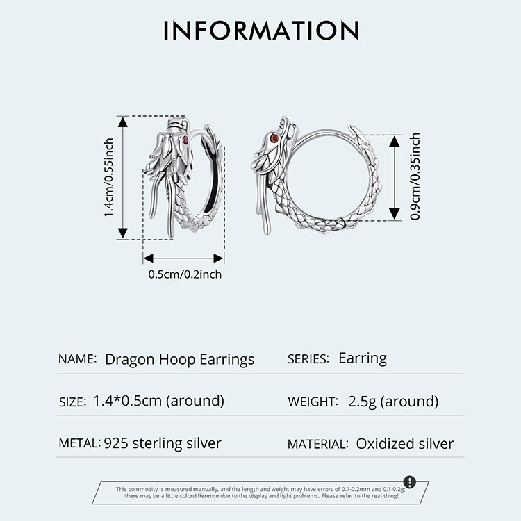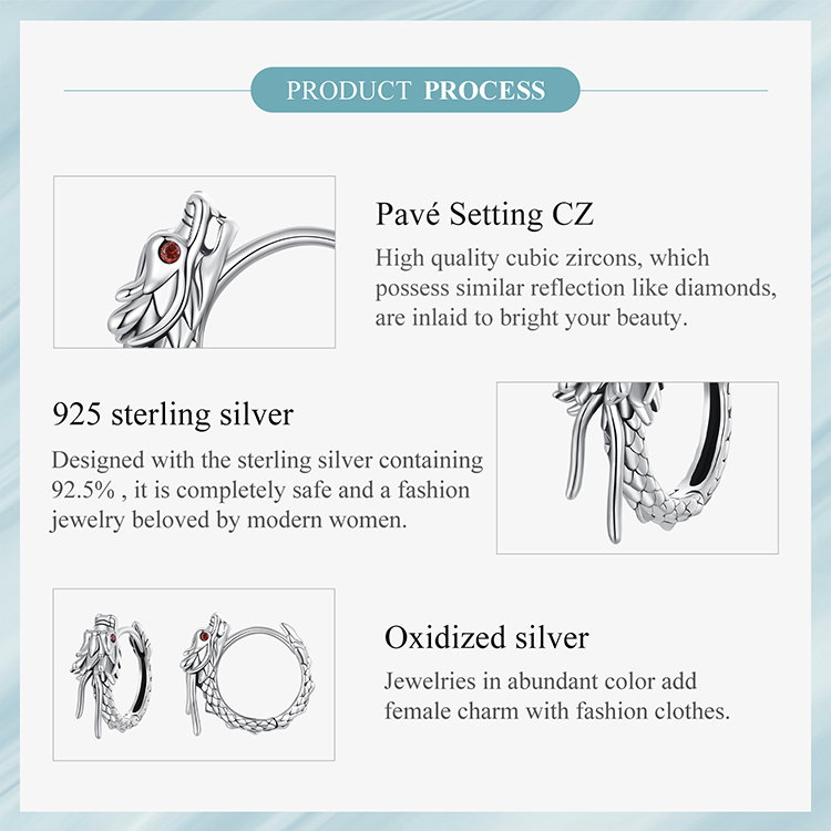 Cercei argint cu Dragoni. Dimensiuni: 1,4 * 0,5 cm, diametru interior 0,9 cm, Greutate 2,5 grame. Material: Argint 925, Zirconiu. Culoare: Argintiu. Pietre: Zirconiu.