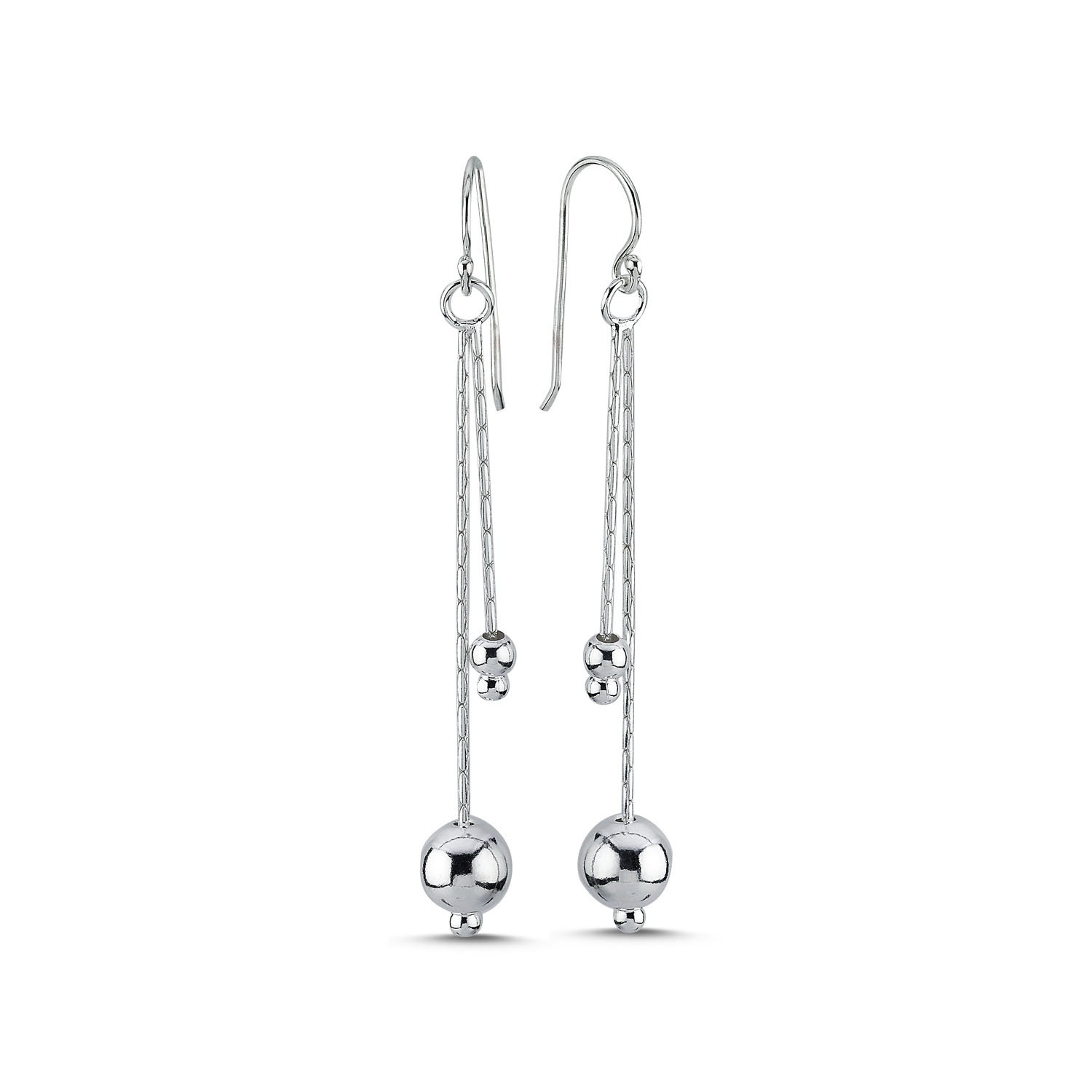 Cercei argint lungi cu bilute. Dimensiuni: Lungime 60 mm, Greutate aprox. 4,7 grame. Material: Argint 925 placat cu rodiu, zirconiu si email. Culoare: Argintiu. Pietre: Fara pietre.