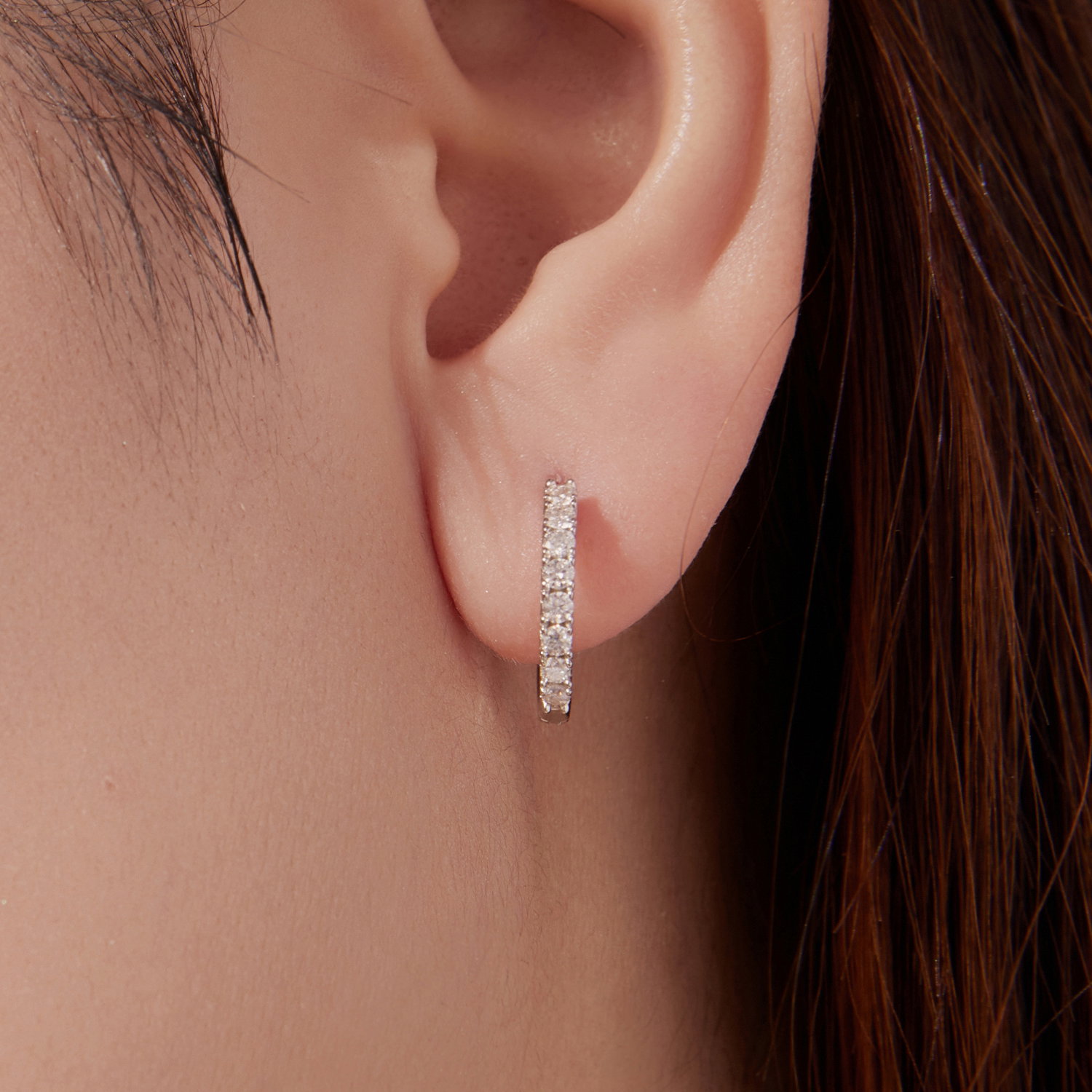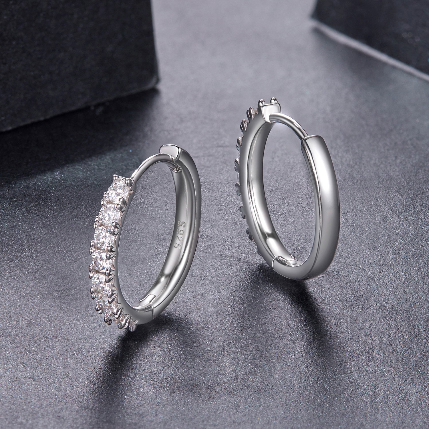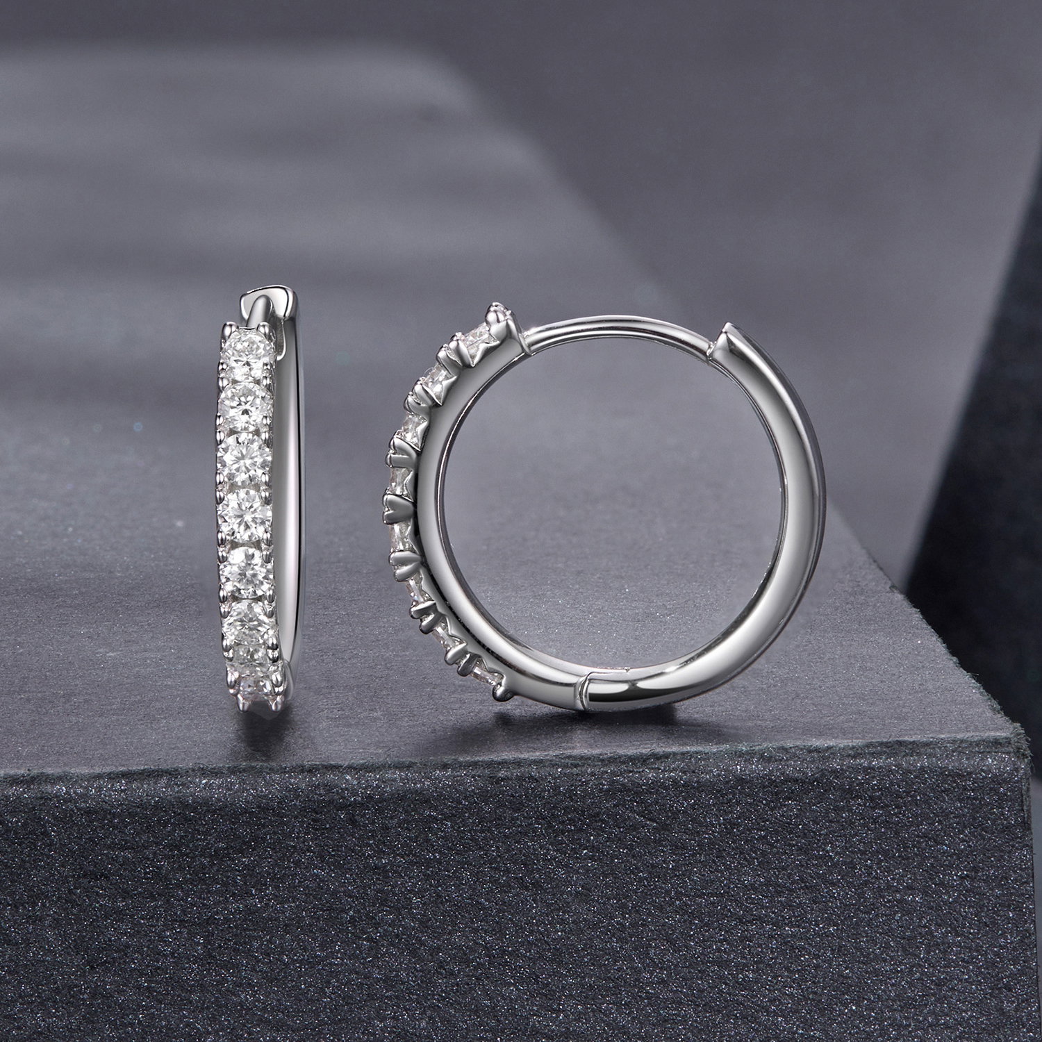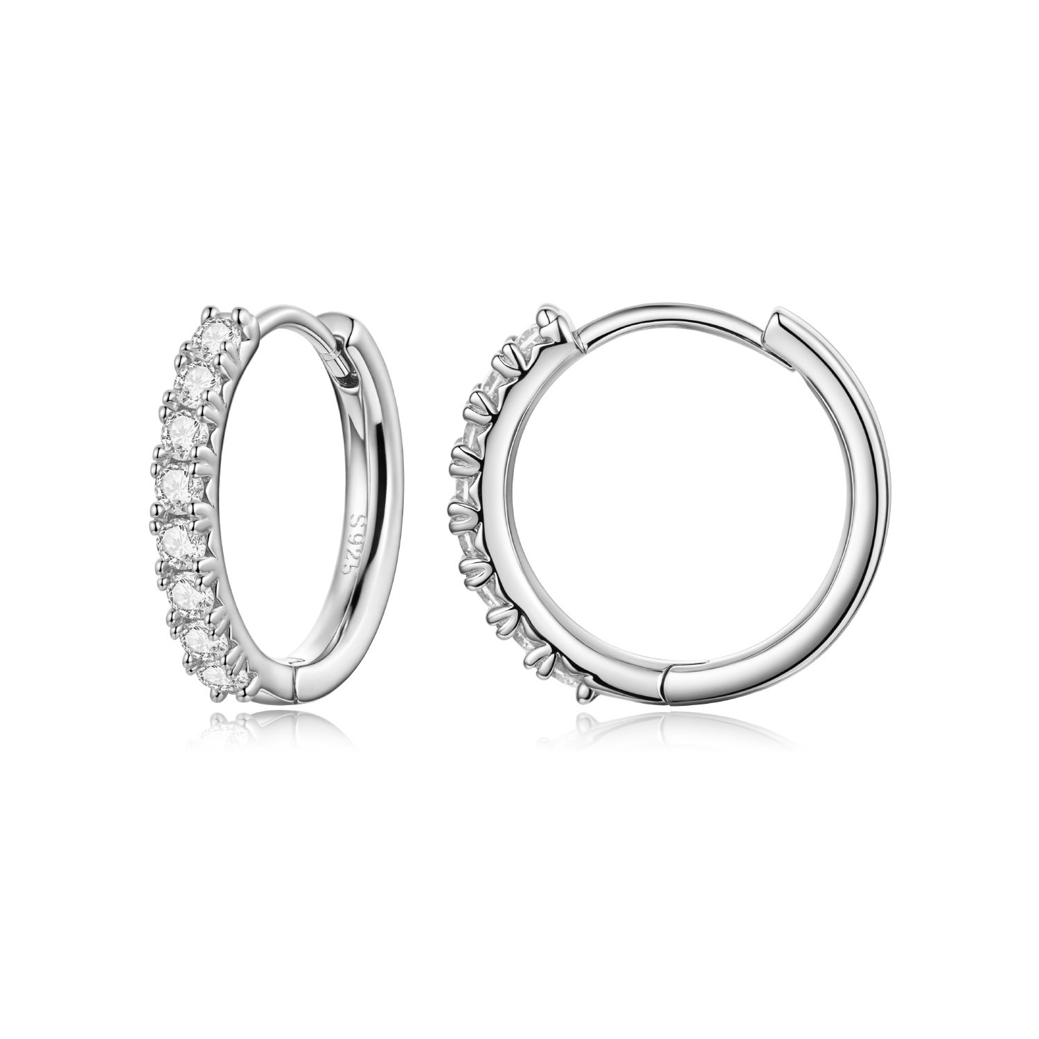 Cercei argint rotunzi cu Moissanit. Dimensiuni: 1,6 x 0,2 cm, Diametru interior: 1,3 cm, Moissanit: 2 mm/0,03 ct, Greutate: 2,6 grame. Materiale: Argint 925, placat cu rodiu, Moissanit. Pietre: Moissanit. Culoare: Argintiu.