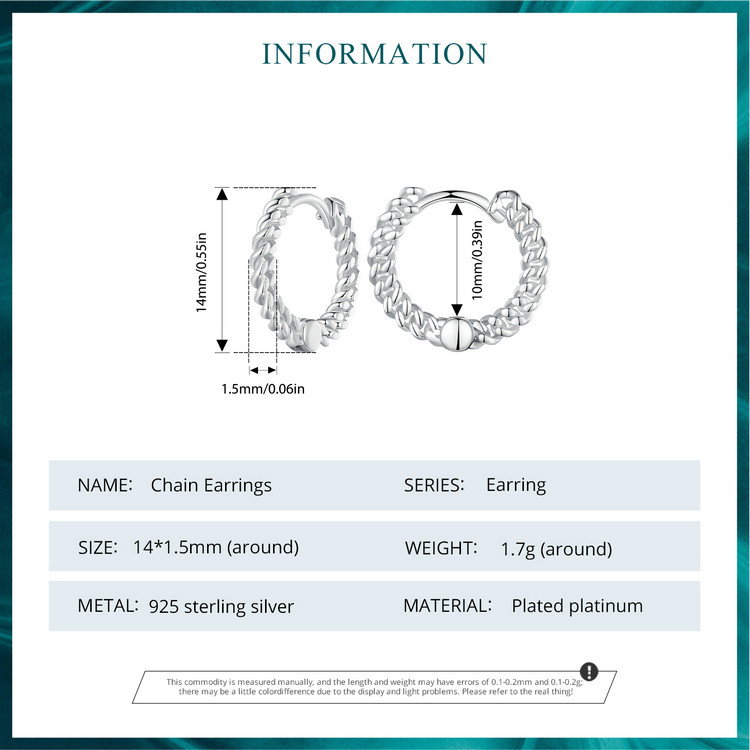 Cercei argint rotunzi lant. Dimensiuni: 14 x 1,5 mm, Diametru interior 10 mm. Material: Argint 925 placat cu rodiu. Culoare: Argintiu. Pietre: Fara pietre. Ambalaj: Cutiuta bijuterii (gratuit).