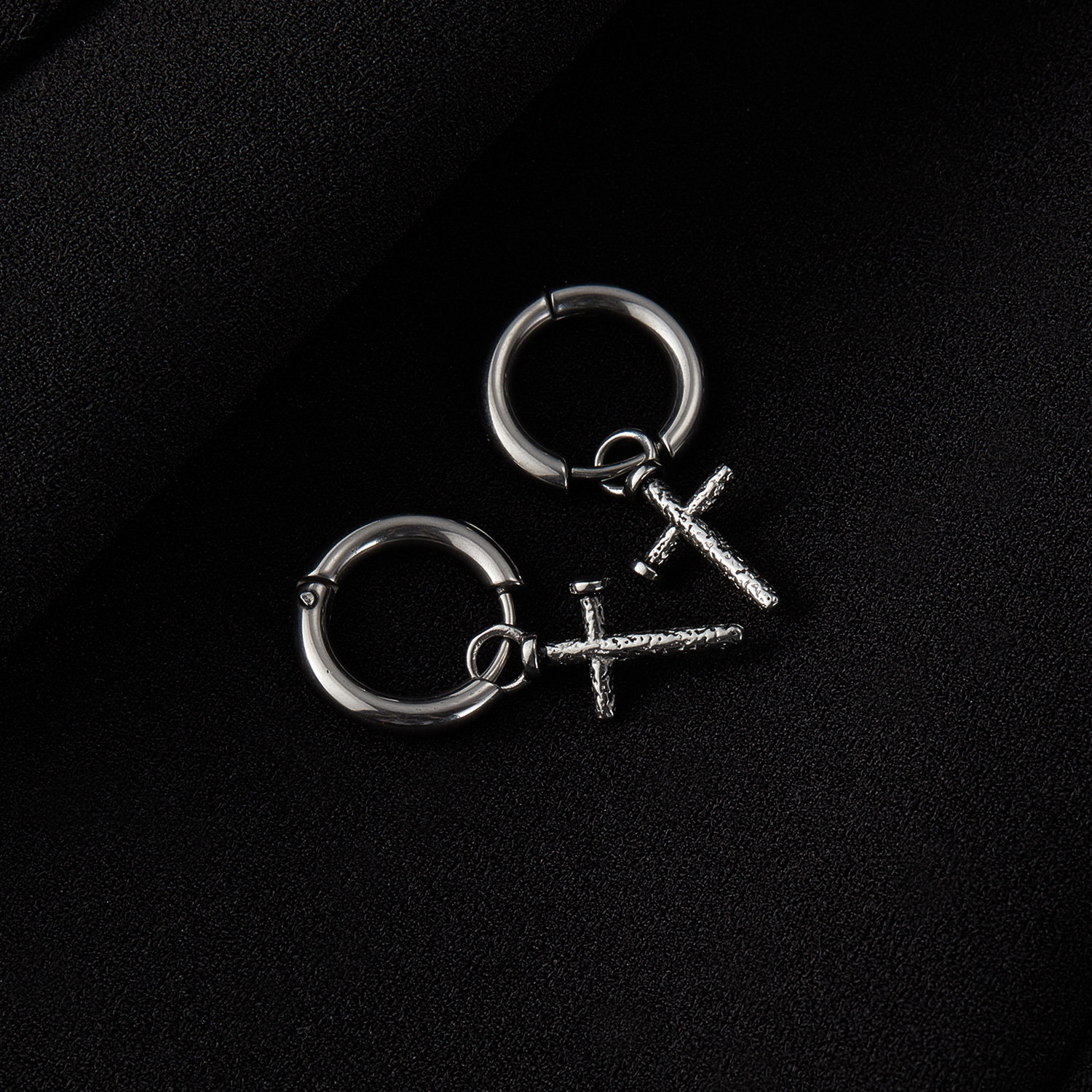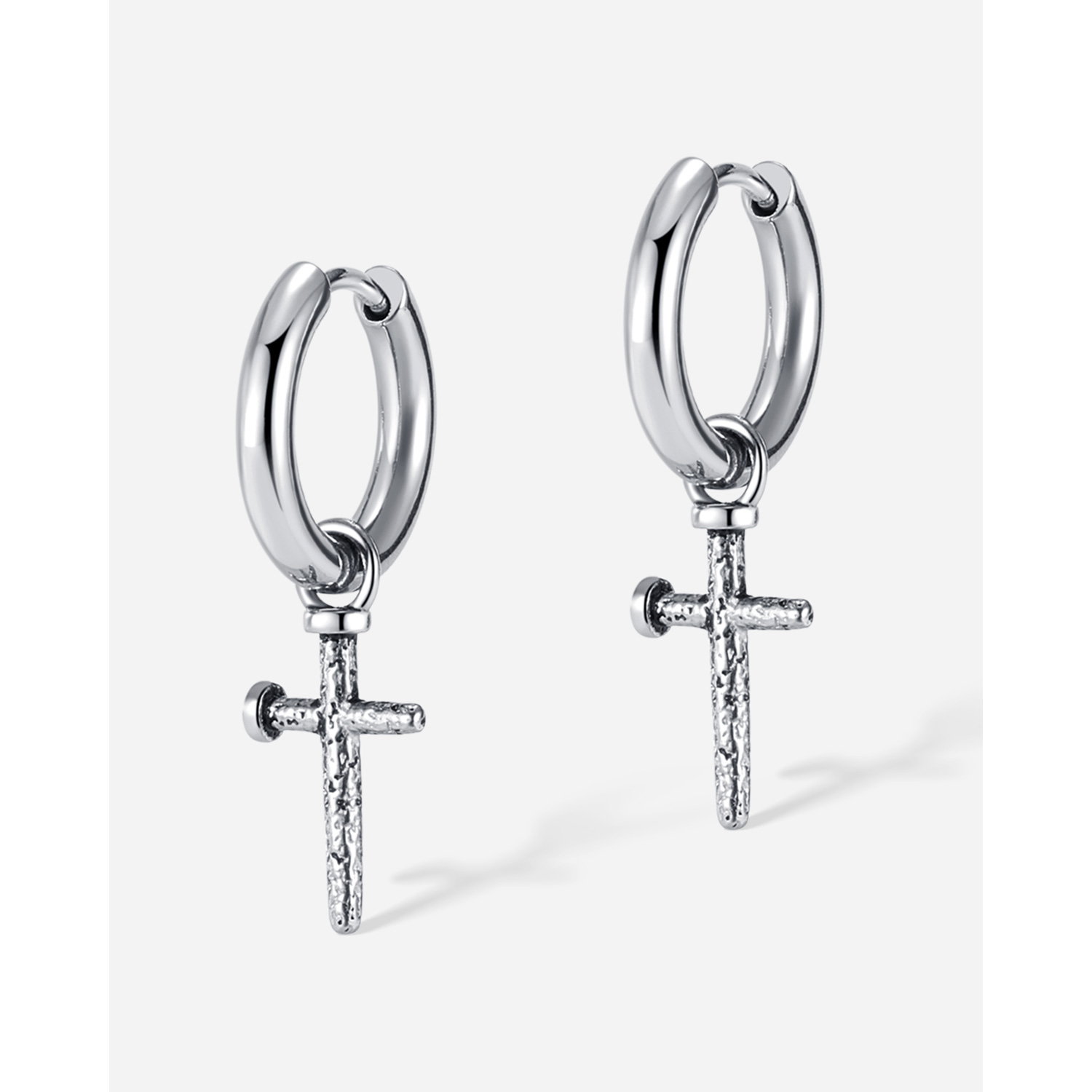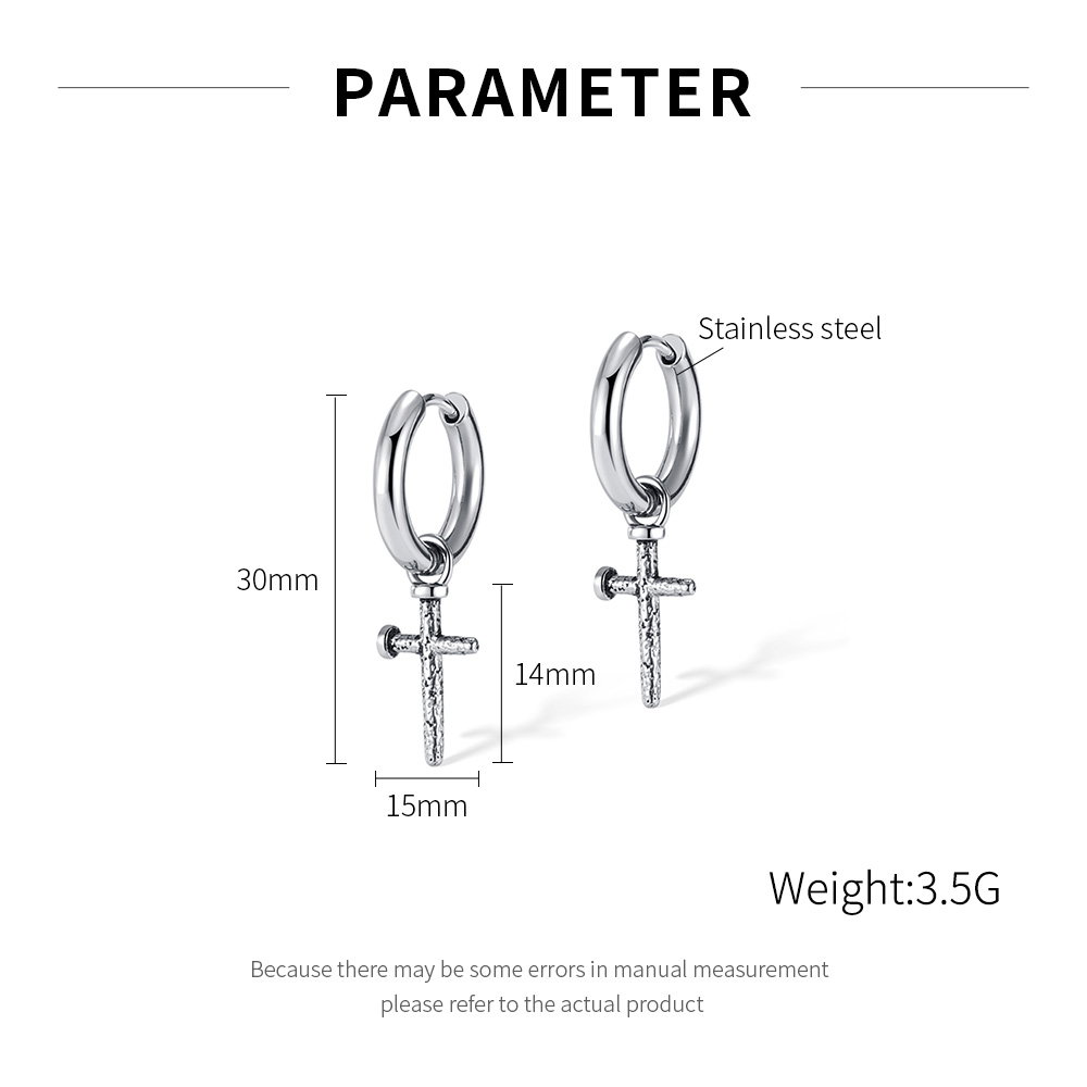 Cercei inox cu cruciulite . Dimensiuni: vezi poze pentru detalii. Material: Inox. Culoare: Argintiu. Pietre: Fara pietre.