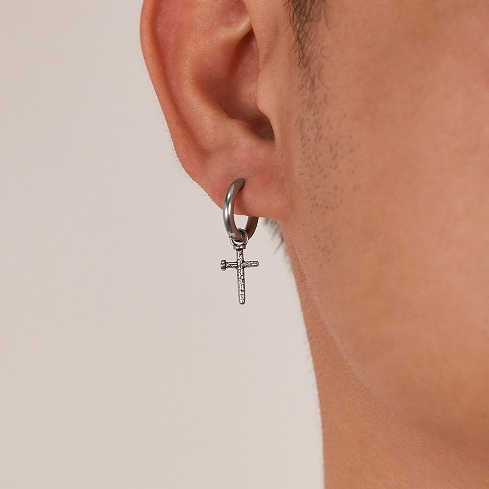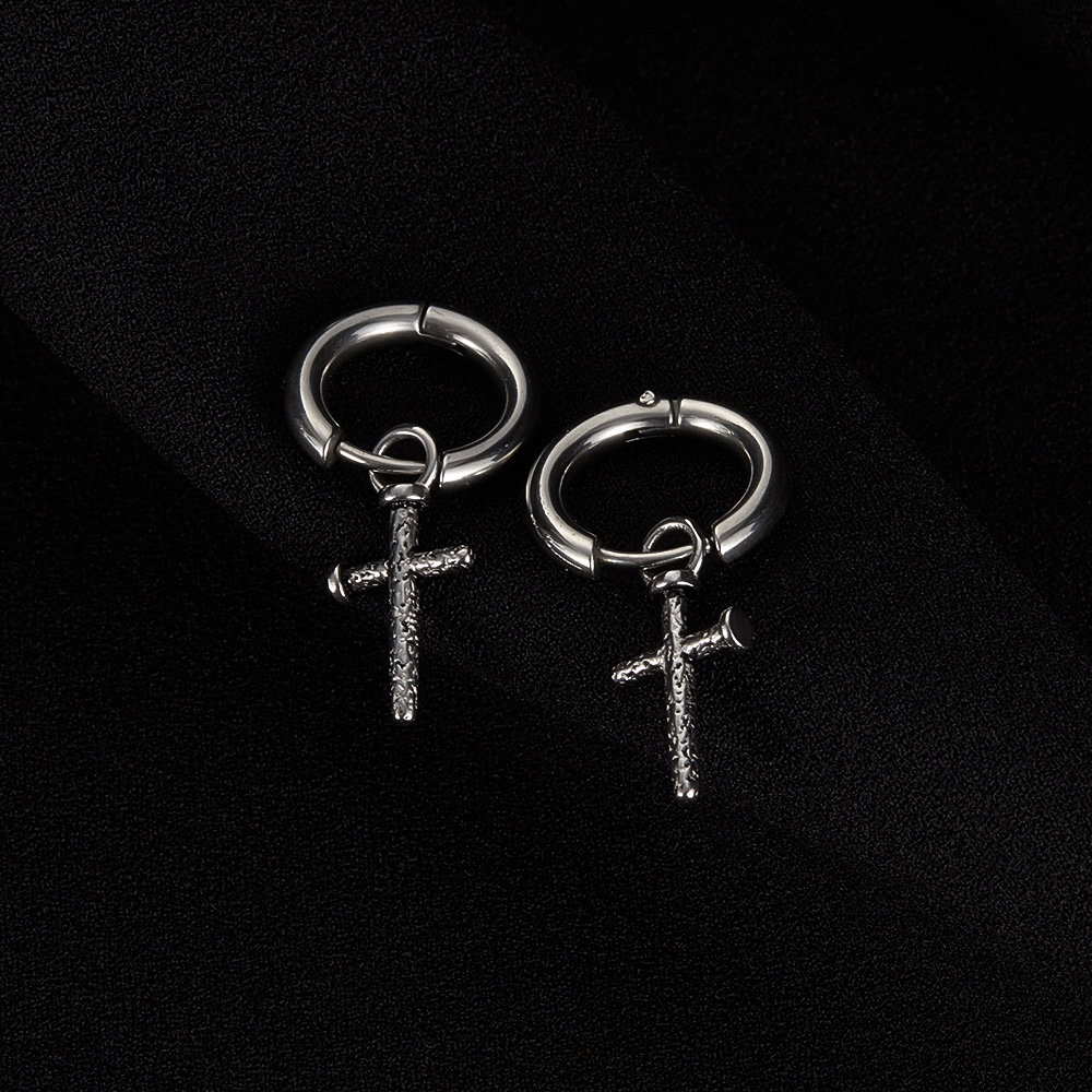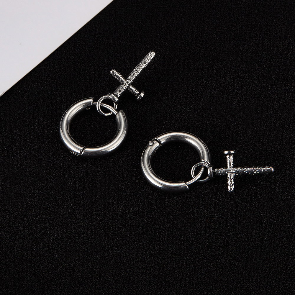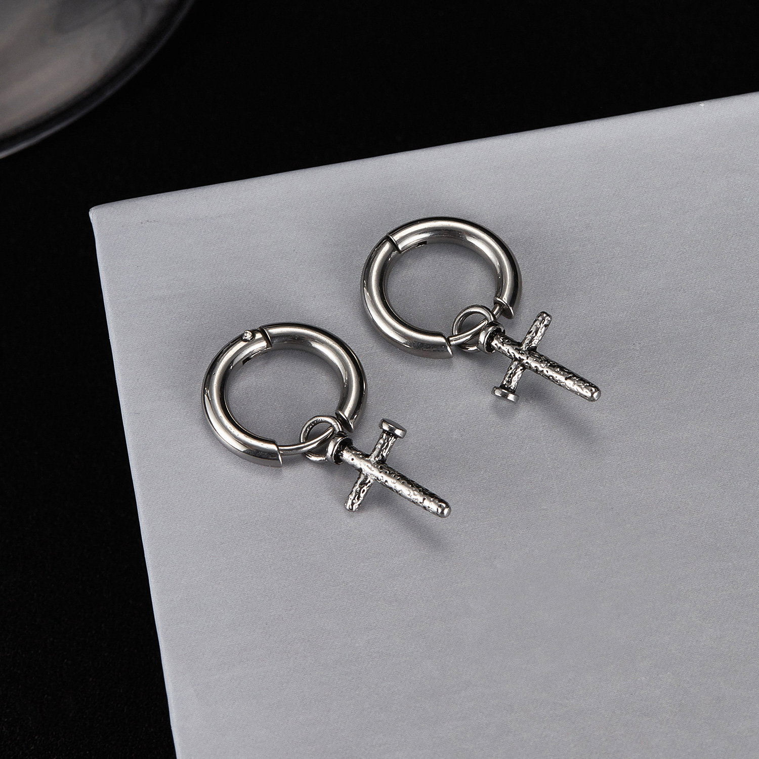 Cercei inox cu cruciulite . Dimensiuni: vezi poze pentru detalii. Material: Inox. Culoare: Argintiu. Pietre: Fara pietre.