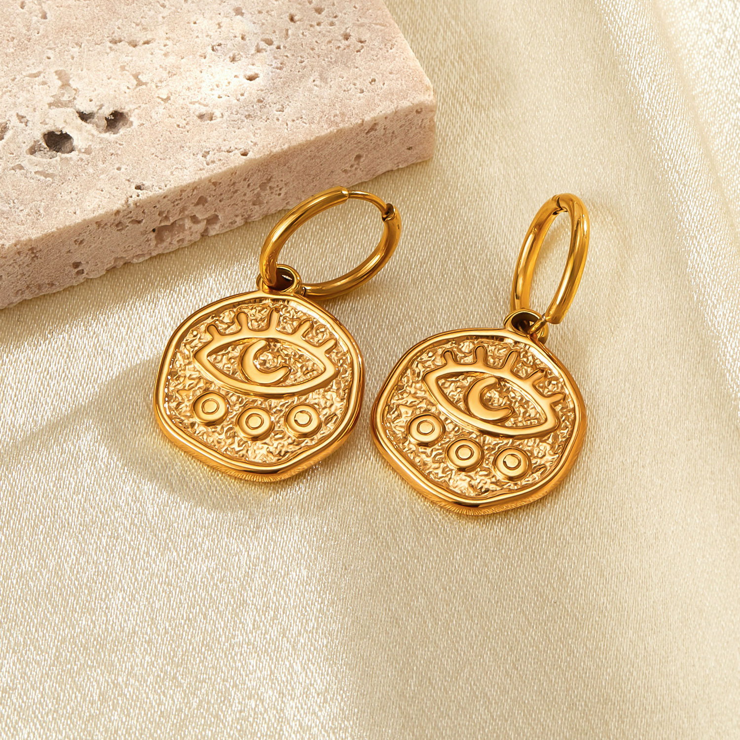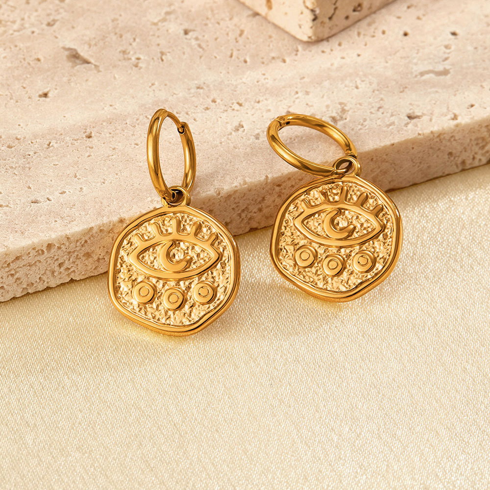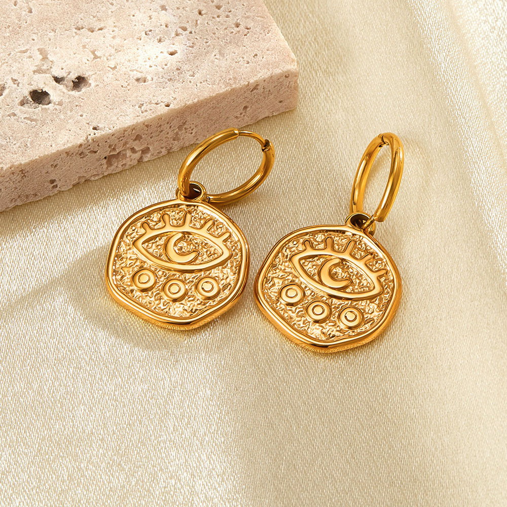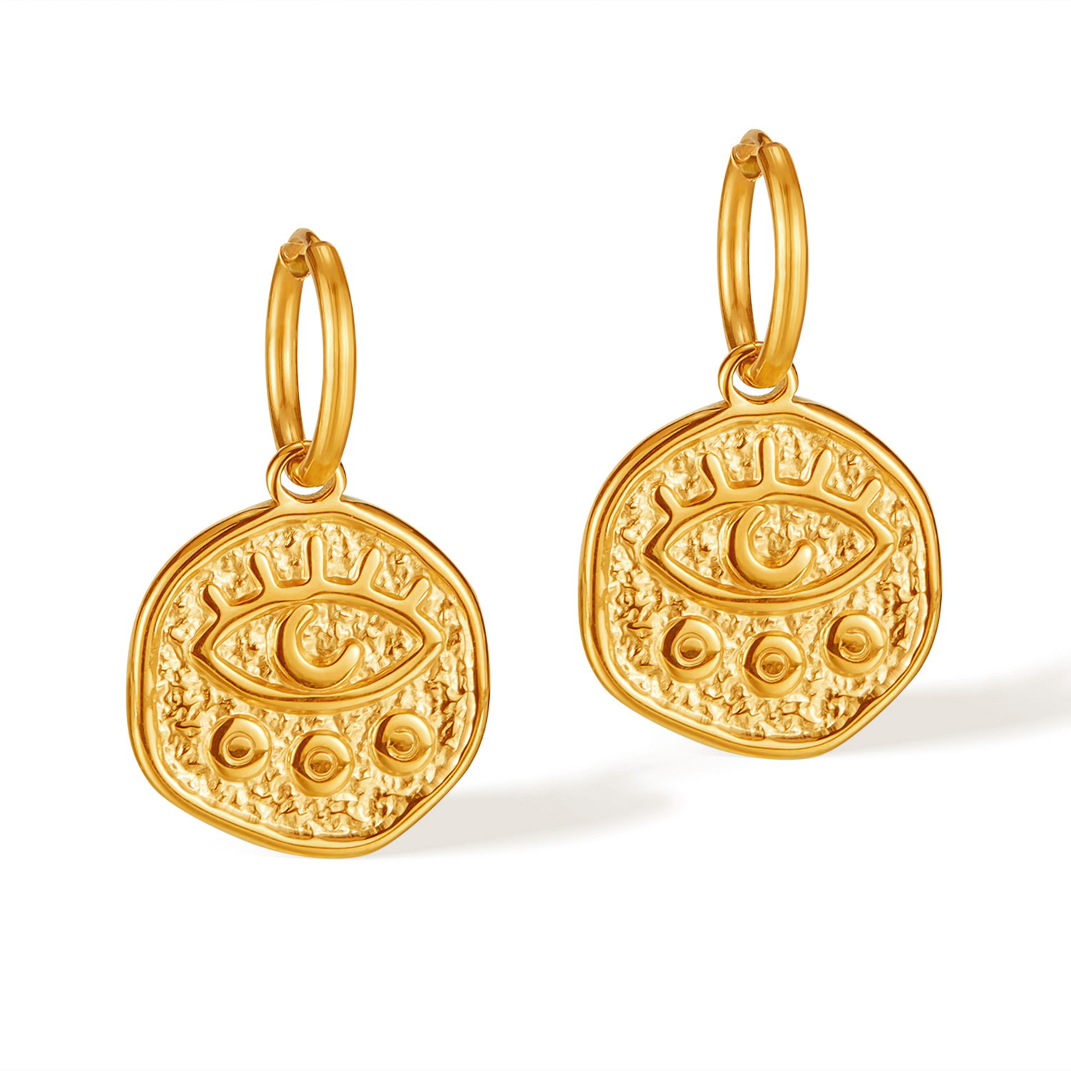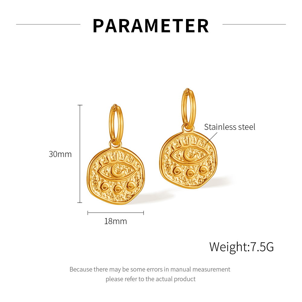 Cercei inox cu ochi de deochi. Dimensiuni: vezi poze pentru detalii. Material: Inox. Culoare: Auriu. Pietre: Fara pietre.