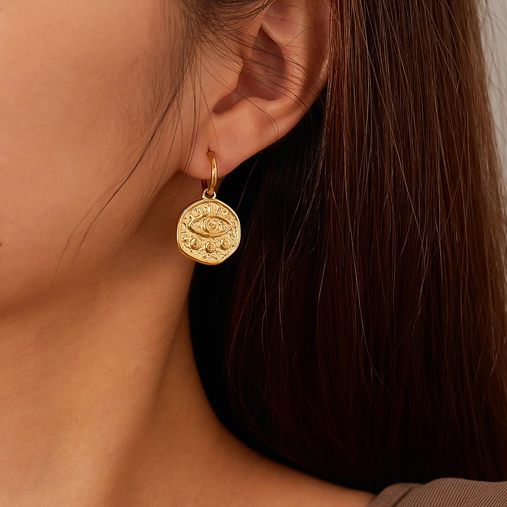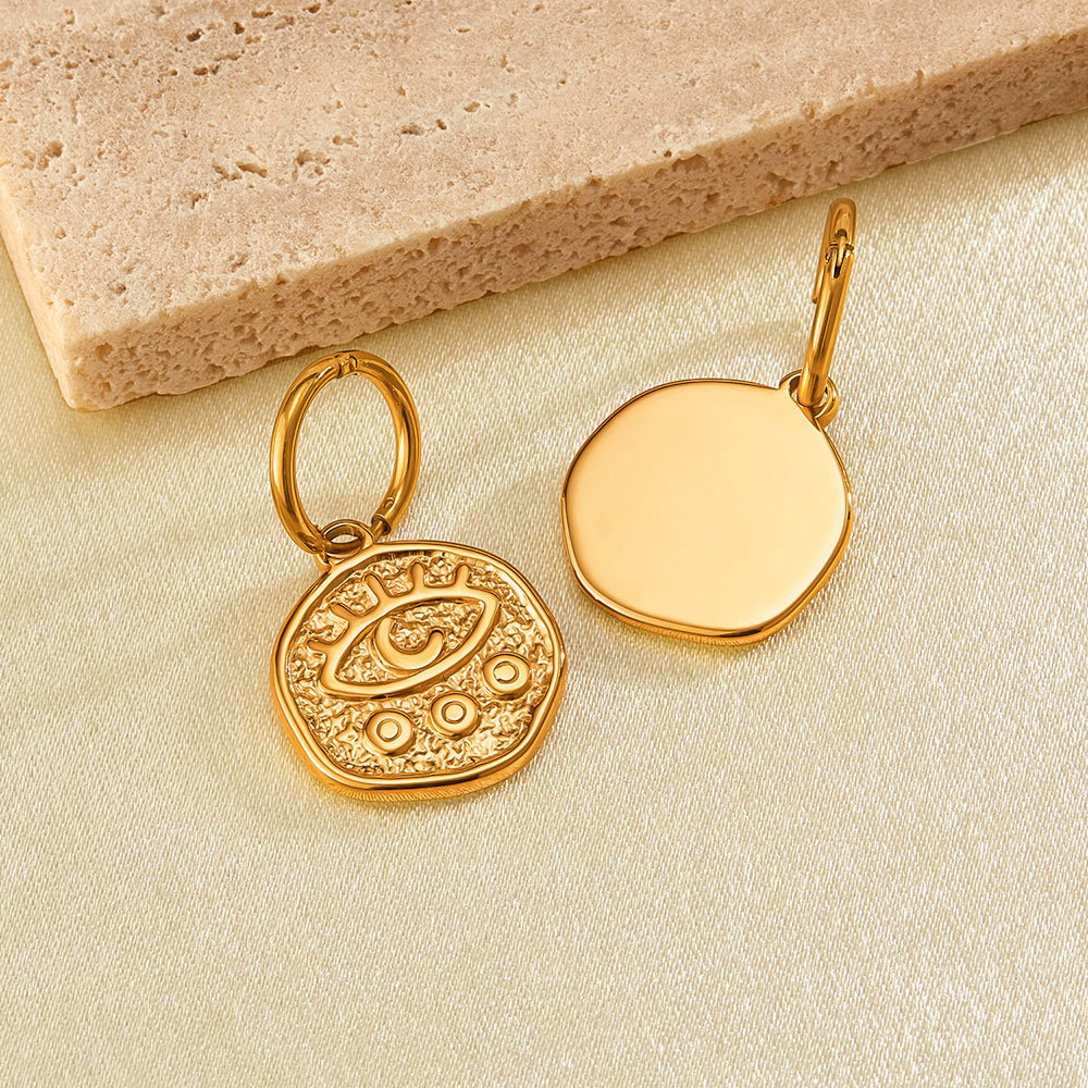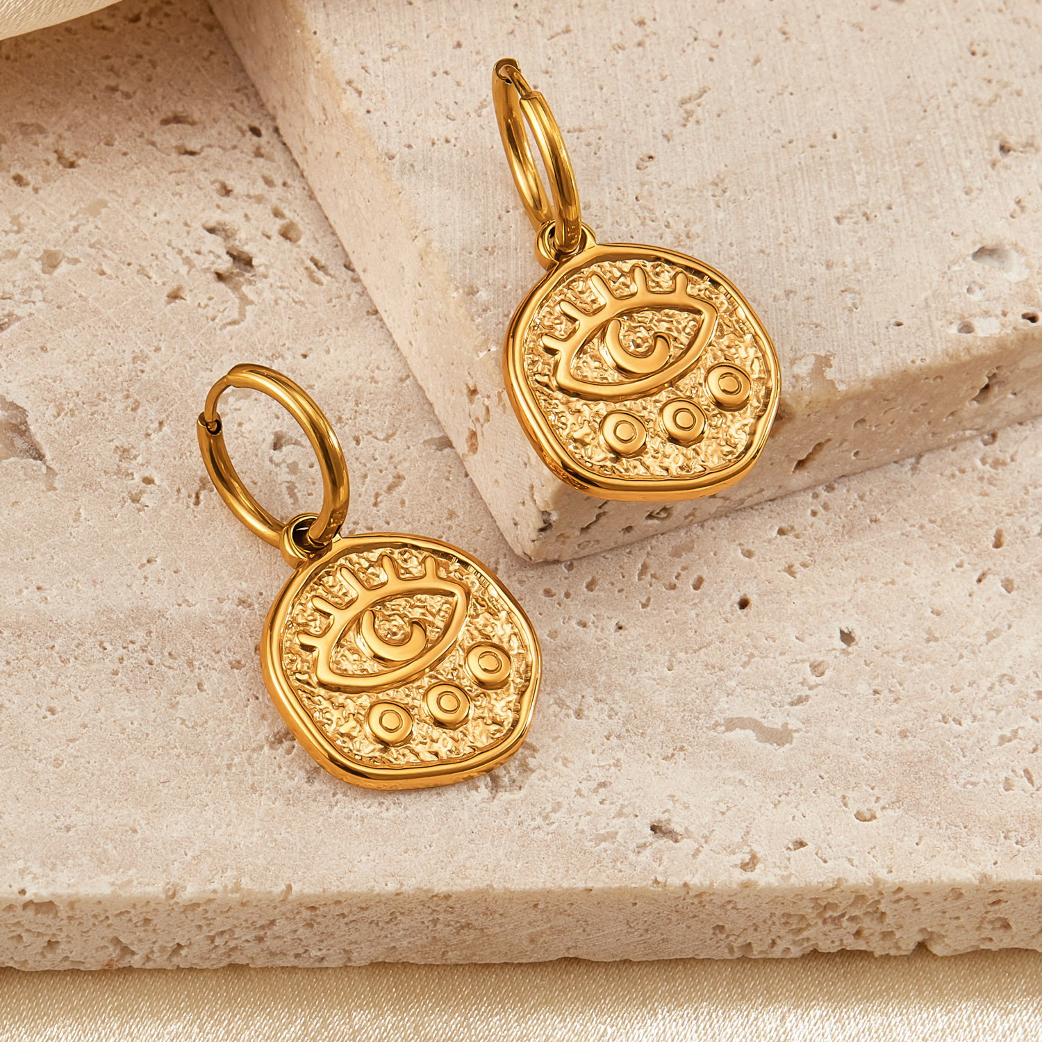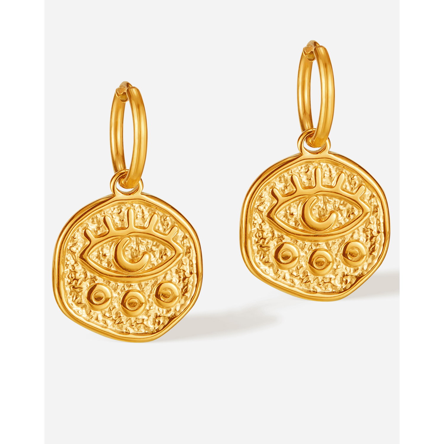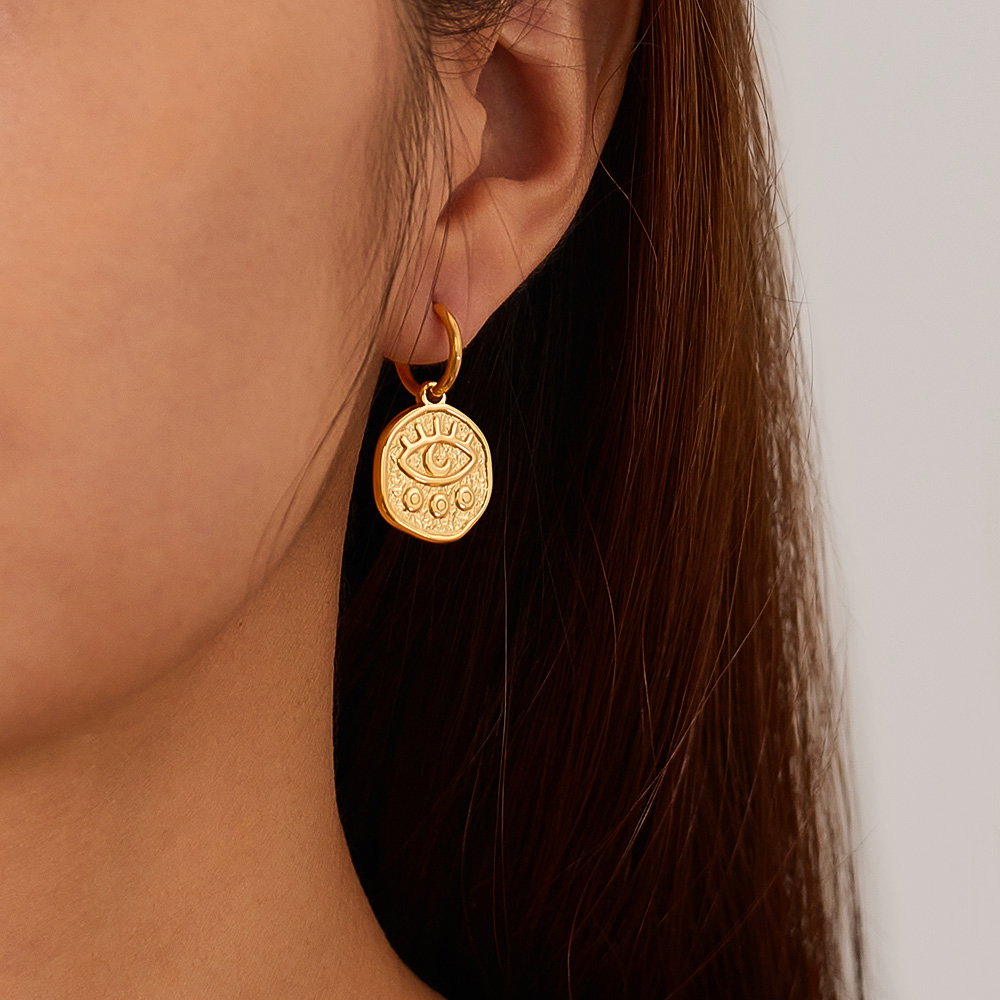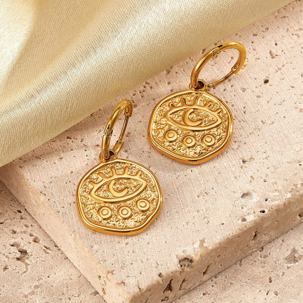 Cercei inox cu ochi de deochi. Dimensiuni: vezi poze pentru detalii. Material: Inox. Culoare: Auriu. Pietre: Fara pietre.