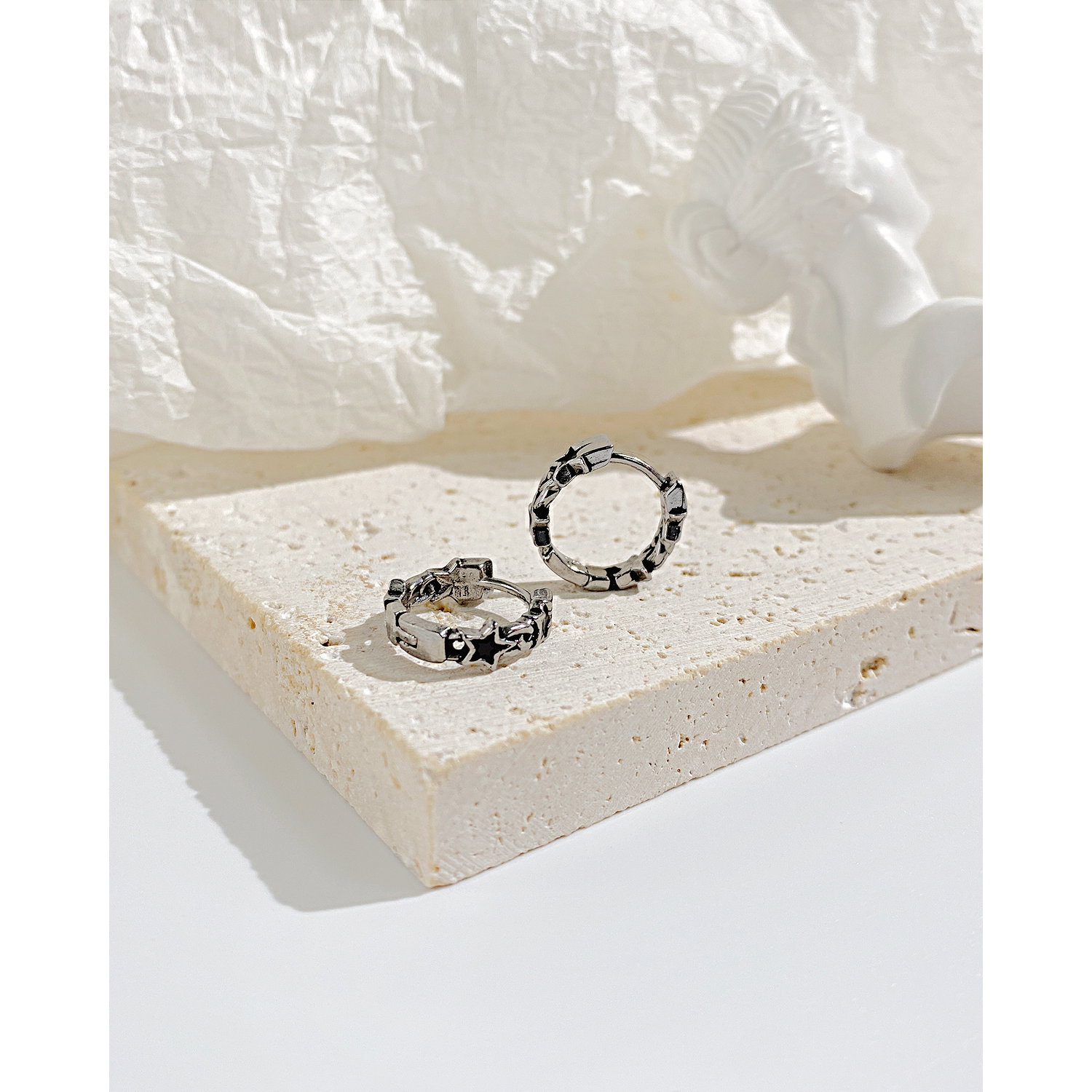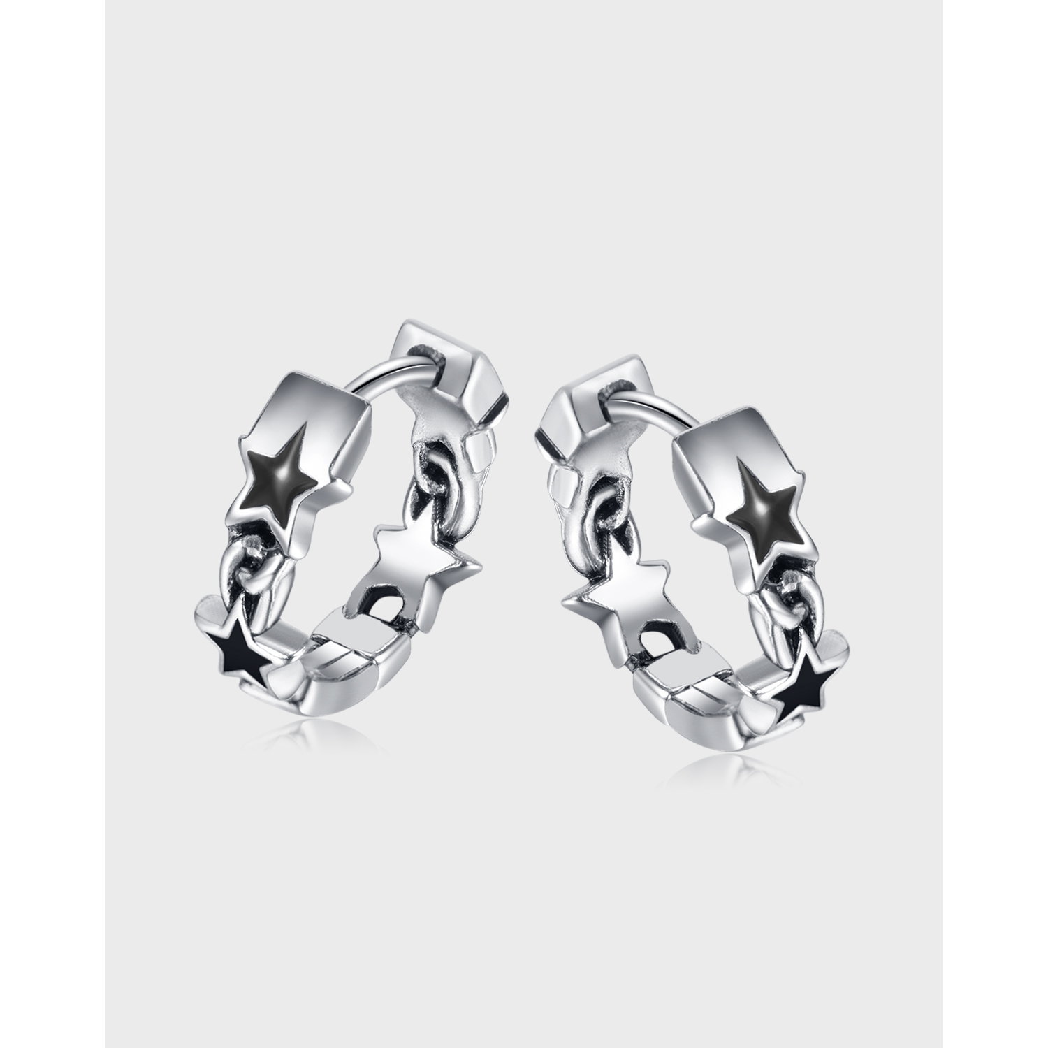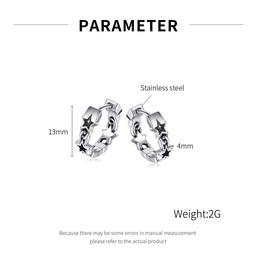 Cercei inox cu stelute. Dimensiuni: Diametru 13 mm, Grosime 4 mm. Culoare: Argintiu. Material: Inox. Ambalaj: Sacutel bijuterii (gratuit).