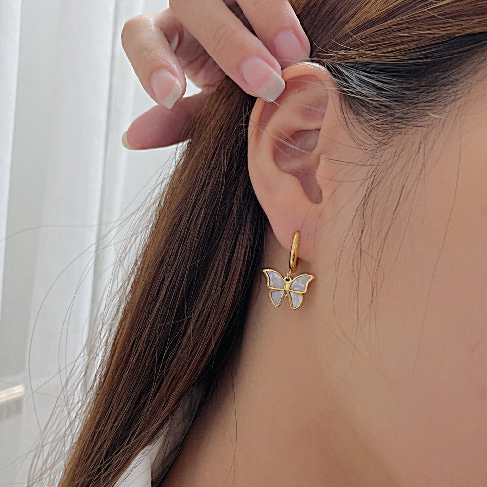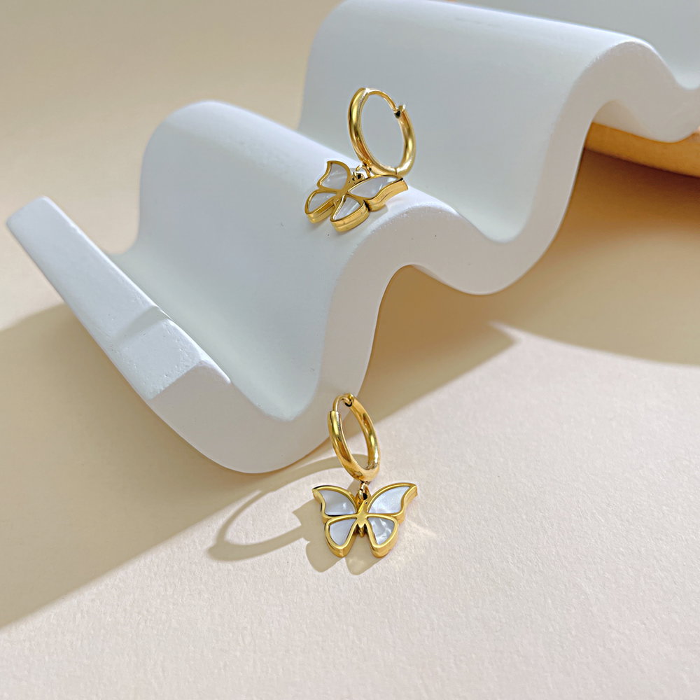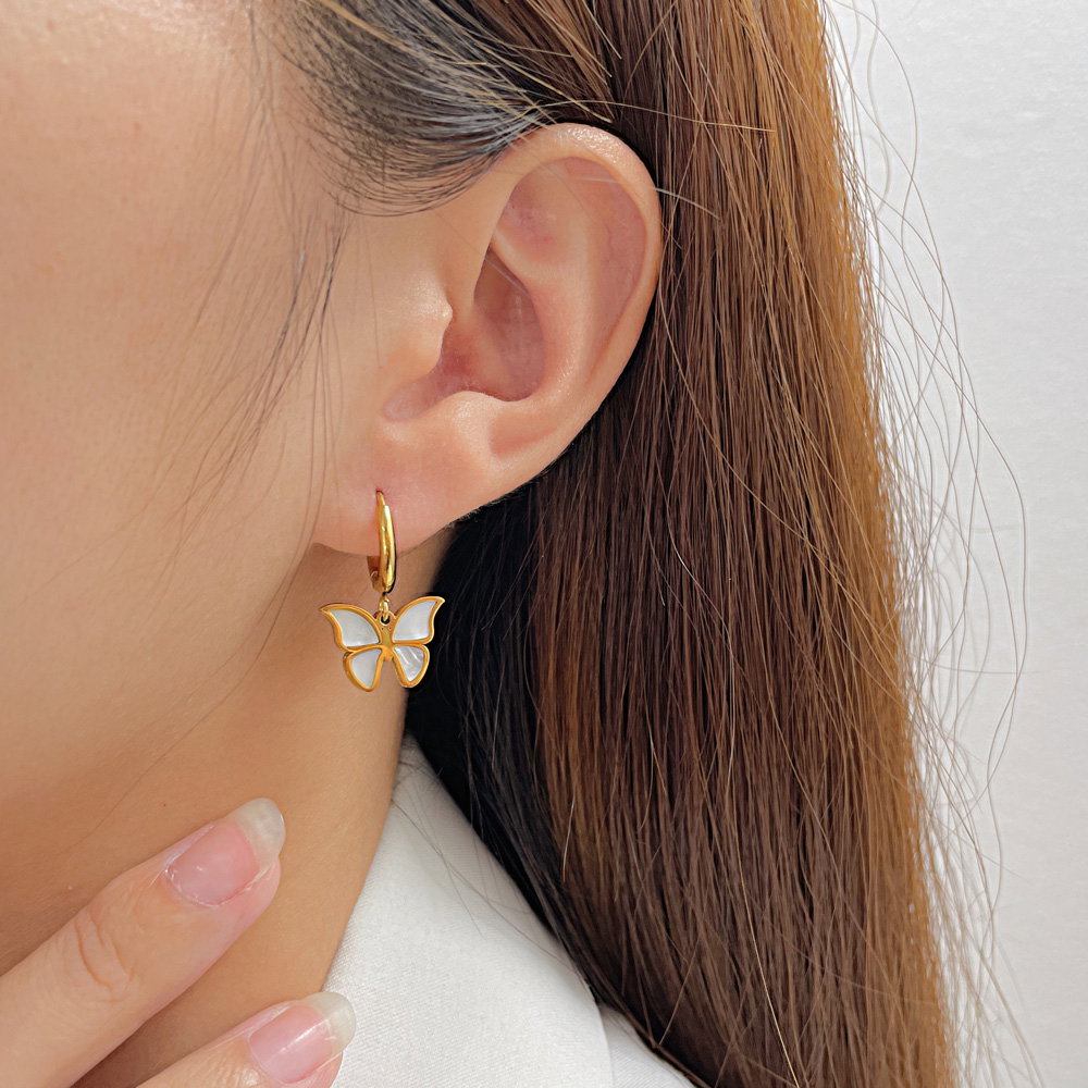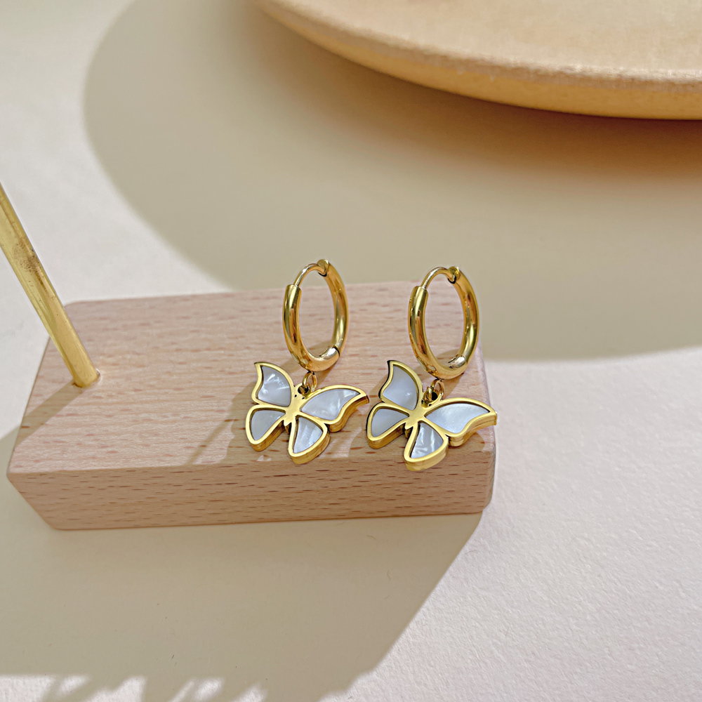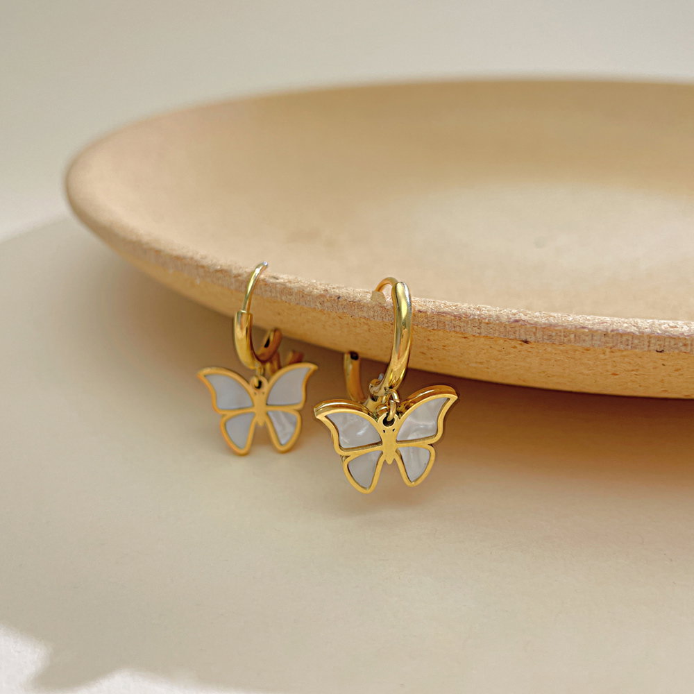 Cercei inox fluturasi cu scoica . Dimensiuni: Latime 15.5 mm, Lungime 25 mm. Material: Inox si Abalone. Culoare: Auriu. Pietre: Abalone.