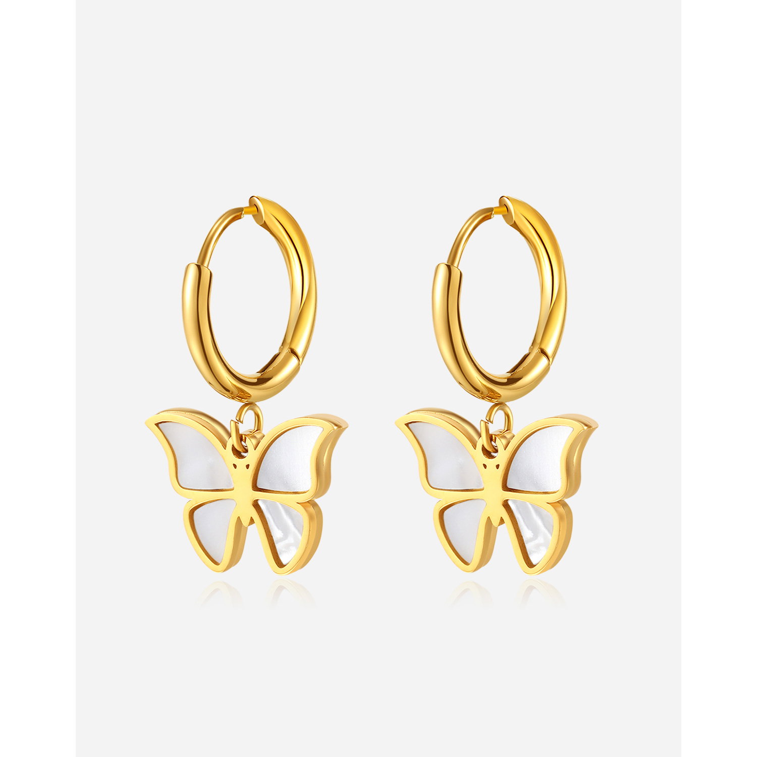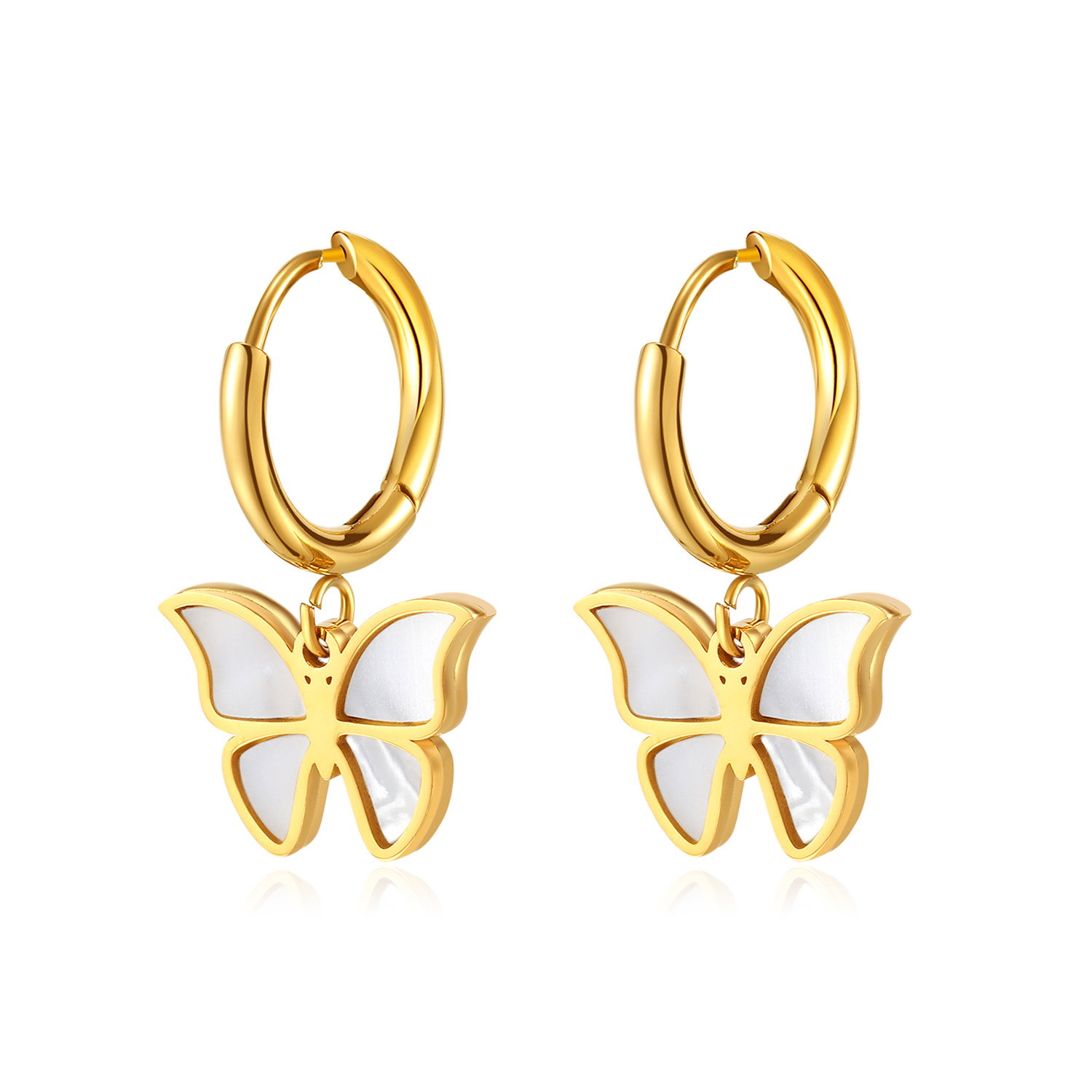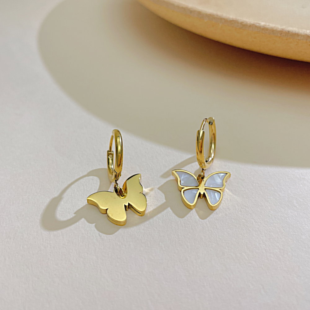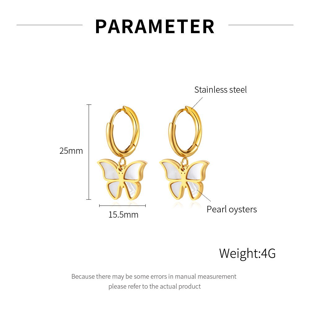 Cercei inox fluturasi cu scoica . Dimensiuni: Latime 15.5 mm, Lungime 25 mm. Material: Inox si Abalone. Culoare: Auriu. Pietre: Abalone.