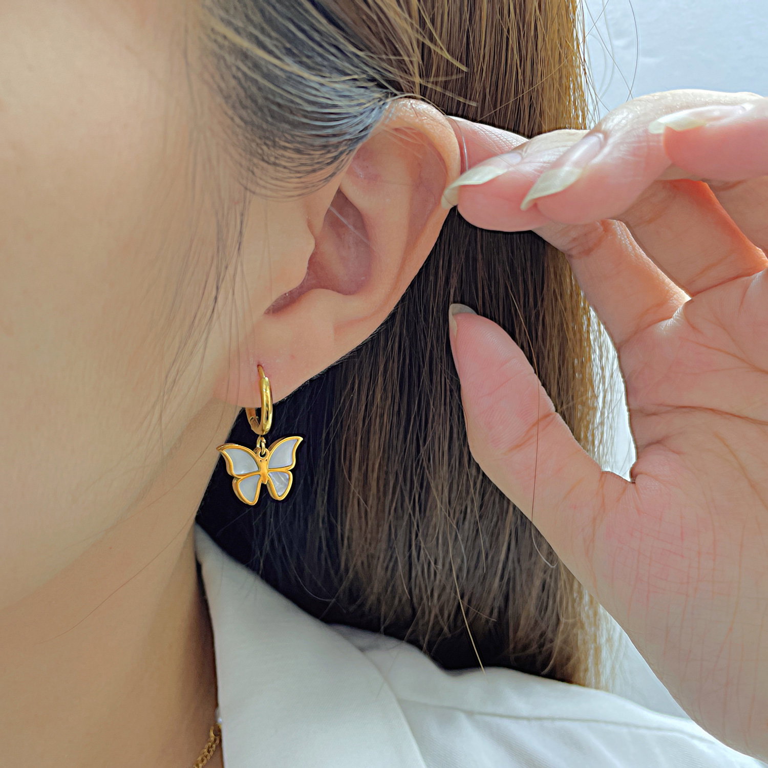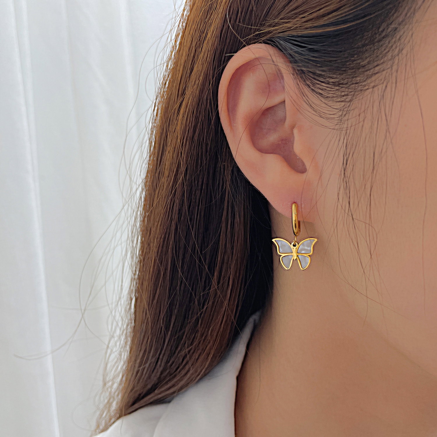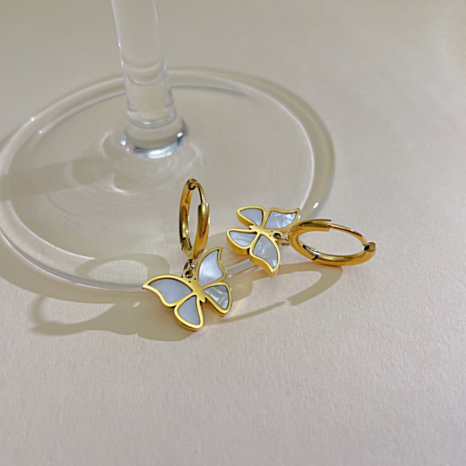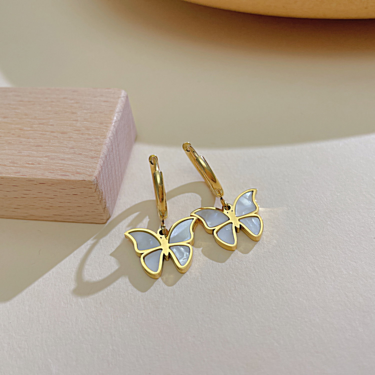 Cercei inox fluturasi cu scoica . Dimensiuni: Latime 15.5 mm, Lungime 25 mm. Material: Inox si Abalone. Culoare: Auriu. Pietre: Abalone.