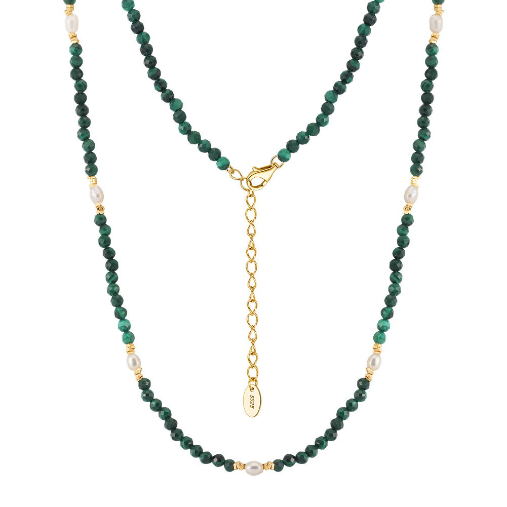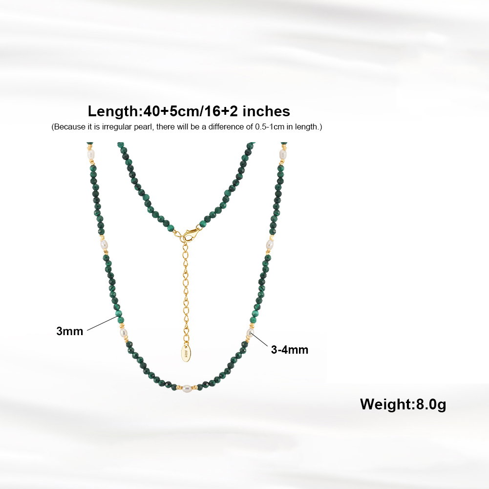 Acest colier rafinat, realizat din argint 925 placat cu aur de 14K, imbina eleganta perlelor naturale de cultura cu stralucirea malachitului. Fiecare detaliu este o poveste in sine, iar combinatia de culori si texturi aduce un strop de magie in orice tinuta. Colierul se remarca prin stralucirea sa de durata, oferind un aspect sofisticat si cald, perfect pentru a sublinia personalitatea ta unica. O alegere inspirata pentru momente speciale sau pentru a adauga un plus de eleganta in fiecare zi.