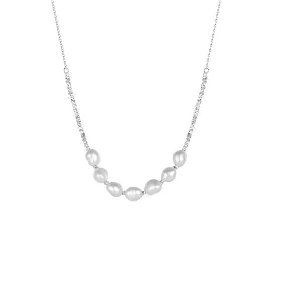 Acest colier din argint 925 placat cu rodiu este o expresie a elegantei subtile, imbinand stralucirea perlelor naturale cu rafinamentul metalului pretios. Fiecare perluta, cu forma sa delicata, povesteste o istorie de frumusete si autenticitate, aducand un strop de lumina in orice tinuta. Designul sau minimalist permite ca perlele sa straluceasca, oferind o nota de sofisticare si feminitate. Ideal pentru ocazii speciale sau pentru a adauga un accent de eleganta in fiecare zi, acest colier devine rapid un accesoriu esential in colectia ta.