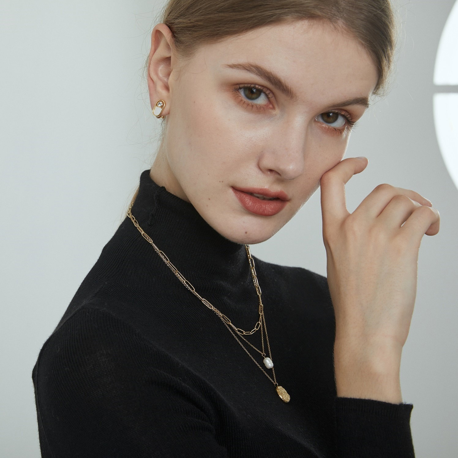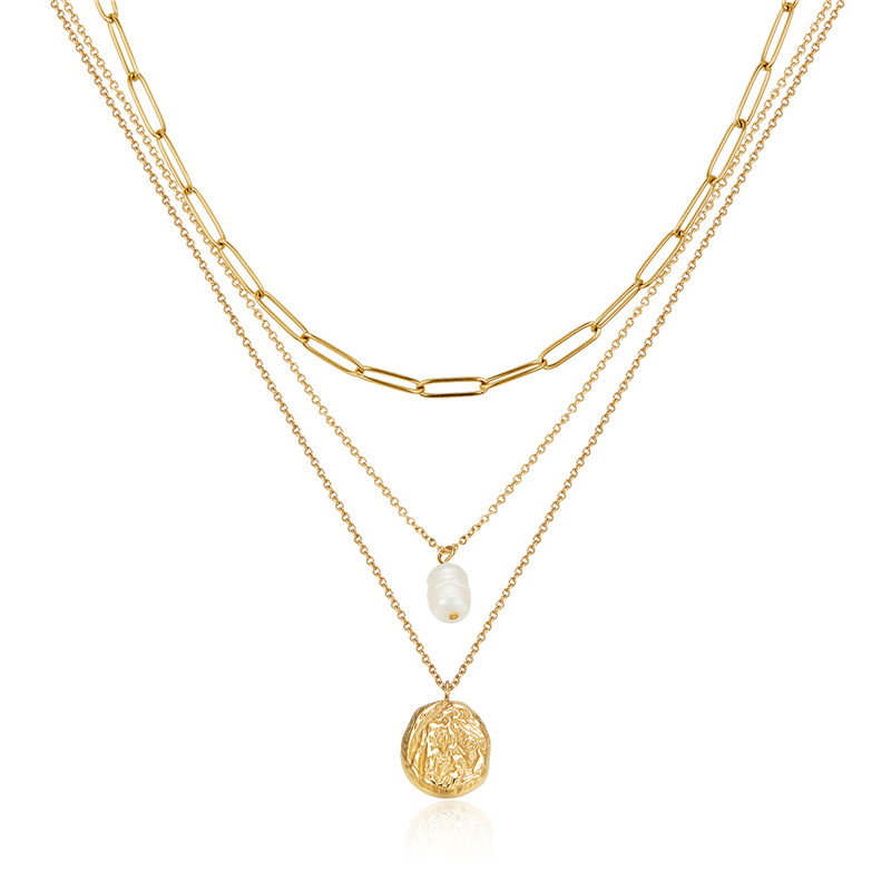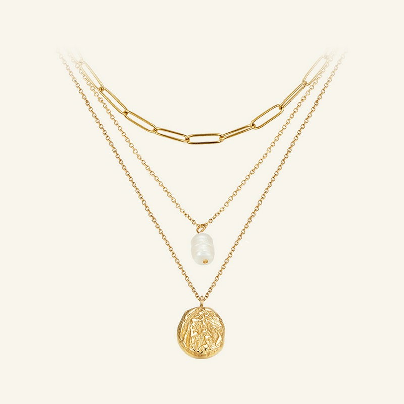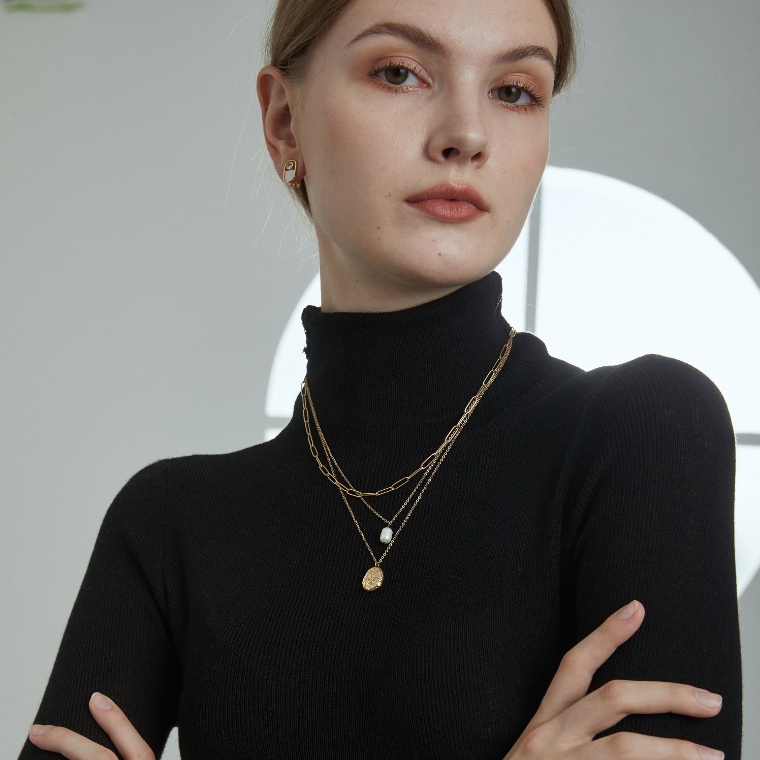 Colierul triplu din argint 925 placat cu aur aduce un plus de eleganță discretă, perfect pentru femeia care apreciază bijuteriile fine, dar cu impact vizual. Cele trei lanțuri delicate se suprapun armonios, oferind un efect stratificat subtil, în timp ce perla naturală albă si pandantivul masiv adaugă o notă de rafinament clasic.