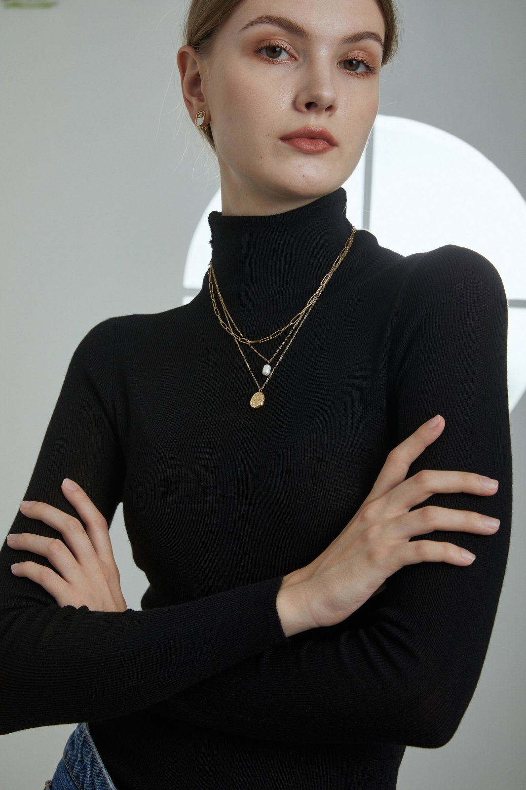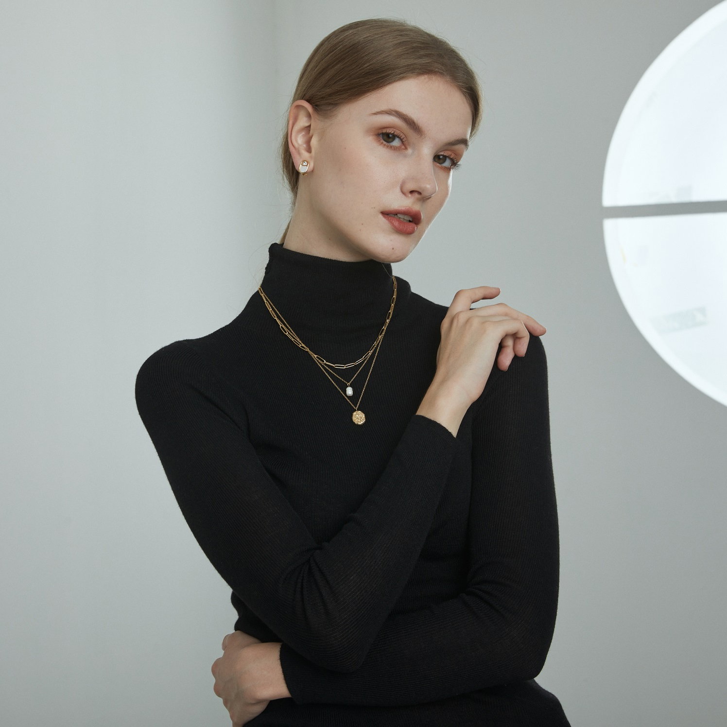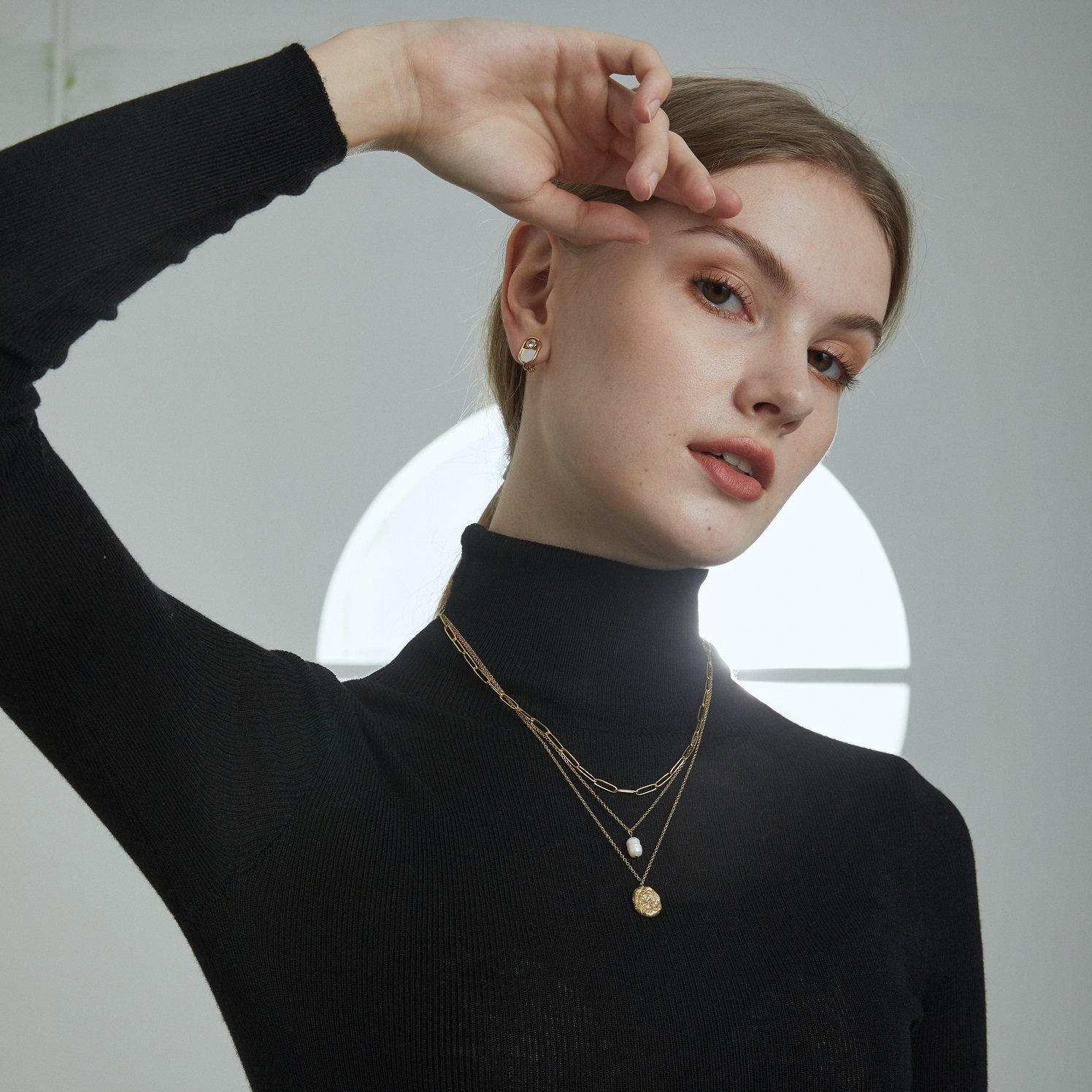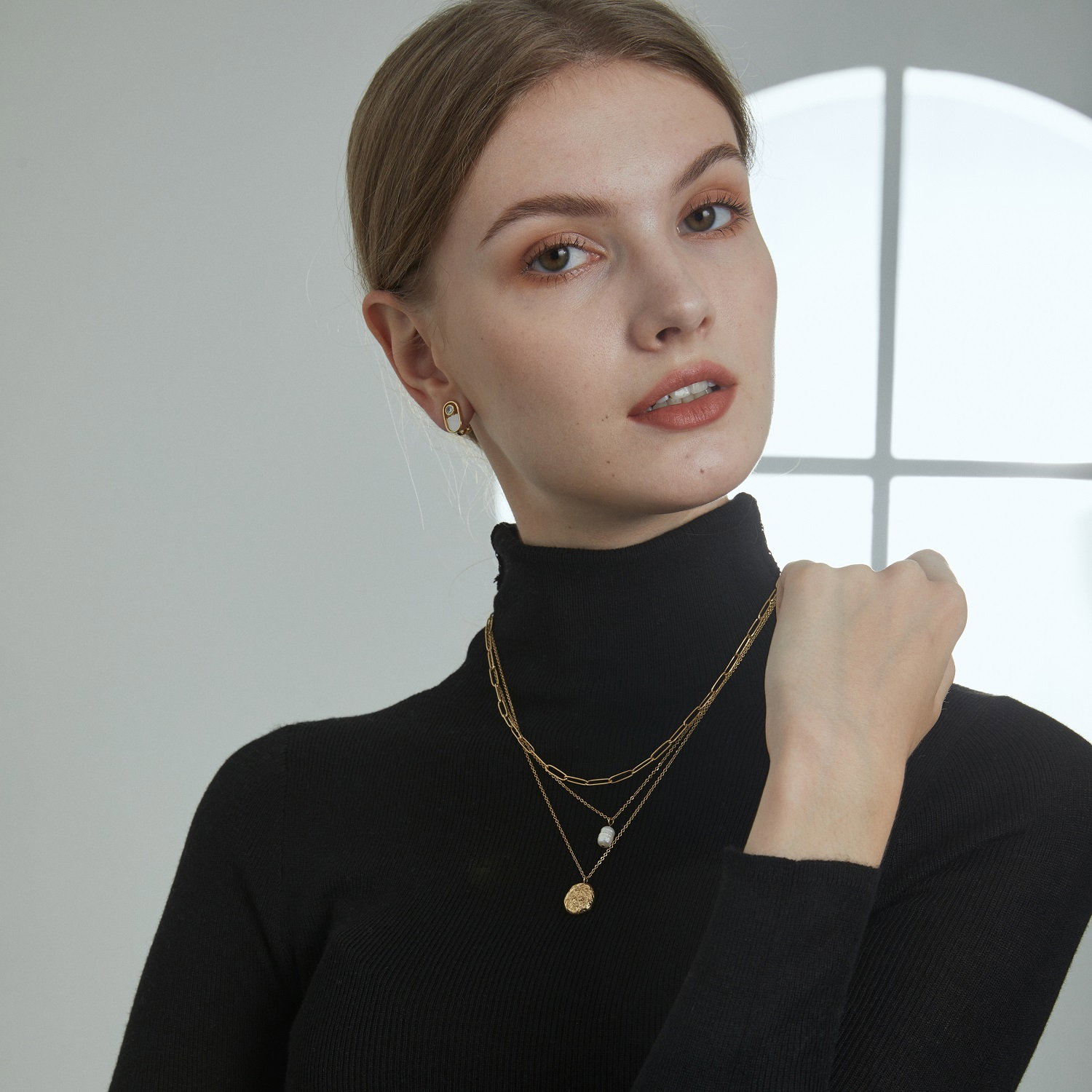 Colierul triplu din argint 925 placat cu aur aduce un plus de eleganță discretă, perfect pentru femeia care apreciază bijuteriile fine, dar cu impact vizual. Cele trei lanțuri delicate se suprapun armonios, oferind un efect stratificat subtil, în timp ce perla naturală albă si pandantivul masiv adaugă o notă de rafinament clasic.