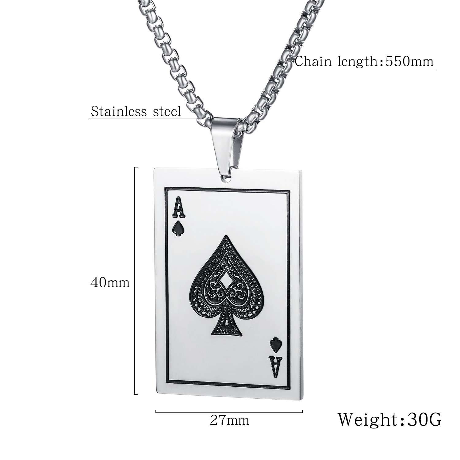 Colier inox As de Pică – Simbol al Norocului și Puterii Mentale. Dimensiuni: Pandantiv: Latime 27 mm, Inaltime 40 mm, Lant: Lungime 55 cm, Grosime 3 mm. Culoare: Argintiu. Materiale: Inox.
