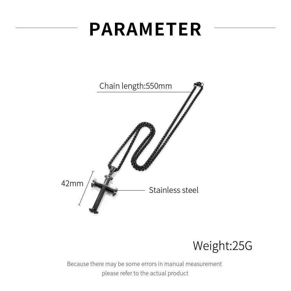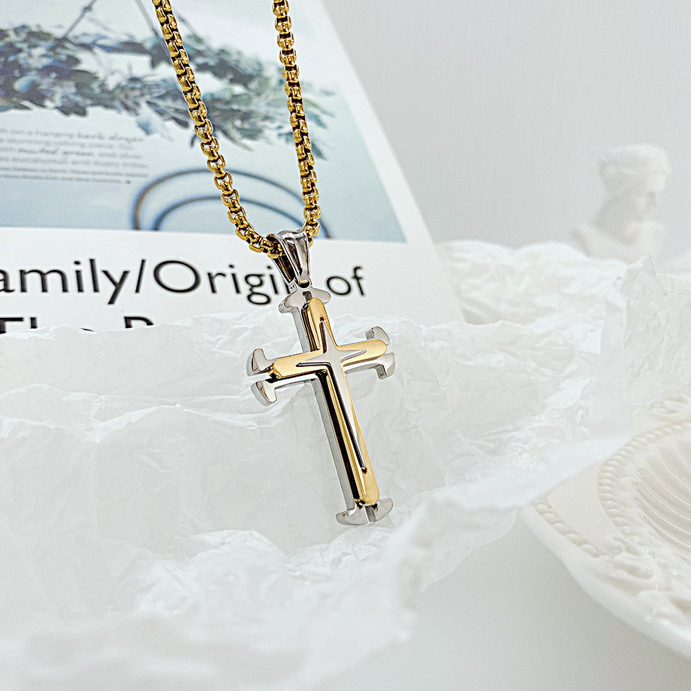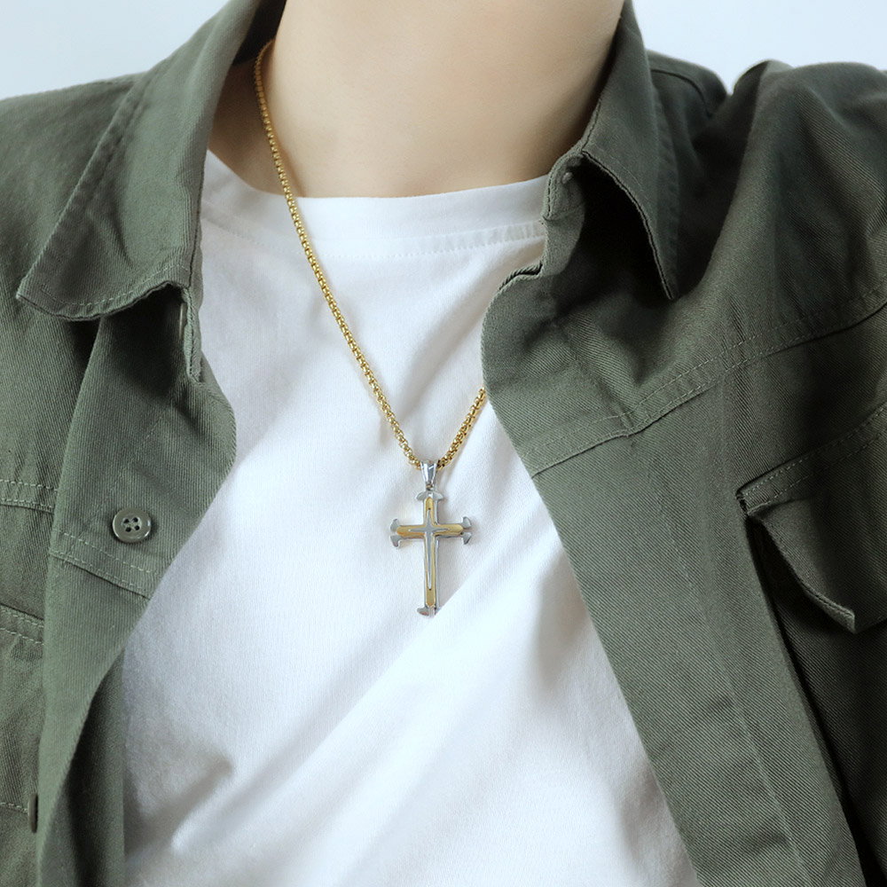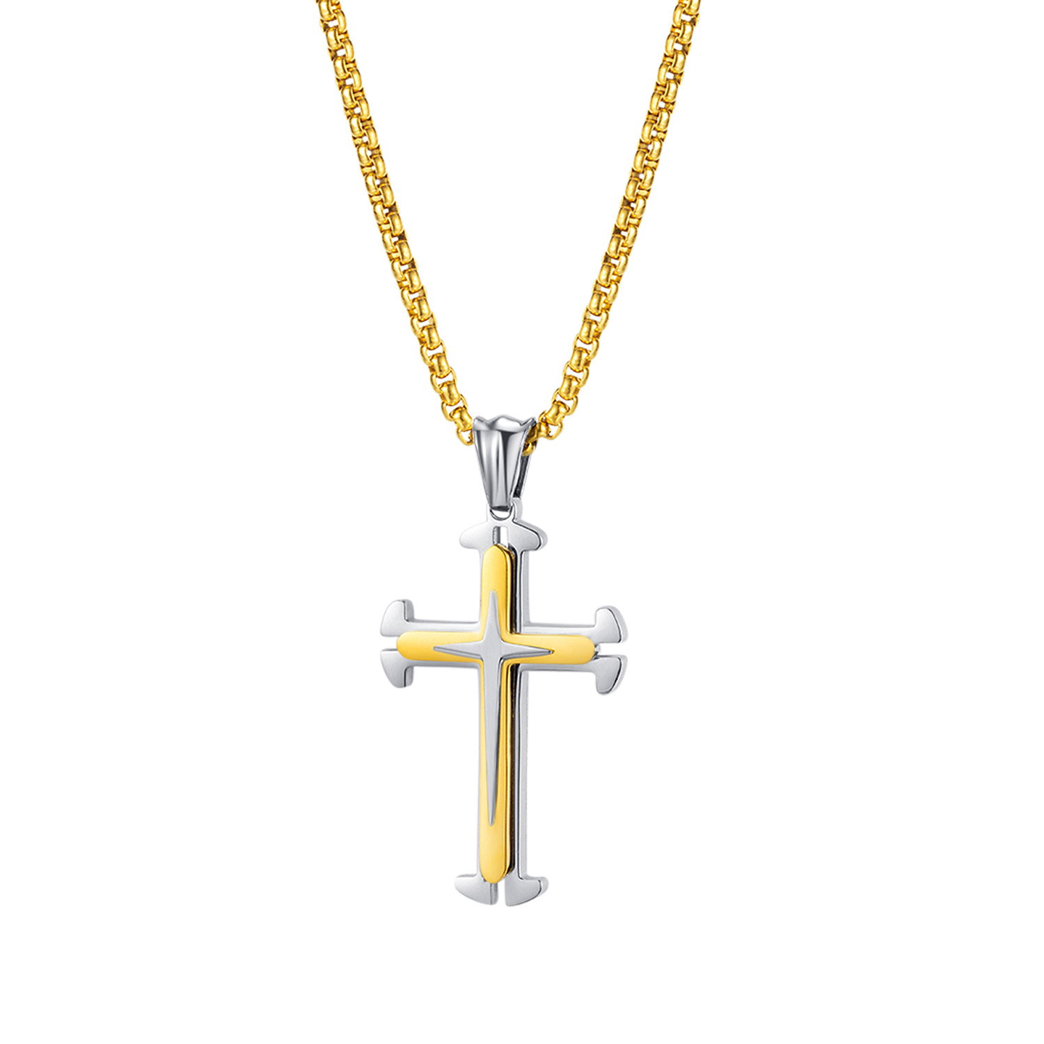Colier inox cruce. Dimensiuni lant: Lungime 55 cm, Grosime 3 mm. Culoare: Auriu. Dimensiuni pandantiv: Inaltime 42 mm (vezi schita in poze produs)