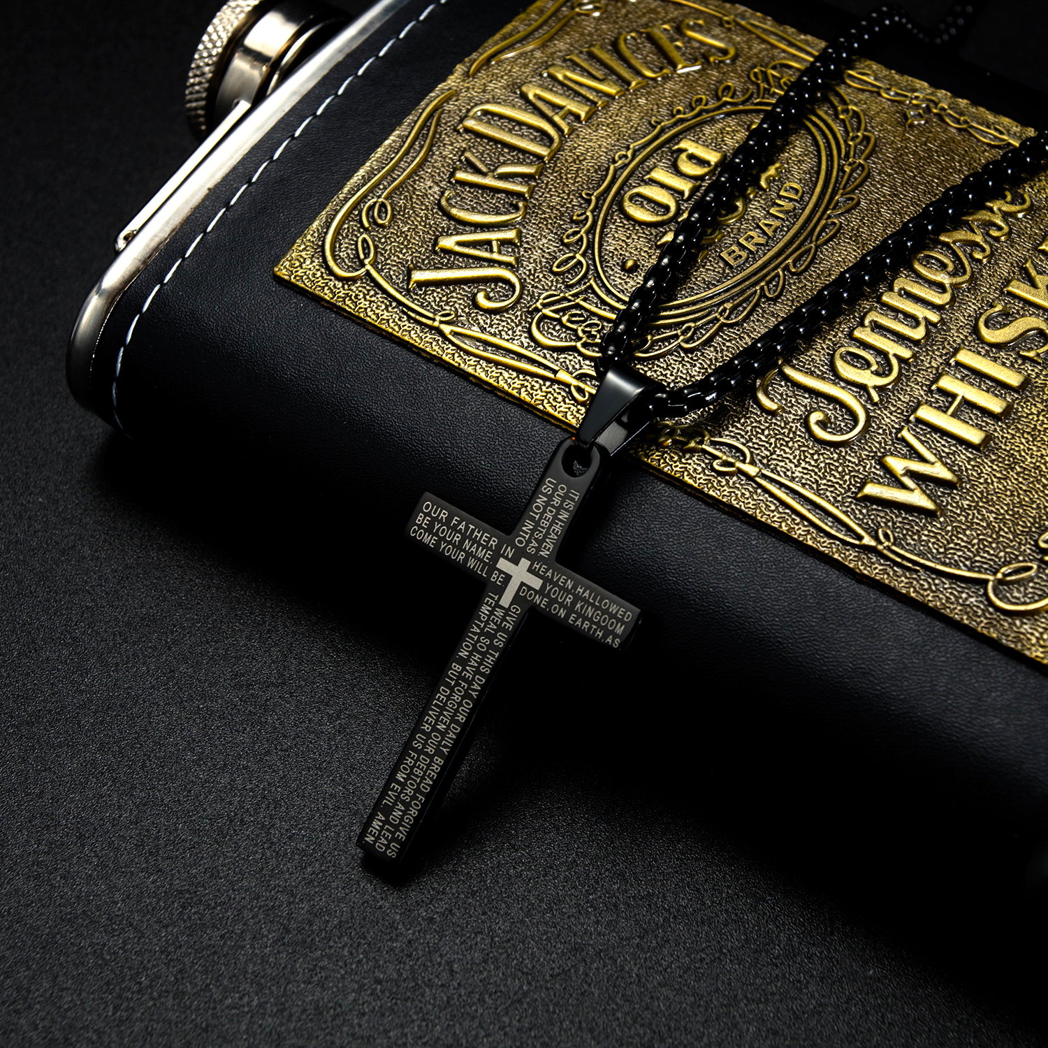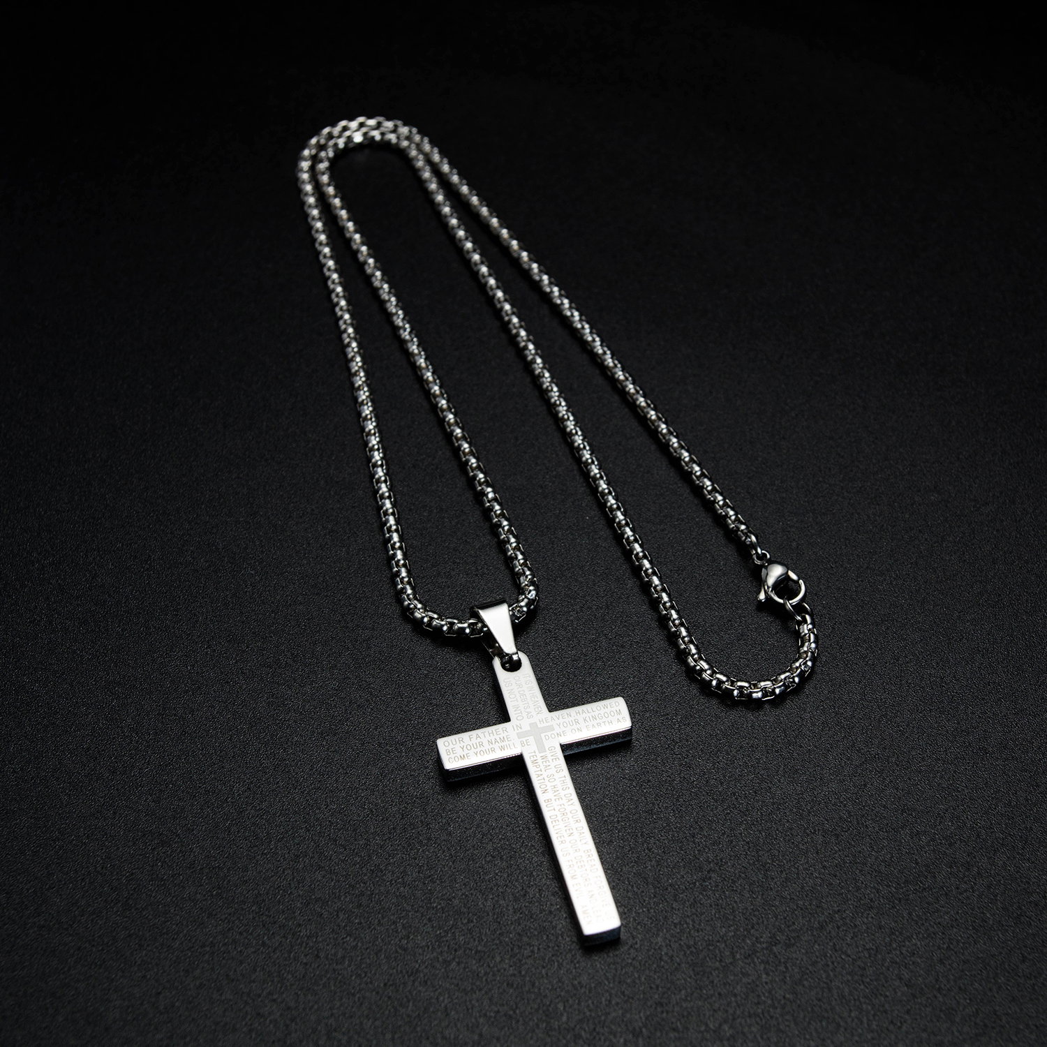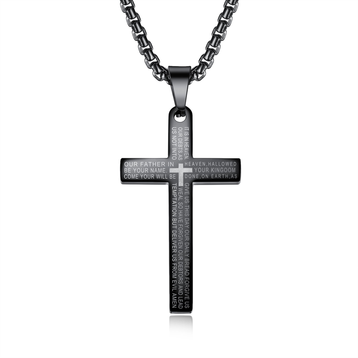 Colier inox cruce cu Tatal Nostru. Dimensiuni lant: Lungime 55 cm, Grosime 3 mm. Culoare: Negru. Dimensiuni pandantiv: vezi schita in poze produs.