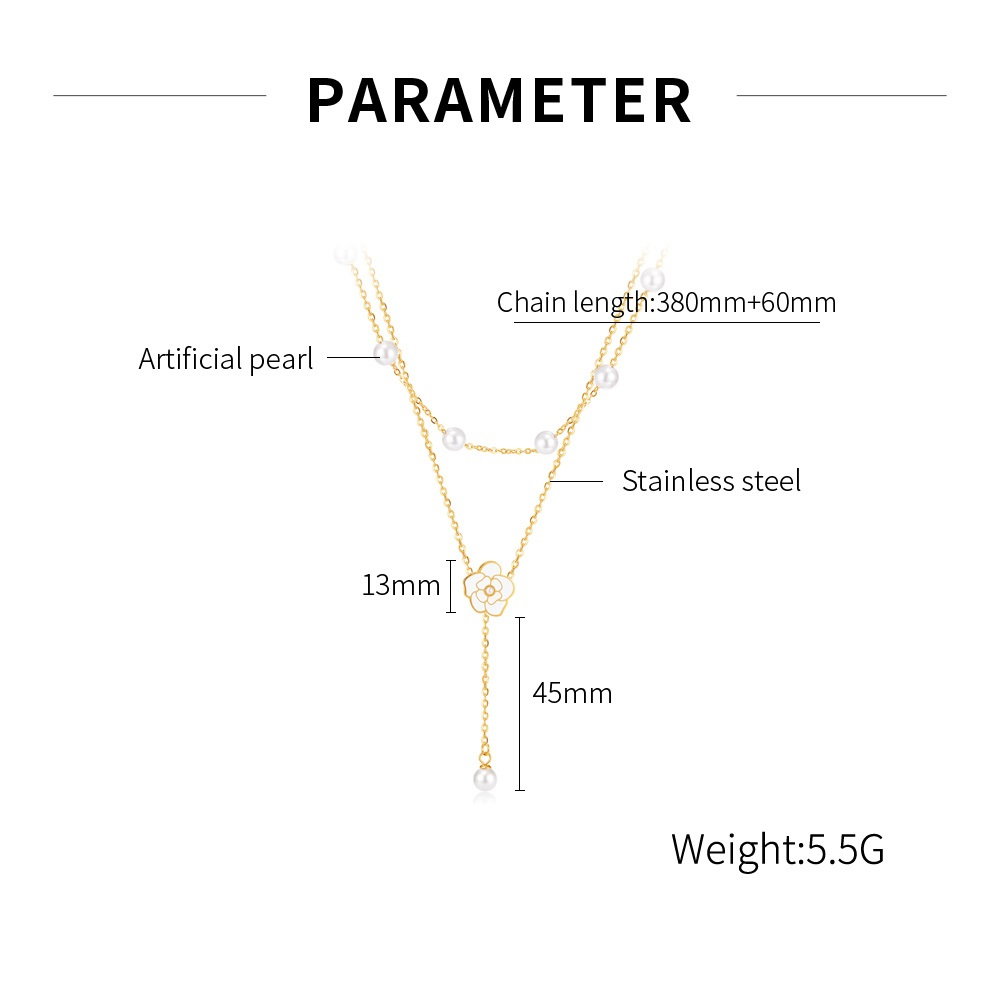 Colier inox dublu cu perle si floare. Dimensiuni: Pandantiv: 13 mm, Lant: 38 + 6 cm. Material: Inox si Perle sintetice. Culoare: Auriu. Pietre: Perle.
