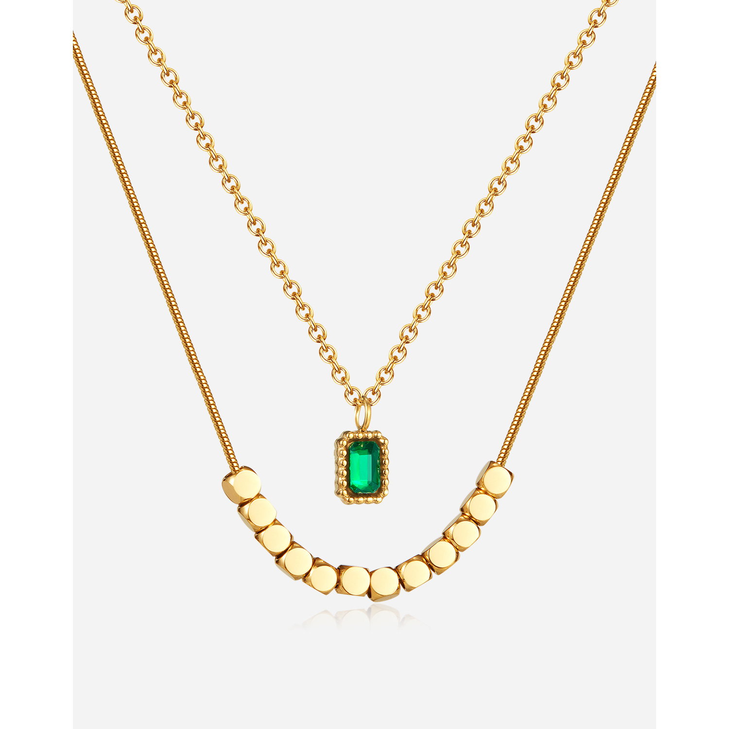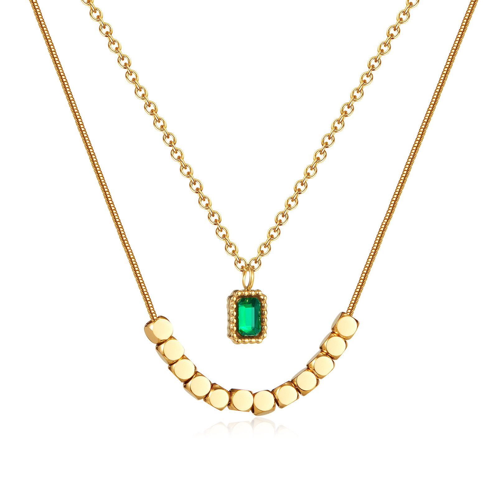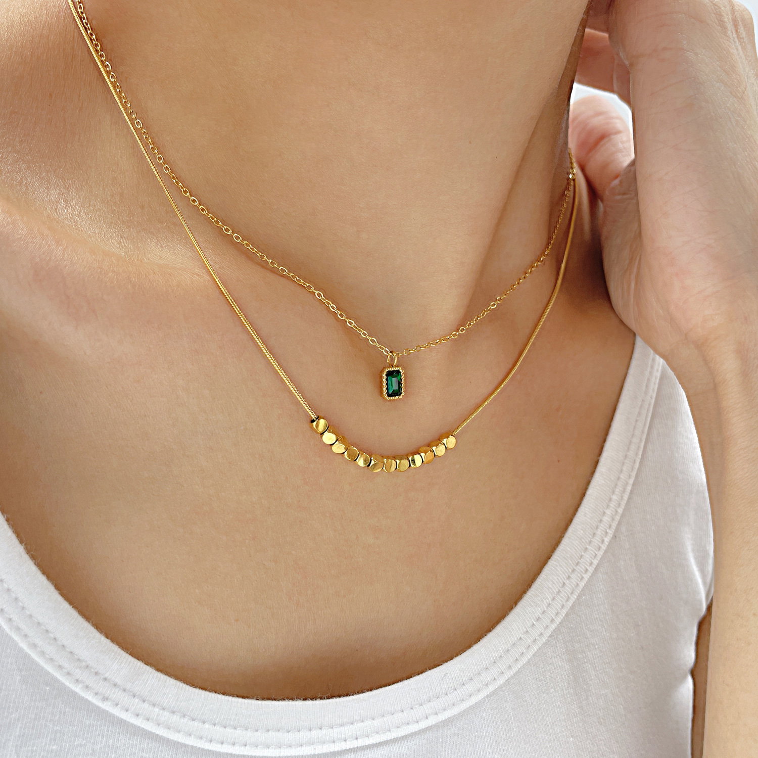 Colier inox dublu cu zirconiu si pandantive cubice. Dimensiuni: Pandantiv: Mare 7 mm, Mic 3 mm, Lant: 39 + 6 cm. Material: Inox si Zirconiu. Culoare: Verde. Pietre: Zirconiu.